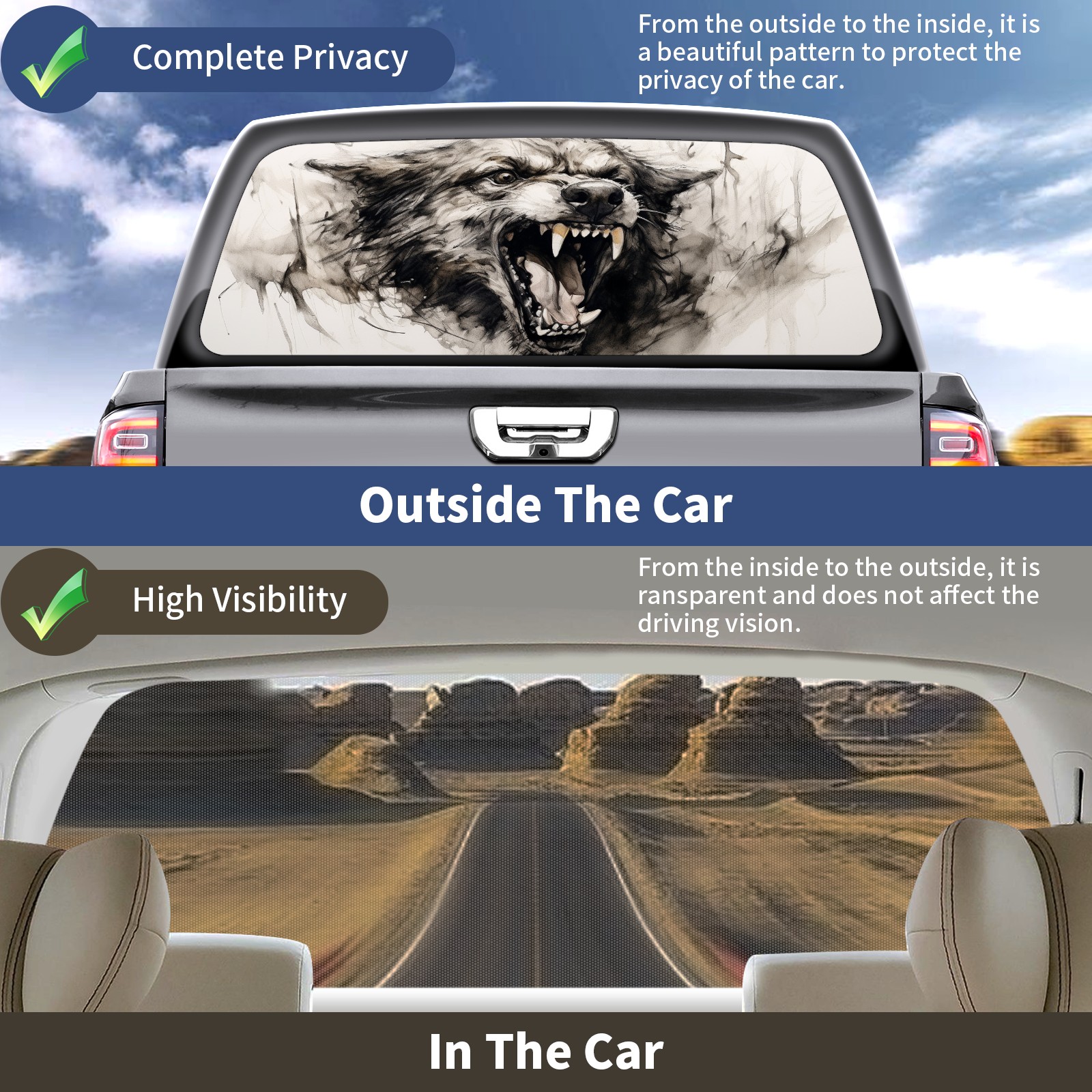 • <b>One-Way Light Transmission Window Film Protect Your Privacy While Allowing You To Enjoy The Scenery Outside Your Window!</b> <br> <b>●Decals Instructions Usage--Teach You To Use Quickly</b> <br> 1.Clean the window galss thoroughly <br> 2.Use a Squeegee or other card to scrape off the remaining water and bumps(don't use too much force) <br> 3.Remove the film's back cover .Use a knife to cut out a suitable contour and wipe off the remaining water(you can also use a hair dryer to blow dry) <br> 4.Find a suitable location and stick a sticker <br> <b>●Unique Design</b> <br> ZXIVGOQFR Back window stickers ‘s smart looking and unique cute design makes your vehicle special under sunshine. Makes your car easy to identify, perfect for finding your car in crowded parking lots and garages.funny visor reflects personality and attitude. <br> <b>●Perfect Gift for all Drivers<br></b> We create all the gifts and accessories you only need to choose what you like. Get full tailgate wraps, rear window decals, and everything you need to make your pickup truck look awesome. <br> <b>Decorate Your Pickup Truck With Rear Window Decal Today!</b>