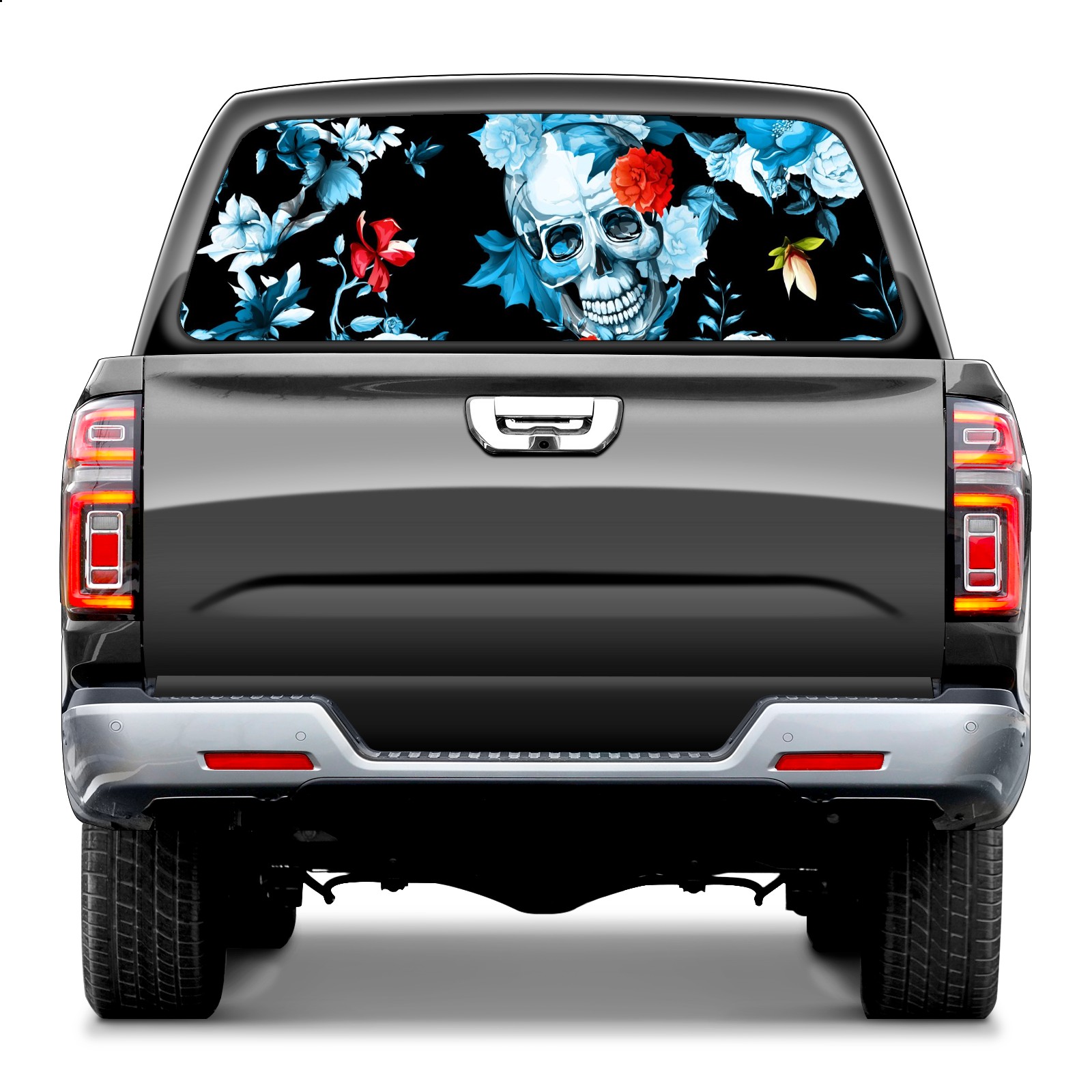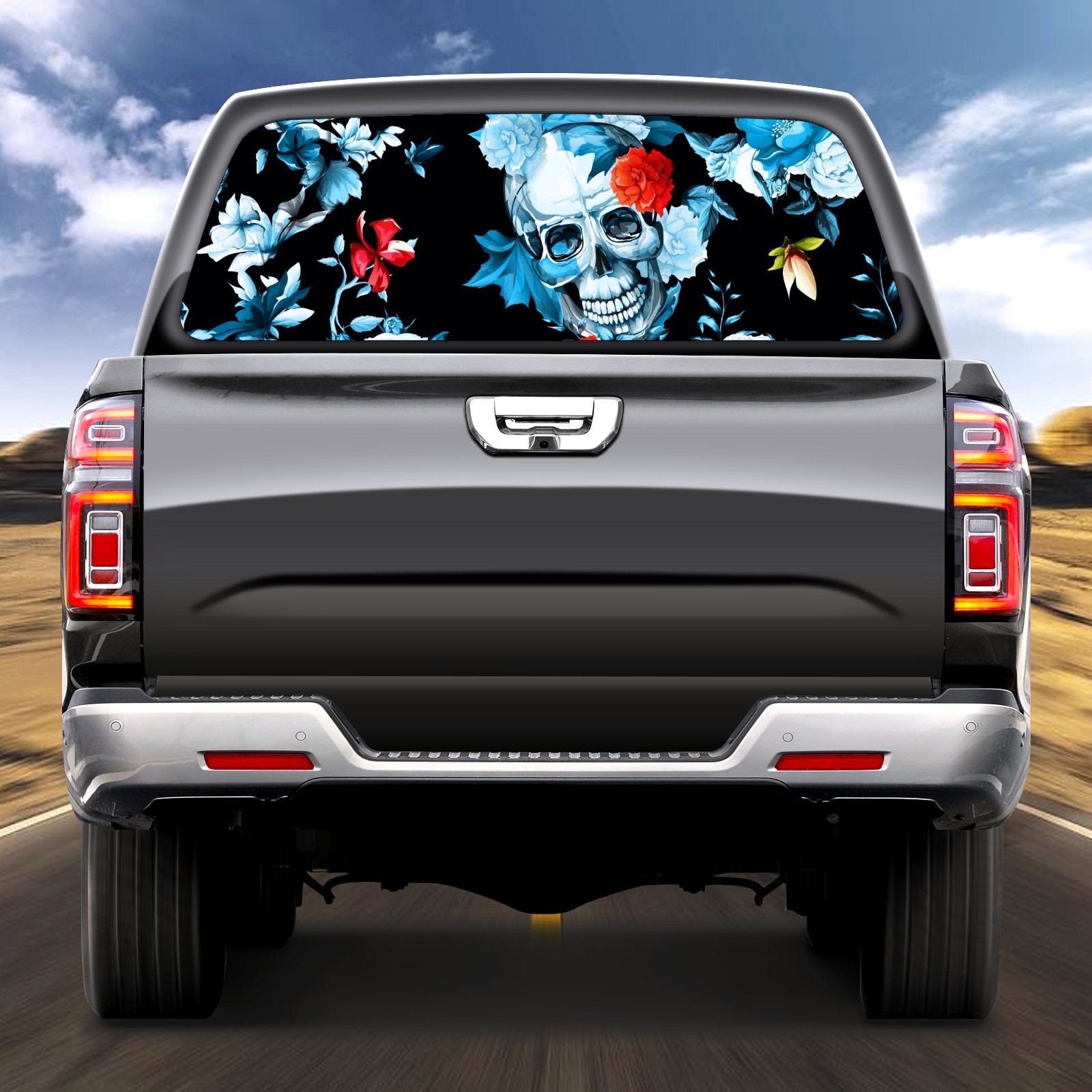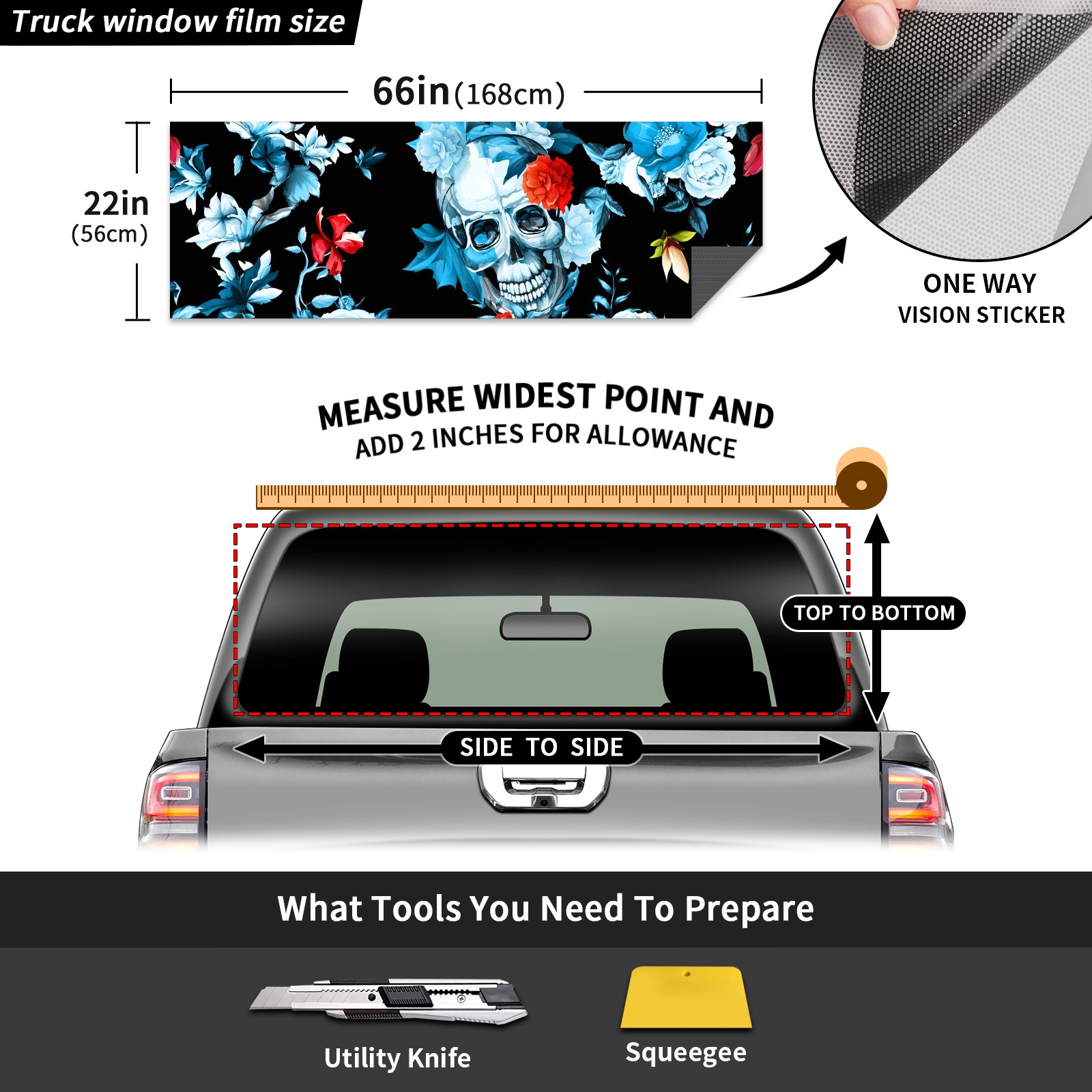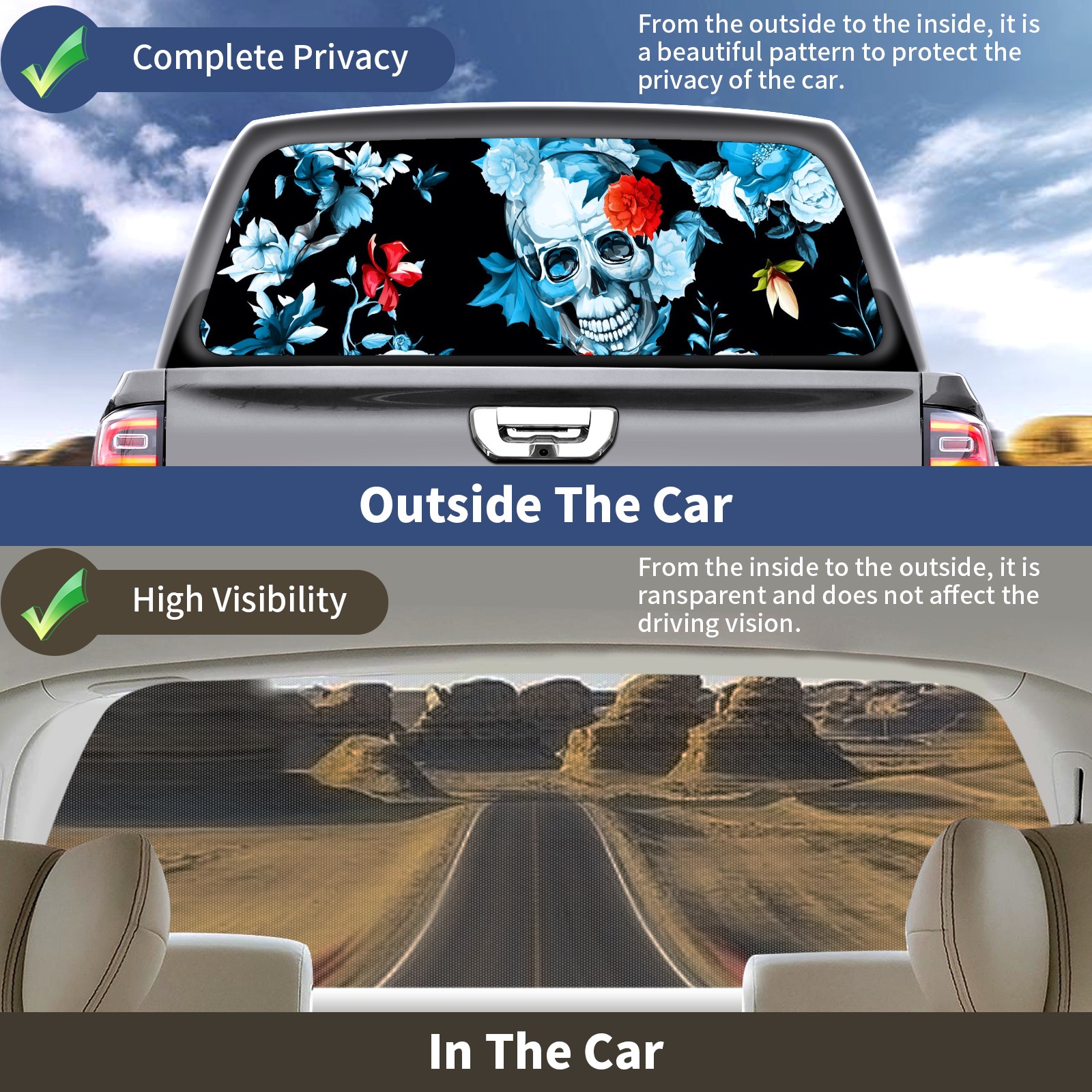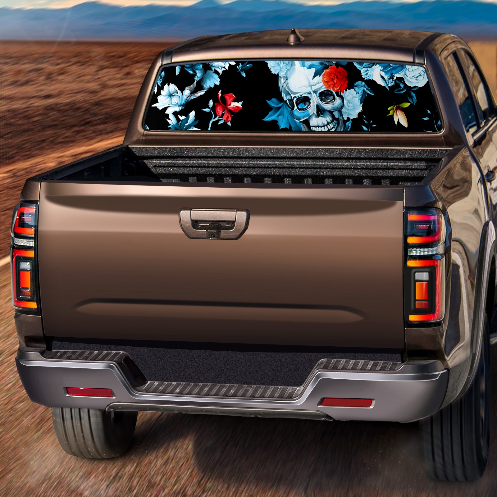 Truck Rear Window Graphics Decals Pickup Trucks Back Window Sticker Full Window Film Decal One Way Visual Waterproof Car Rear Tint Vintage Skull Flowers Roses Peonies