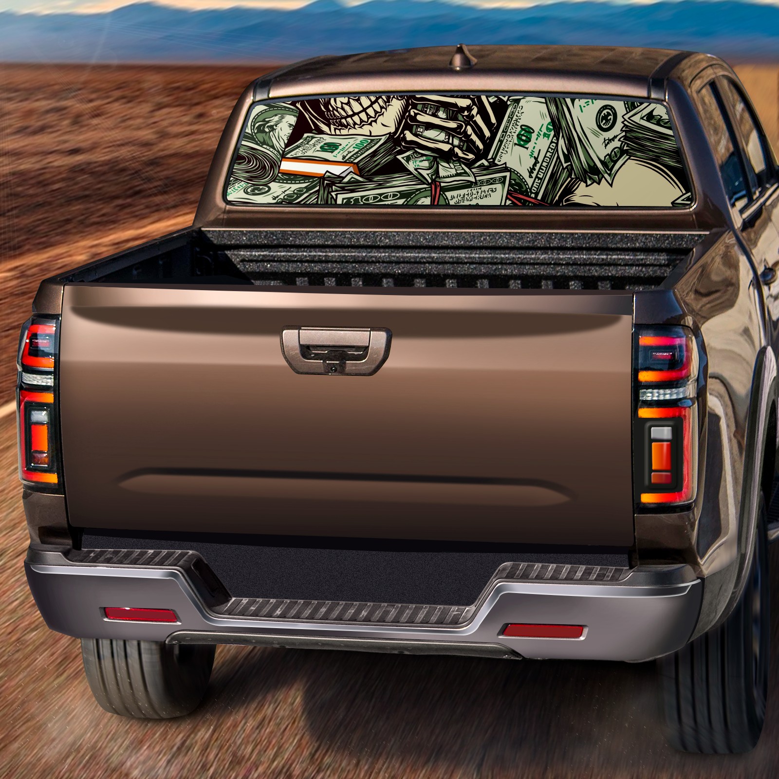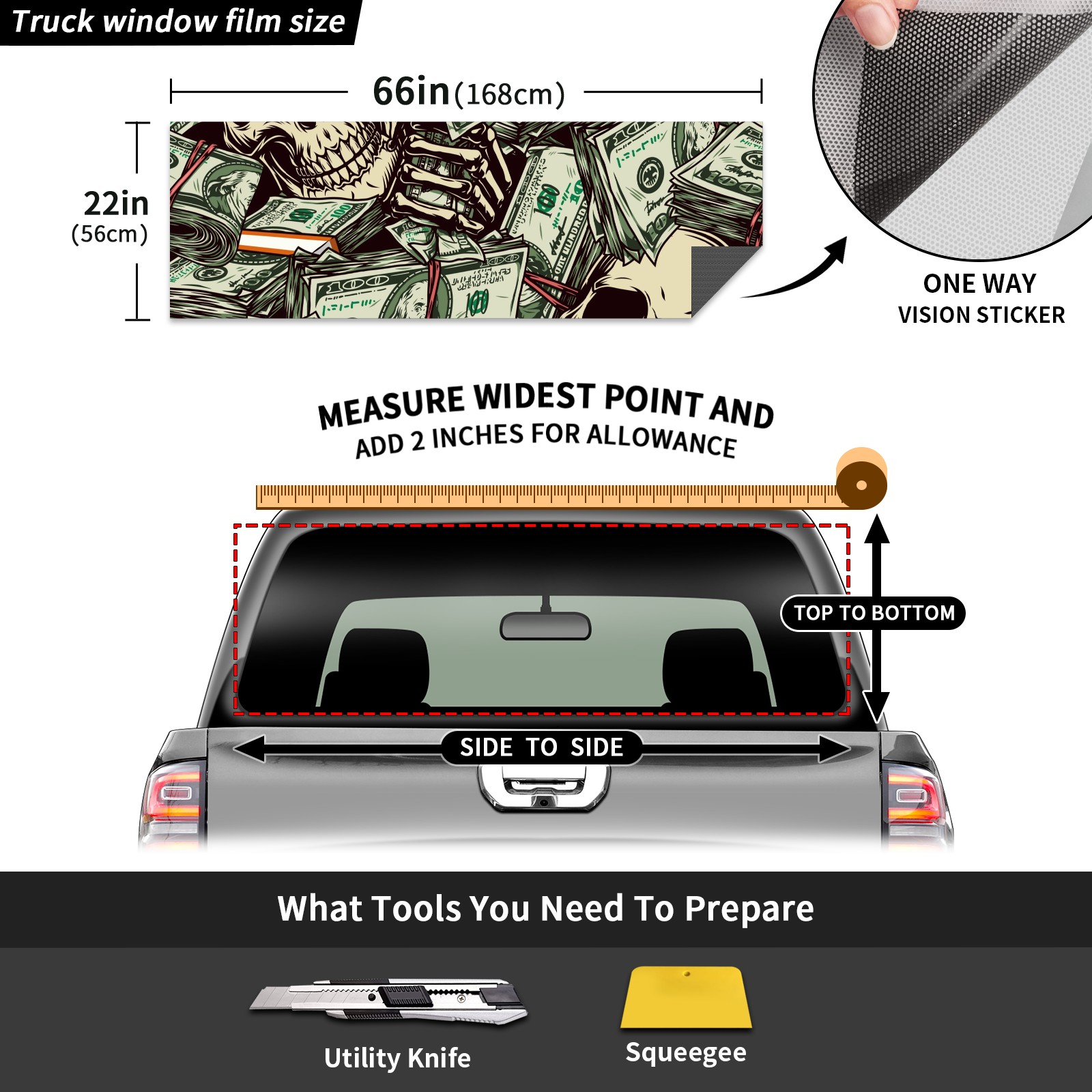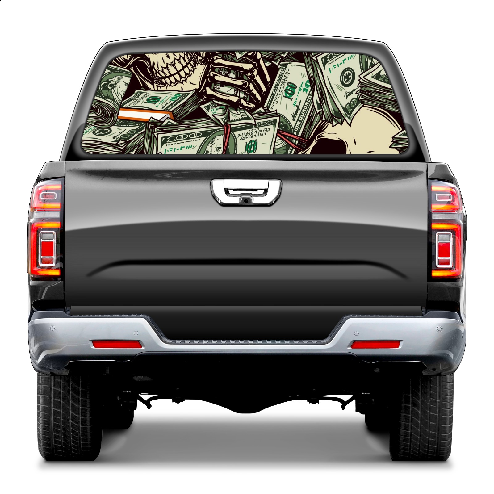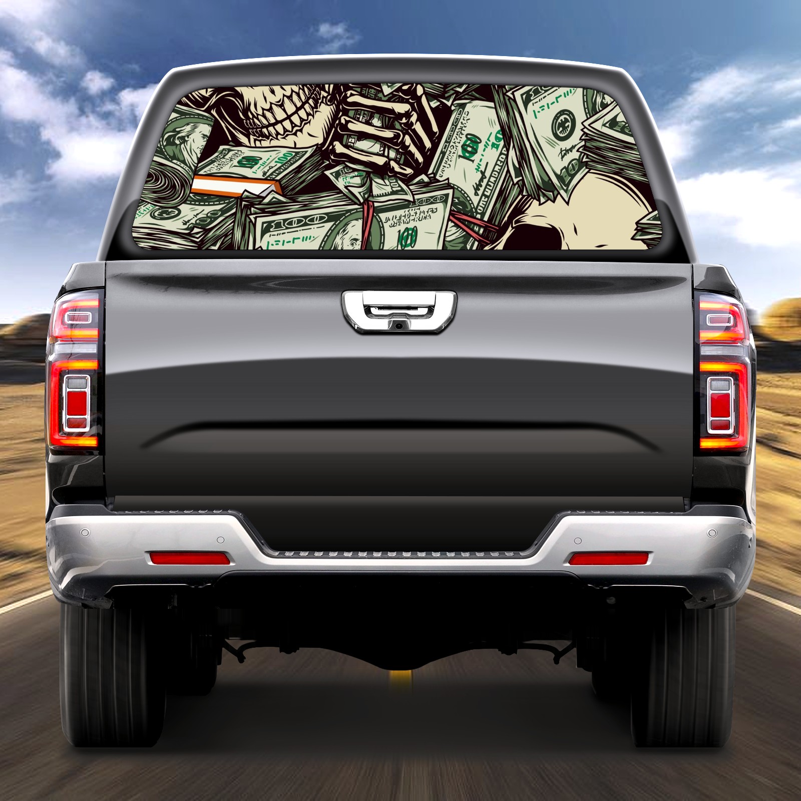 Truck Rear Window Graphics Decals Pickup Trucks Back Window Sticker Full Window Film Decal One Way Visual Waterproof Car Rear Tint Vintage Money Skull Skeleton