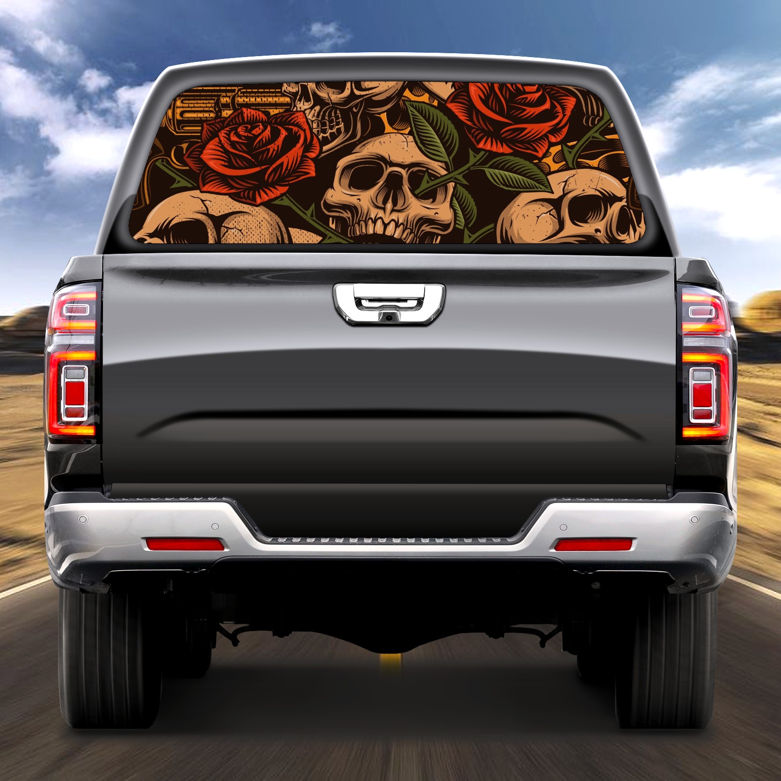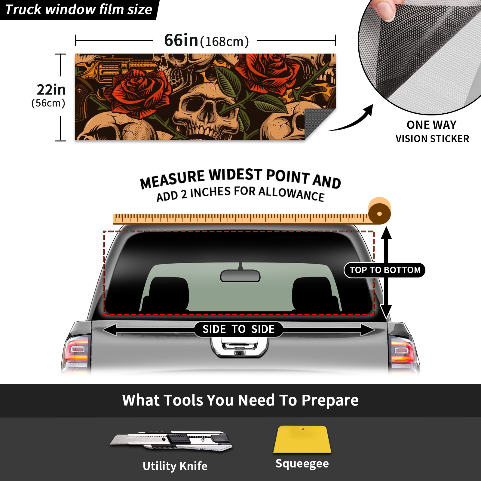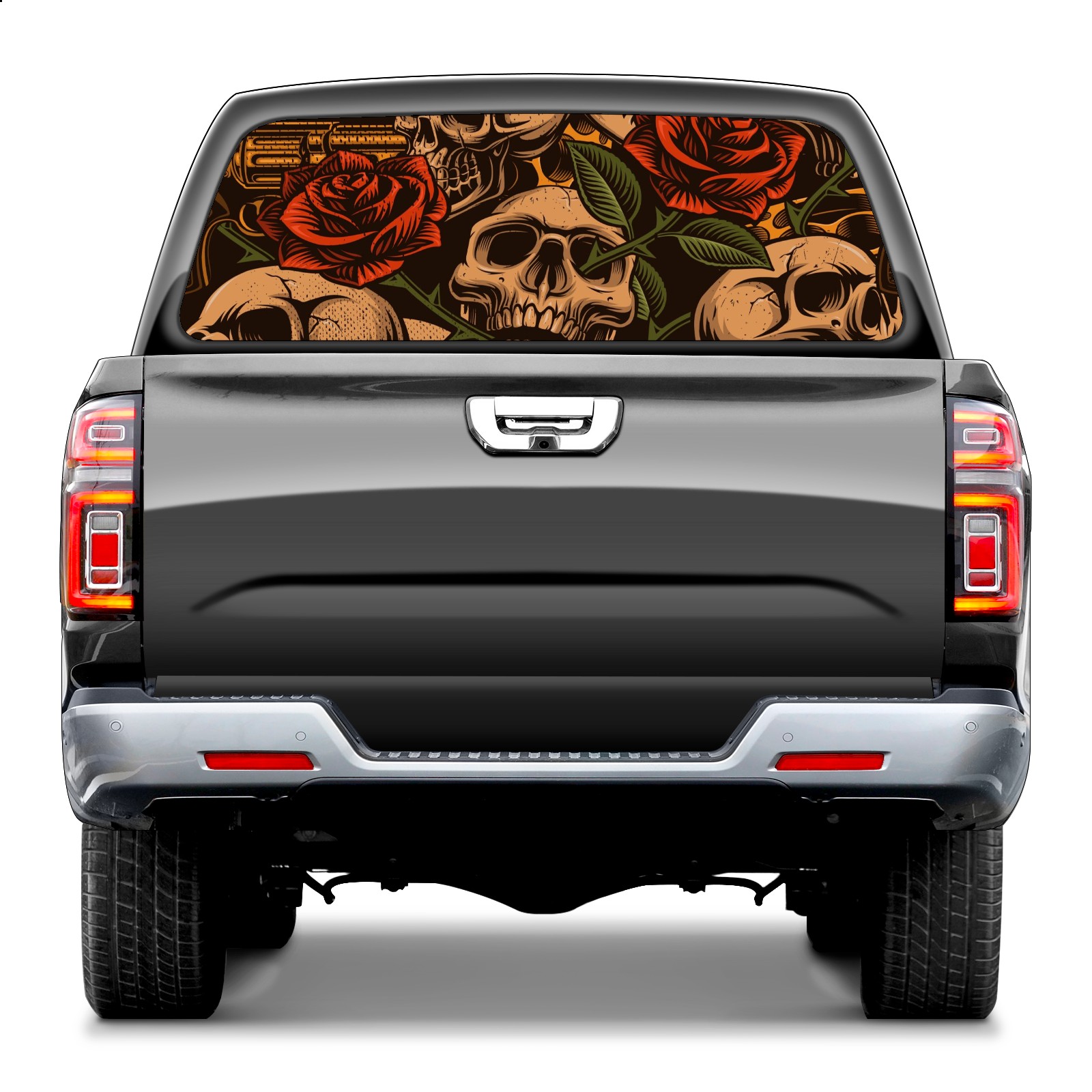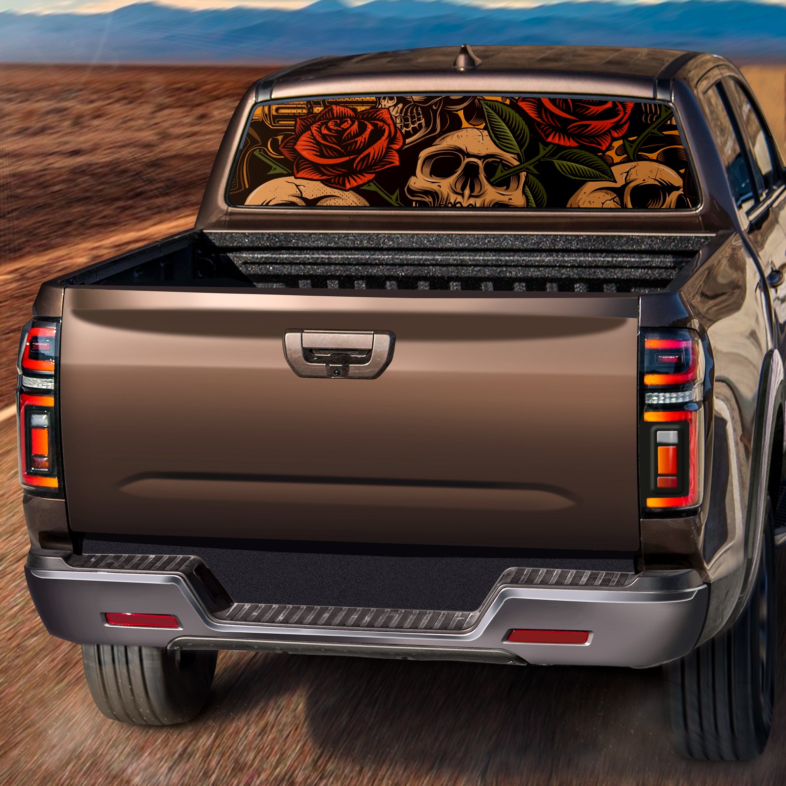 Truck Rear Window Graphics Decals Pickup Trucks Back Window Sticker Full Window Film Decal One Way Visual Waterproof Car Rear Tint Skulls With Guns And Roses