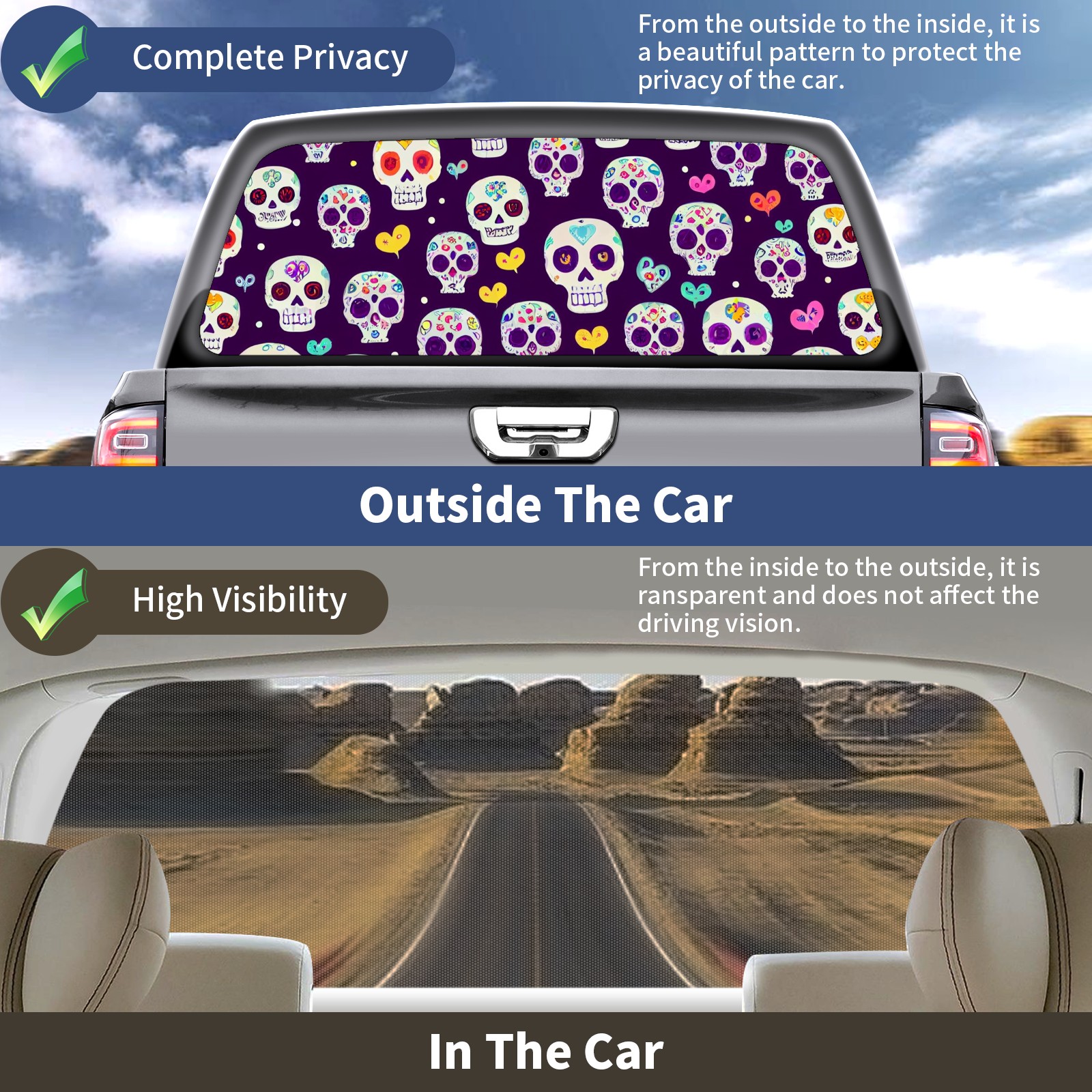 <b>One-Way Light Transmission Window Film Protect Your Privacy While Allowing You To Enjoy The Scenery Outside Your Window!</b> <br> <b>●Decals Instructions Usage--Teach You To Use Quickly</b> <br> 1.Clean the window galss thoroughly <br> 2.Use a Squeegee or other card to scrape off the remaining water and bumps(don't use too much force) <br> 3.Remove the film's back cover .Use a knife to cut out a suitable contour and wipe off the remaining water(you can also use a hair dryer to blow dry) <br> 4.Find a suitable location and stick a sticker <br> <b>●Unique Design</b> <br> ZXIVGOQFR Back window stickers ‘s smart looking and unique cute design makes your vehicle special under sunshine. Makes your car easy to identify, perfect for finding your car in crowded parking lots and garages.funny visor reflects personality and attitude. <br> <b>●Perfect Gift for all Drivers<br></b> We create all the gifts and accessories you only need to choose what you like. Get full tailgate wraps, rear window decals, and everything you need to make your pickup truck look awesome. <br> <b>Decorate Your Pickup Truck With Rear Window Decal Today!</b>
