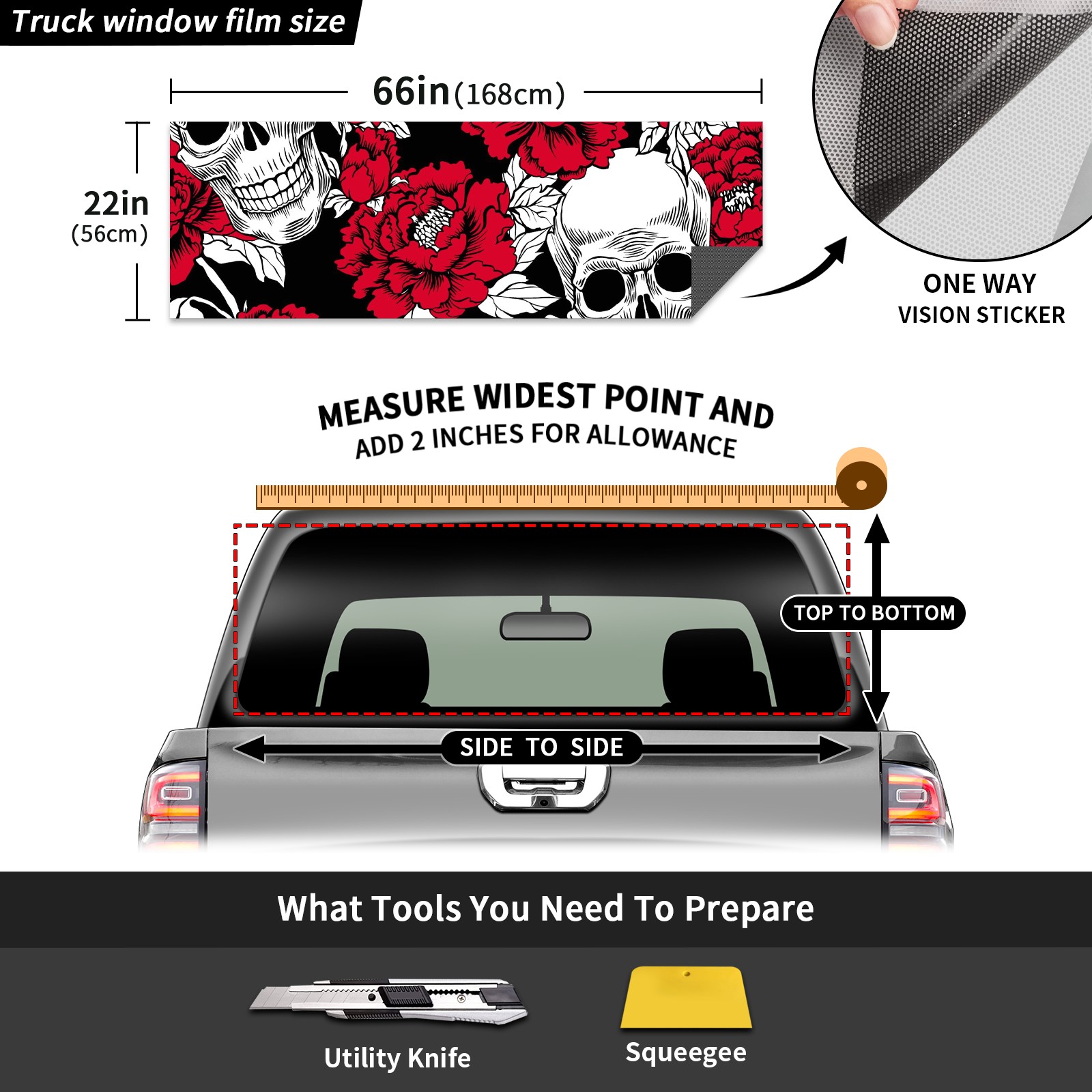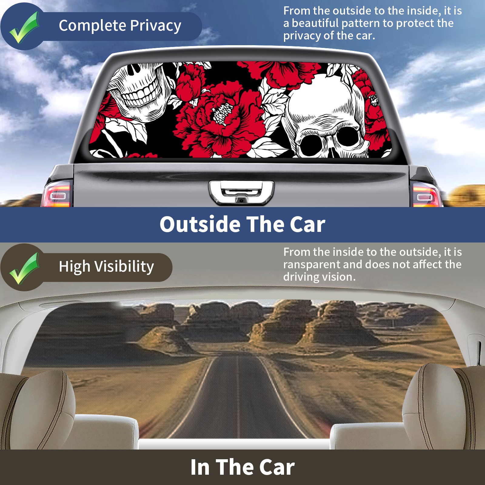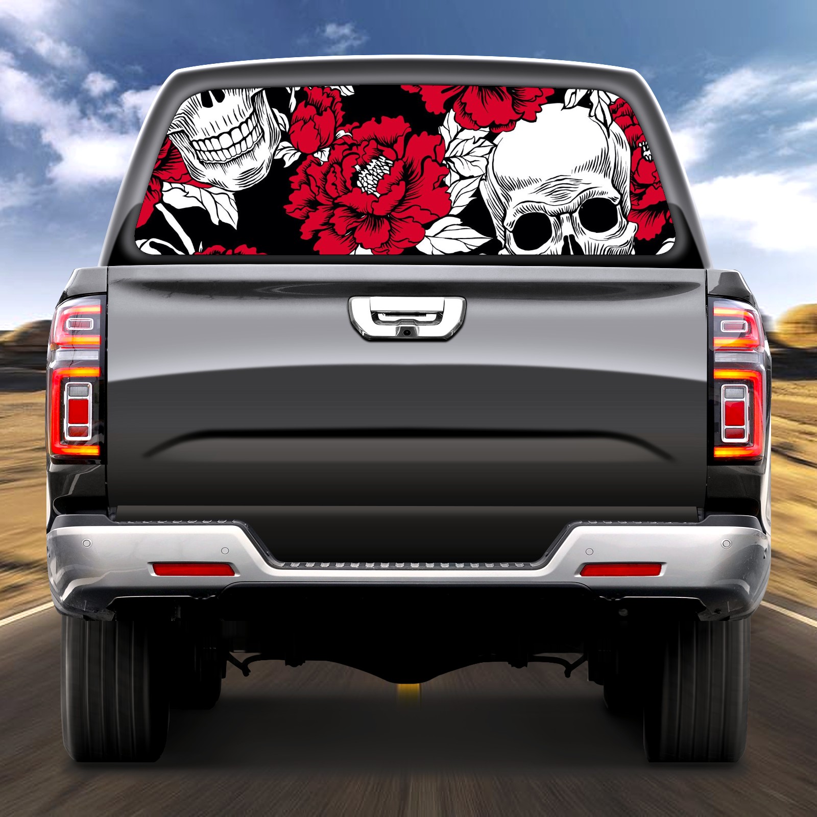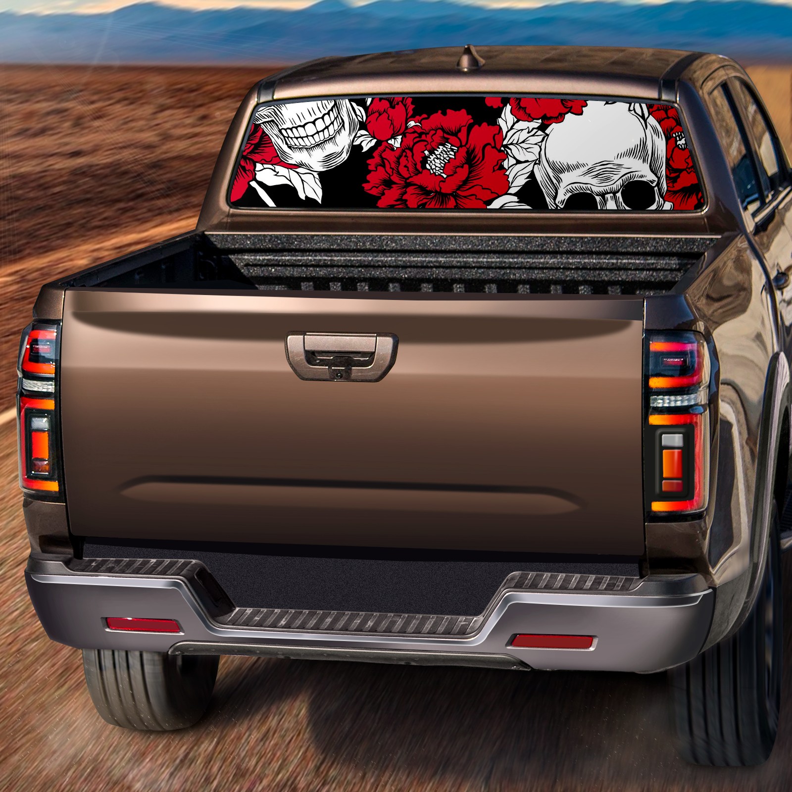 Truck Rear Window Graphics Decals Pickup Trucks Back Window Sticker Full Window Film Decal One Way Visual Waterproof Car Rear Tint Skull And Flower Peony