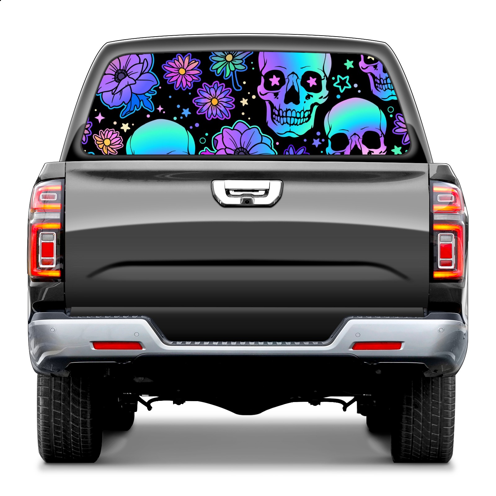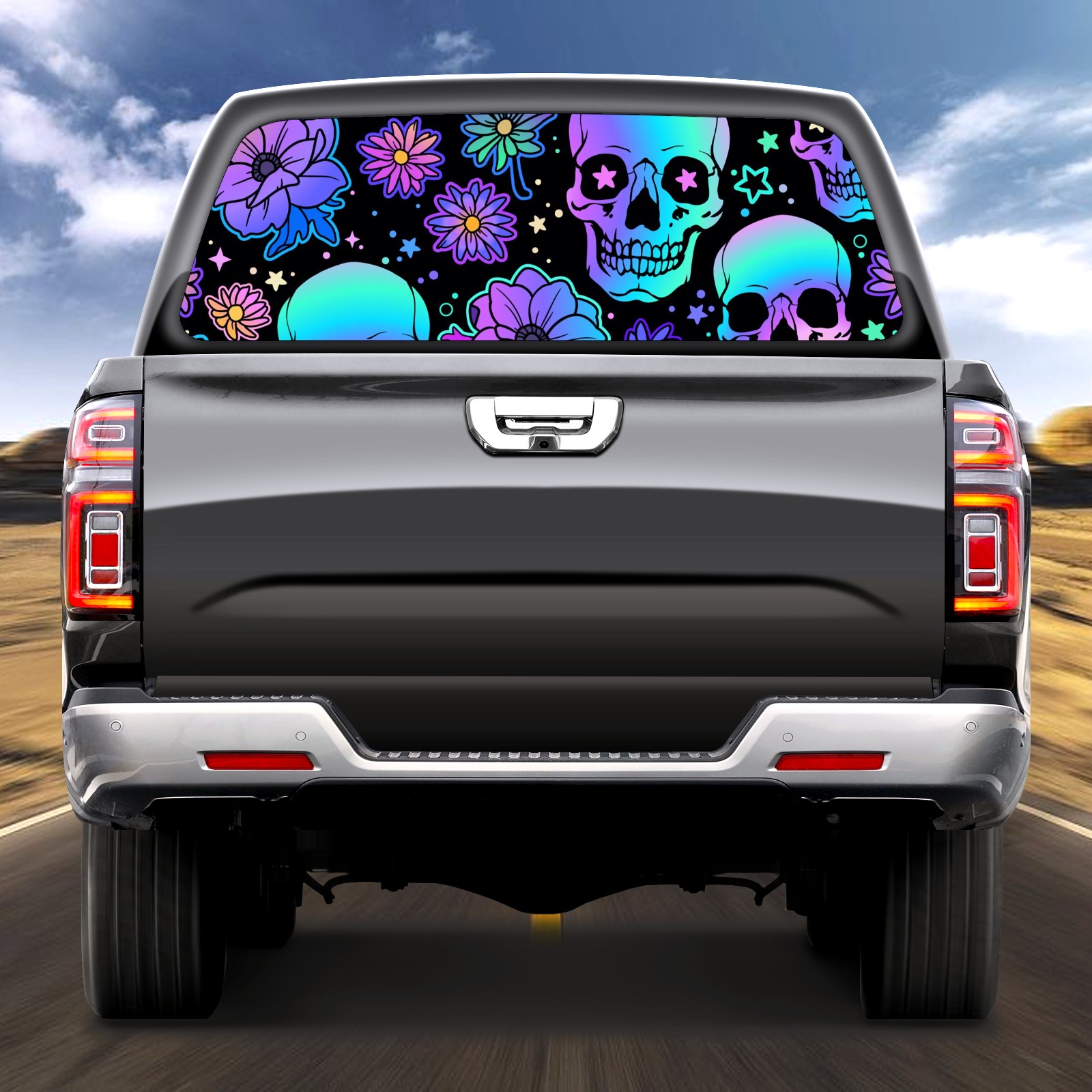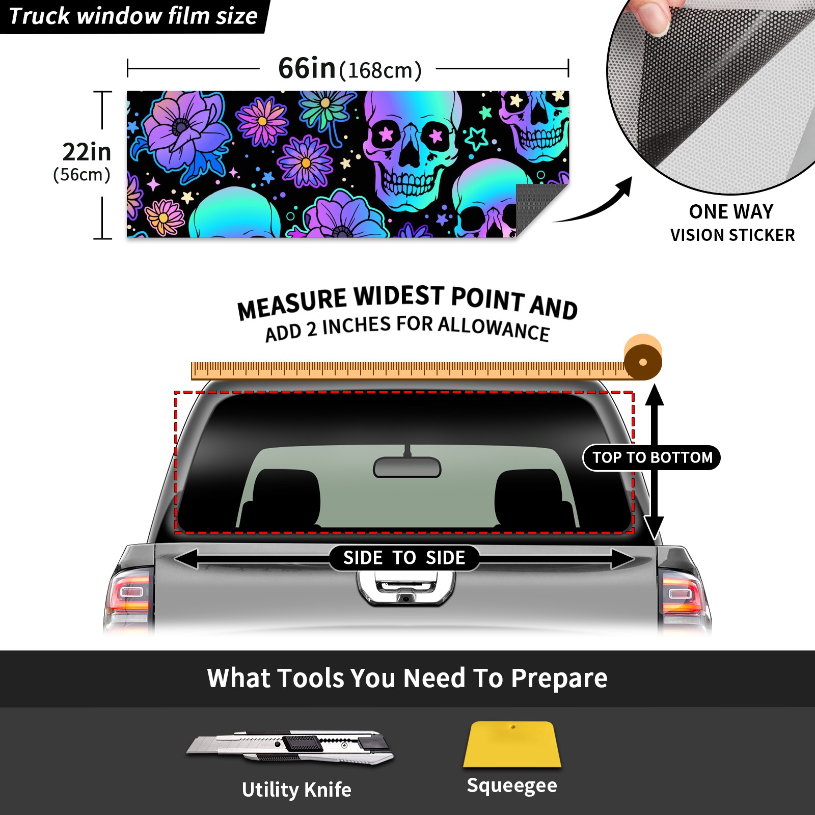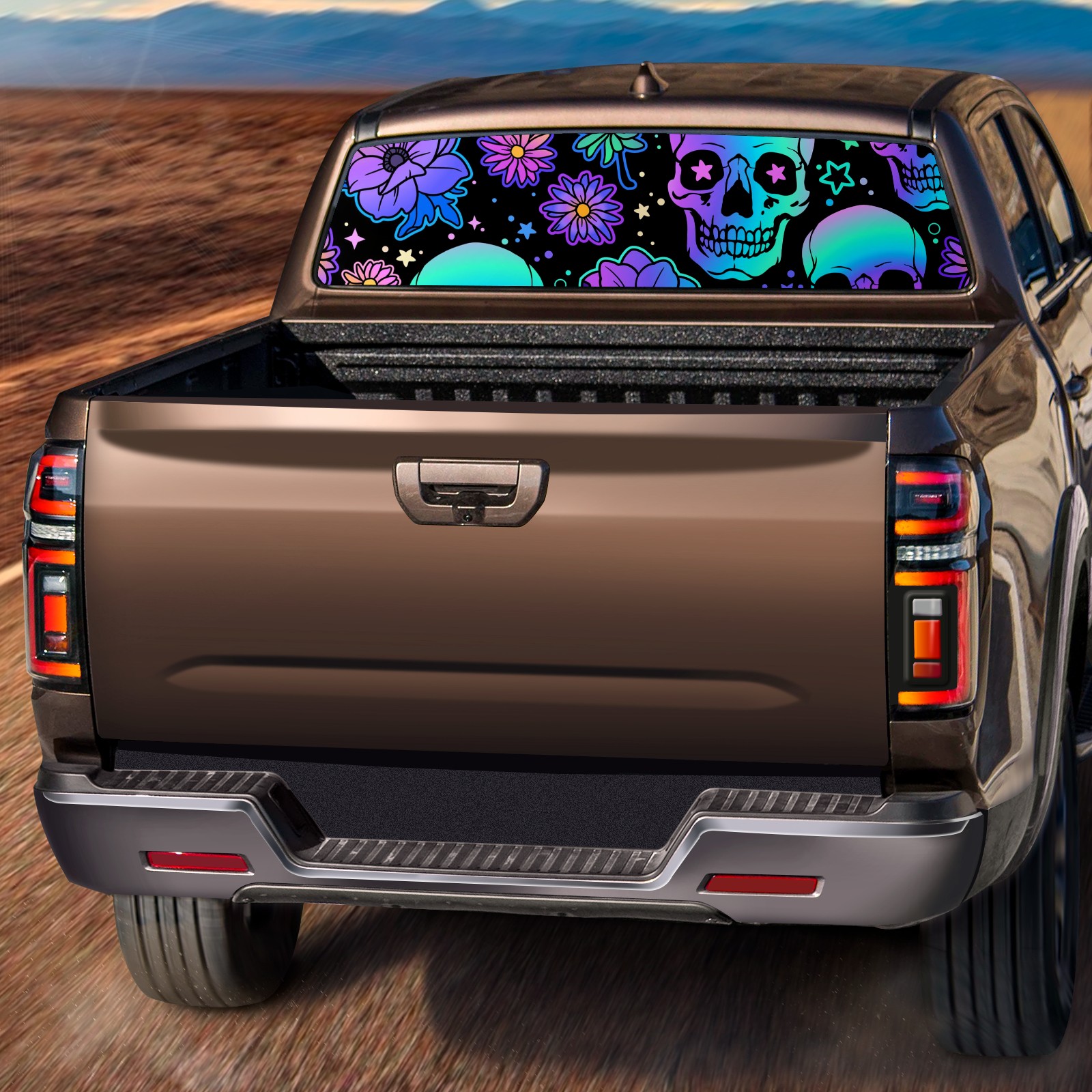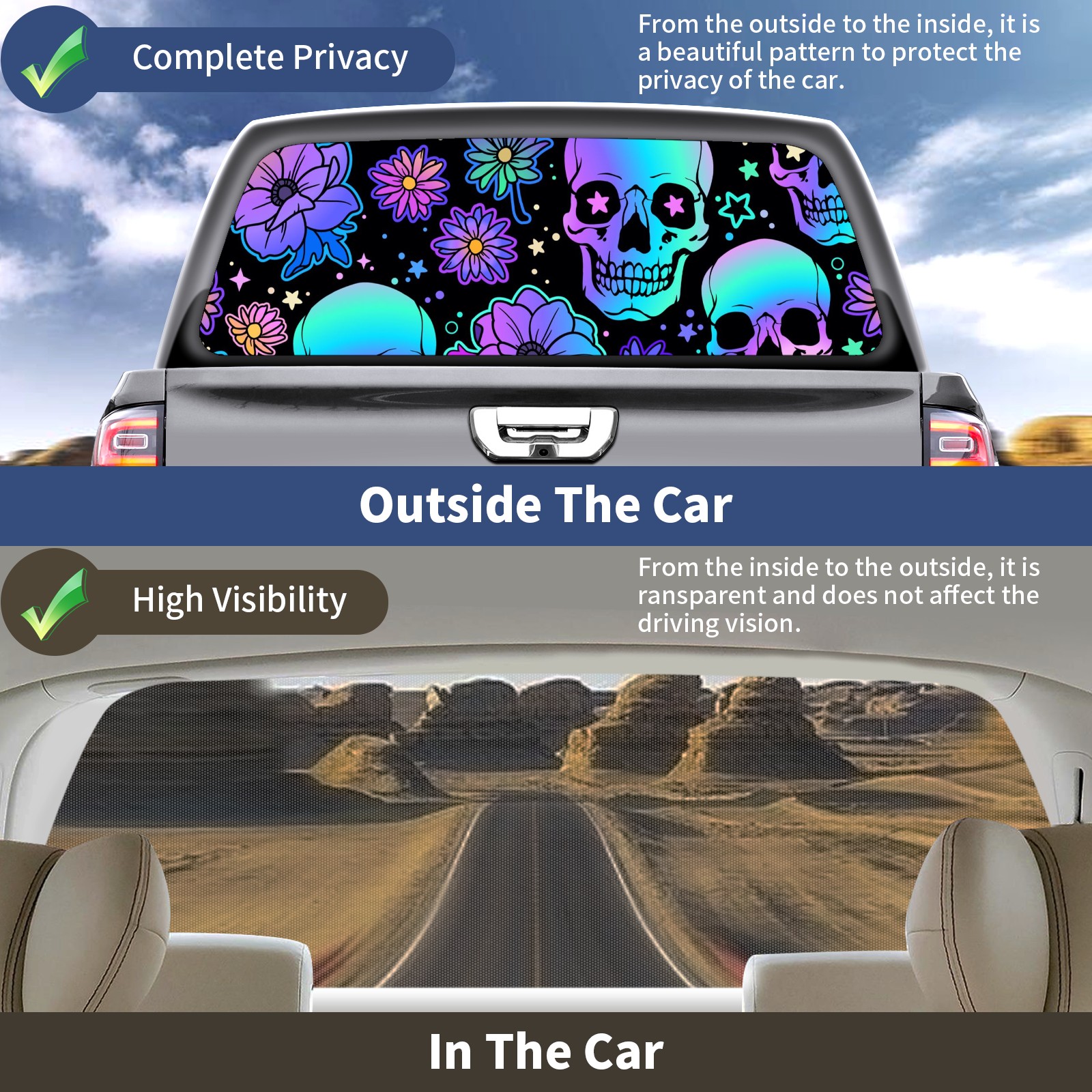 Truck Rear Window Graphics Decals Pickup Trucks Back Window Sticker Full Window Film Decal One Way Visual Waterproof Car Rear Tint Colorful Skull Flowers Stars