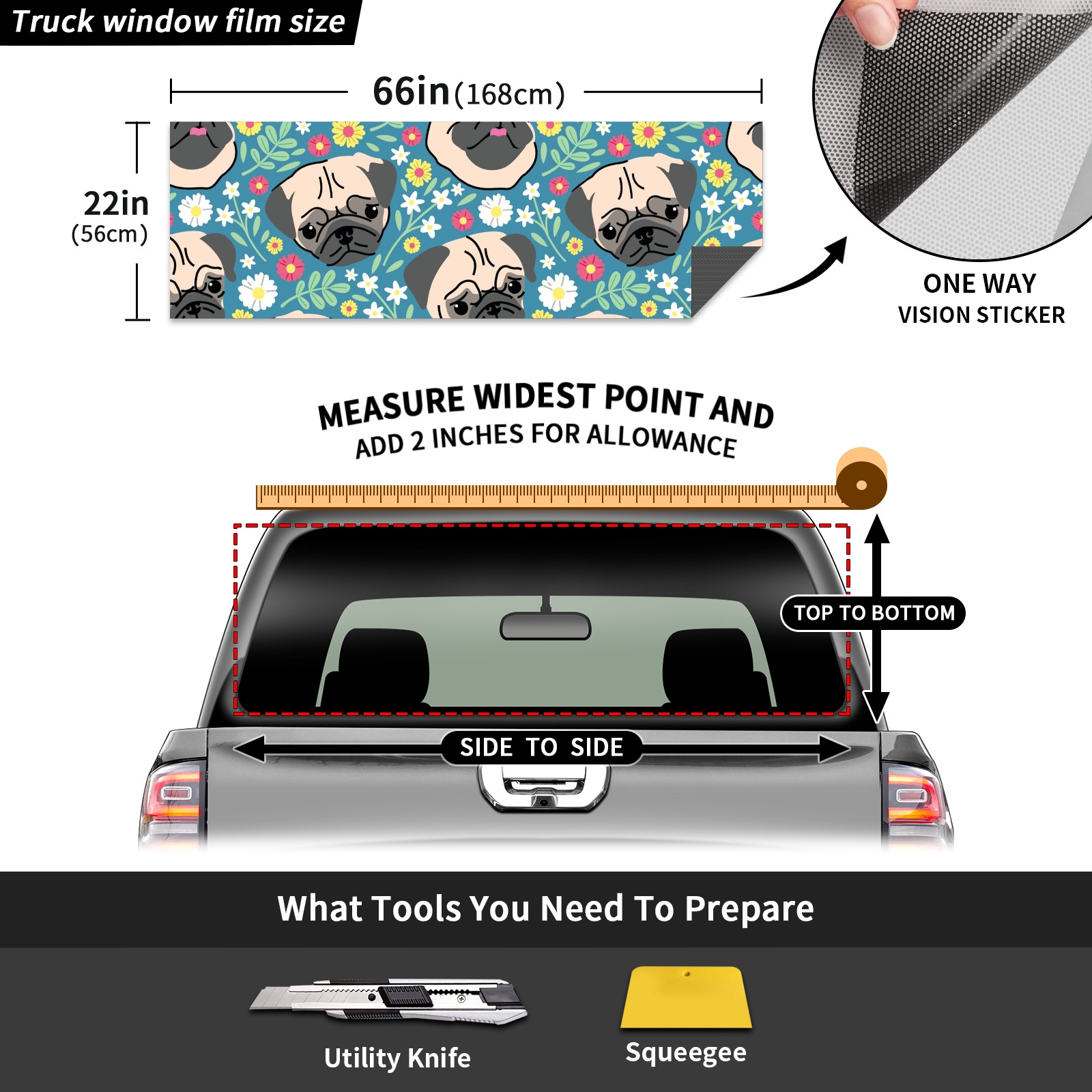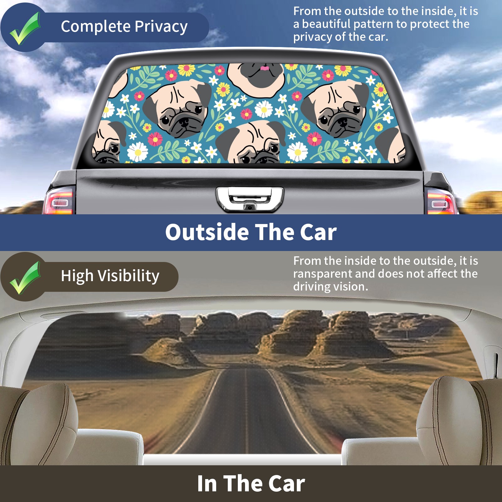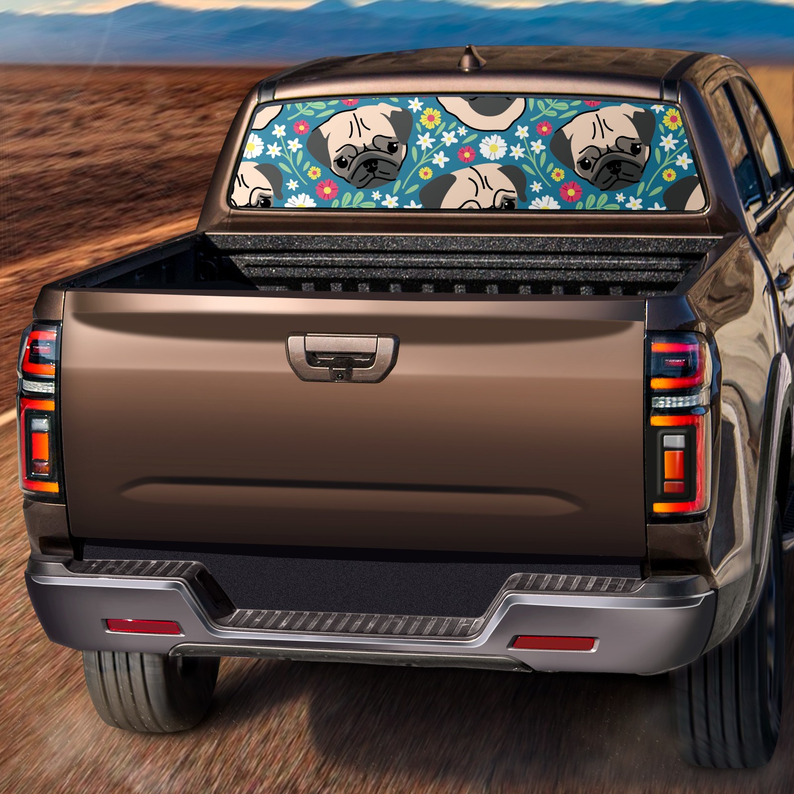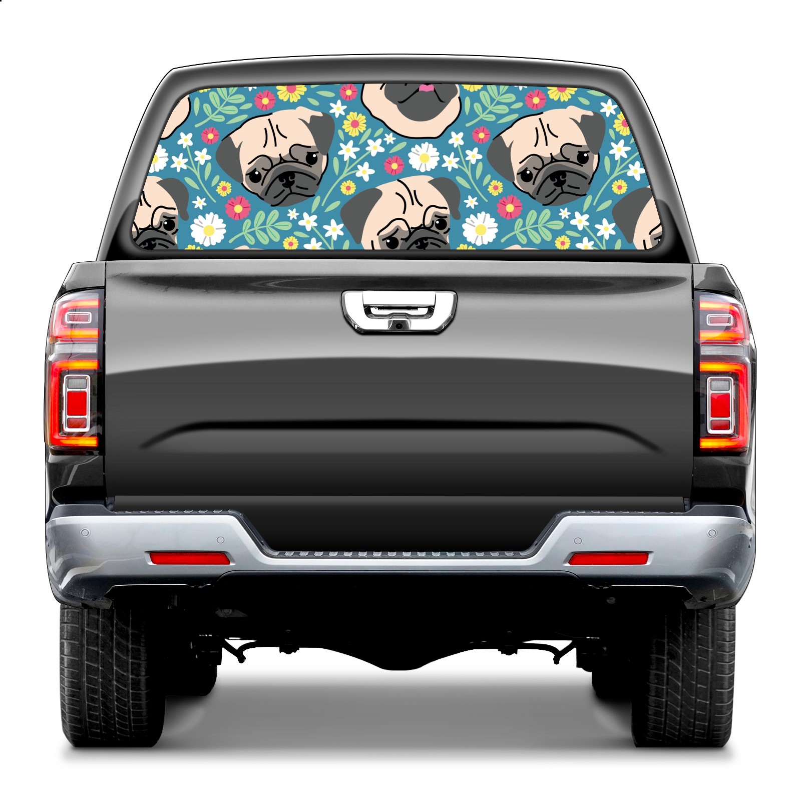 Truck Rear Window Graphics Decals Pickup Trucks Back Window Sticker Full Window Film Decal One Way Visual Waterproof Car Rear Tint Cute Pug Flower