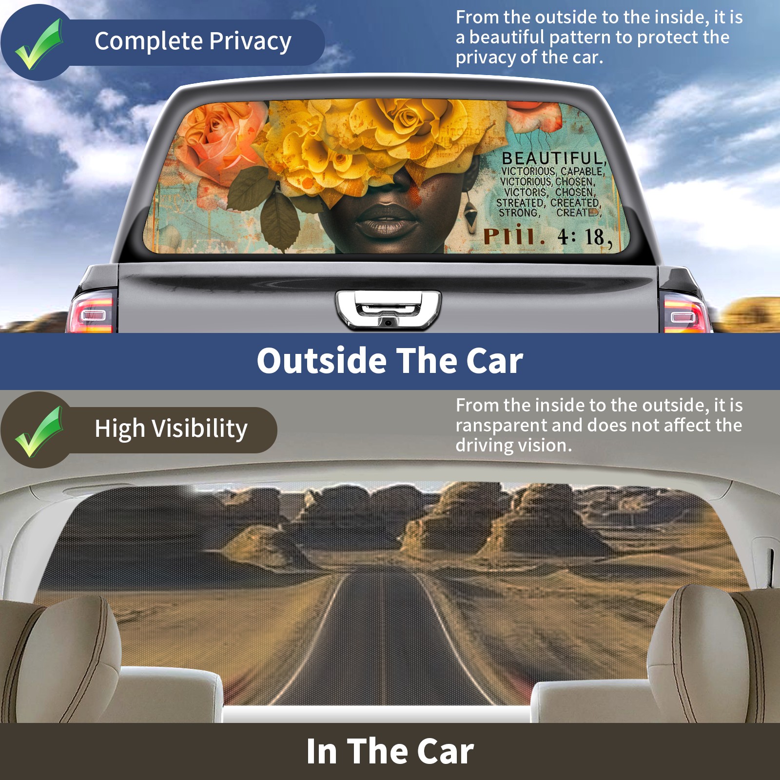 • <b>One-Way Light Transmission Window Film Protect Your Privacy While Allowing You To Enjoy The Scenery Outside Your Window!</b> <br> <b>●Decals Instructions Usage--Teach You To Use Quickly</b> <br> 1.Clean the window galss thoroughly <br> 2.Use a Squeegee or other card to scrape off the remaining water and bumps(don't use too much force) <br> 3.Remove the film's back cover .Use a knife to cut out a suitable contour and wipe off the remaining water(you can also use a hair dryer to blow dry) <br> 4.Find a suitable location and stick a sticker <br> <b>●Unique Design</b> <br> ZXIVGOQFR Back window stickers ‘s smart looking and unique cute design makes your vehicle special under sunshine. Makes your car easy to identify, perfect for finding your car in crowded parking lots and garages.funny visor reflects personality and attitude. <br> <b>●Perfect Gift for all Drivers<br></b> We create all the gifts and accessories you only need to choose what you like. Get full tailgate wraps, rear window decals, and everything you need to make your pickup truck look awesome. <br> <b>Decorate Your Pickup Truck With Rear Window Decal Today!</b>