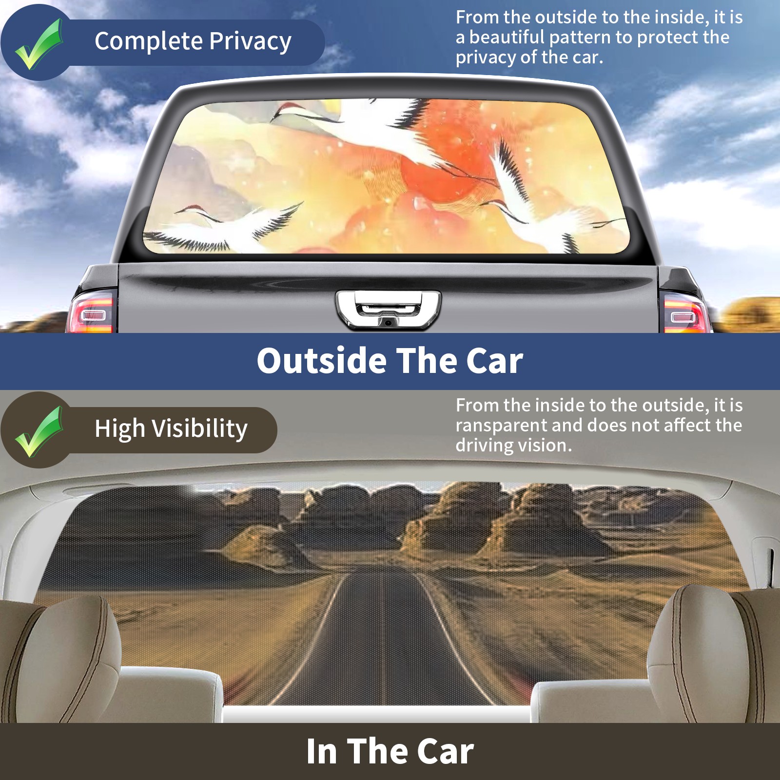<b>One-Way Light Transmission Window Film Protect Your Privacy While Allowing You To Enjoy The Scenery Outside Your Window!</b> <br> <b>●Decals Instructions Usage--Teach You To Use Quickly</b> <br> 1.Clean the window galss thoroughly <br> 2.Use a Squeegee or other card to scrape off the remaining water and bumps(don't use too much force) <br> 3.Remove the film's back cover .Use a knife to cut out a suitable contour and wipe off the remaining water(you can also use a hair dryer to blow dry) <br> 4.Find a suitable location and stick a sticker <br> <b>●Unique Design</b> <br> ZXIVGOQFR Back window stickers ‘s smart looking and unique cute design makes your vehicle special under sunshine. Makes your car easy to identify, perfect for finding your car in crowded parking lots and garages.funny visor reflects personality and attitude. <br> <b>●Perfect Gift for all Drivers<br></b> We create all the gifts and accessories you only need to choose what you like. Get full tailgate wraps, rear window decals, and everything you need to make your pickup truck look awesome. <br> <b>Decorate Your Pickup Truck With Rear Window Decal Today!</b>