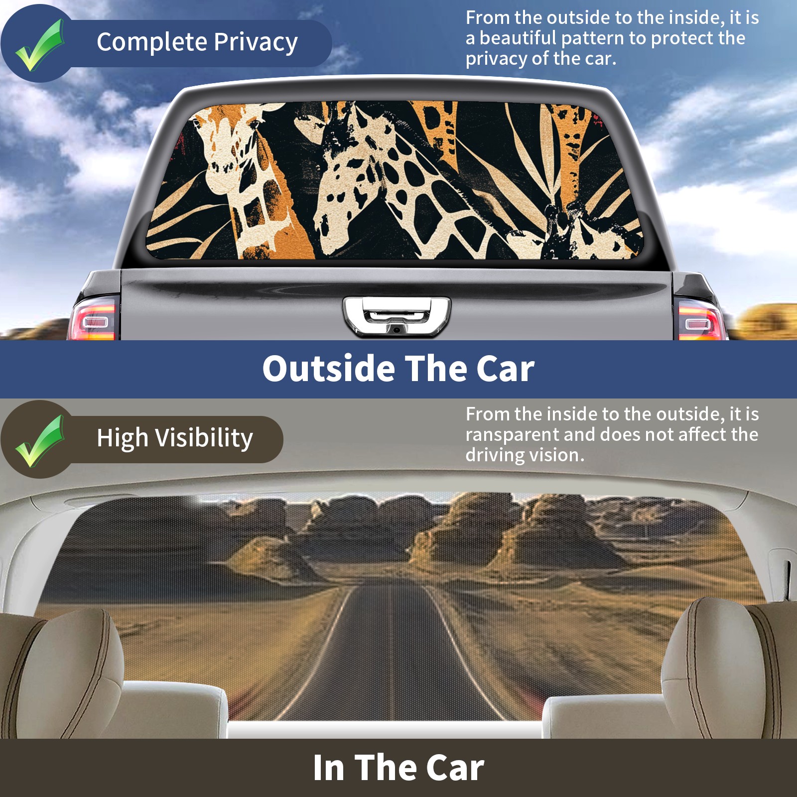 <b>One-Way Light Transmission Window Film Protect Your Privacy While Allowing You To Enjoy The Scenery Outside Your Window!</b> <br> <b>●Decals Instructions Usage--Teach You To Use Quickly</b> <br> 1.Clean the window galss thoroughly <br> 2.Use a Squeegee or other card to scrape off the remaining water and bumps(don't use too much force) <br> 3.Remove the film's back cover .Use a knife to cut out a suitable contour and wipe off the remaining water(you can also use a hair dryer to blow dry) <br> 4.Find a suitable location and stick a sticker <br> <b>●Unique Design</b> <br> ZXIVGOQFR Back window stickers ‘s smart looking and unique cute design makes your vehicle special under sunshine. Makes your car easy to identify, perfect for finding your car in crowded parking lots and garages.funny visor reflects personality and attitude. <br> <b>●Perfect Gift for all Drivers<br></b> We create all the gifts and accessories you only need to choose what you like. Get full tailgate wraps, rear window decals, and everything you need to make your pickup truck look awesome. <br> <b>Decorate Your Pickup Truck With Rear Window Decal Today!</b>