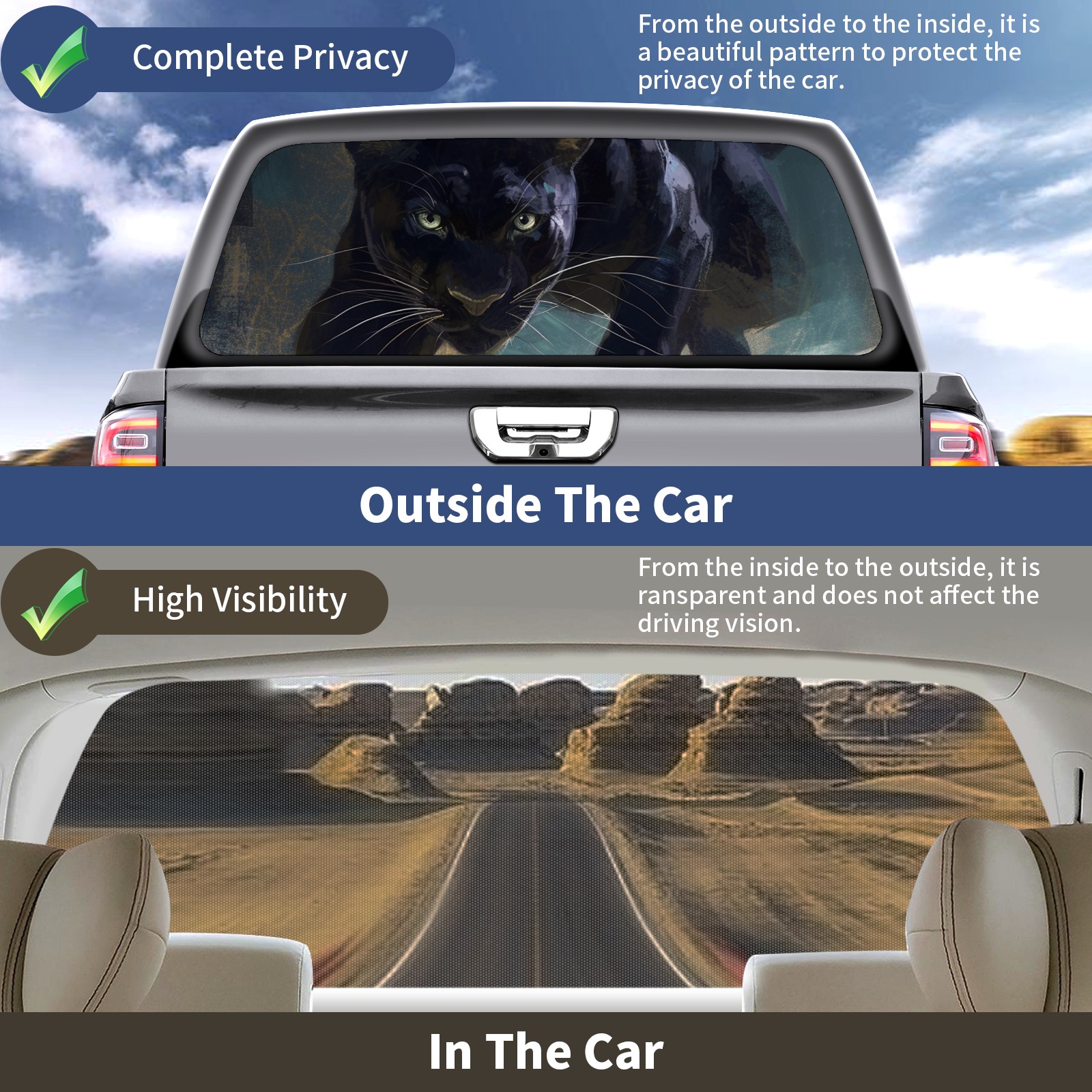 • <b>One-Way Light Transmission Window Film Protect Your Privacy While Allowing You To Enjoy The Scenery Outside Your Window!</b> <br> <b>●Decals Instructions Usage--Teach You To Use Quickly</b> <br> 1.Clean the window galss thoroughly <br> 2.Use a Squeegee or other card to scrape off the remaining water and bumps(don't use too much force) <br> 3.Remove the film's back cover .Use a knife to cut out a suitable contour and wipe off the remaining water(you can also use a hair dryer to blow dry) <br> 4.Find a suitable location and stick a sticker <br> <b>●Unique Design</b> <br> ZXIVGOQFR Back window stickers ‘s smart looking and unique cute design makes your vehicle special under sunshine. Makes your car easy to identify, perfect for finding your car in crowded parking lots and garages.funny visor reflects personality and attitude. <br> <b>●Perfect Gift for all Drivers<br></b> We create all the gifts and accessories you only need to choose what you like. Get full tailgate wraps, rear window decals, and everything you need to make your pickup truck look awesome. <br> <b>Decorate Your Pickup Truck With Rear Window Decal Today!</b>