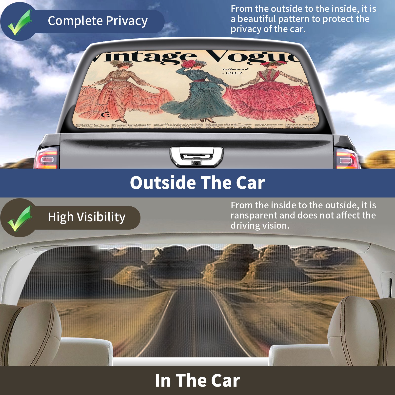 • <b>One-Way Light Transmission Window Film Protect Your Privacy While Allowing You To Enjoy The Scenery Outside Your Window!</b> <br> <b>●Decals Instructions Usage--Teach You To Use Quickly</b> <br> 1.Clean the window galss thoroughly <br> 2.Use a Squeegee or other card to scrape off the remaining water and bumps(don't use too much force) <br> 3.Remove the film's back cover .Use a knife to cut out a suitable contour and wipe off the remaining water(you can also use a hair dryer to blow dry) <br> 4.Find a suitable location and stick a sticker <br> <b>●Unique Design</b> <br> ZXIVGOQFR Back window stickers ‘s smart looking and unique cute design makes your vehicle special under sunshine. Makes your car easy to identify, perfect for finding your car in crowded parking lots and garages.funny visor reflects personality and attitude. <br> <b>●Perfect Gift for all Drivers<br></b> We create all the gifts and accessories you only need to choose what you like. Get full tailgate wraps, rear window decals, and everything you need to make your pickup truck look awesome. <br> <b>Decorate Your Pickup Truck With Rear Window Decal Today!</b>