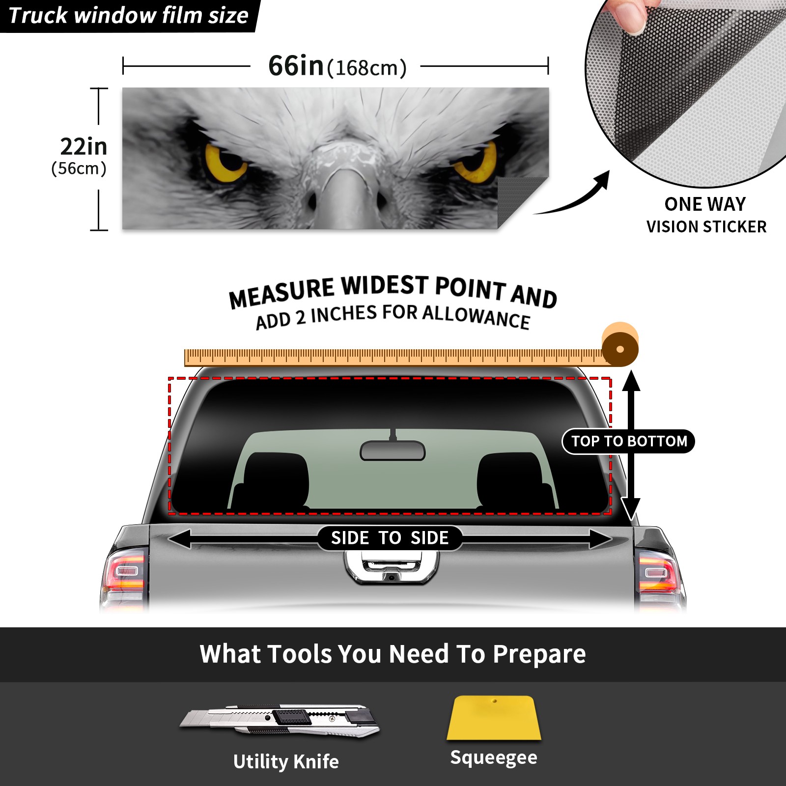 <p><strong>Truck Rear Window Graphics Decals Pickup Trucks Back Window Film Stickers 66" x 22" Perforated Vinyl Wrap Stickers Decorations for Car Rear Window</strong></p><p><strong><br /></strong></p><p><strong>Features :</strong></p><p>- Size of the rear window decals for trucks is 66x22 Inches (168x56cm).</p><p>- High quality perforated vinyl window film, one way vision sticker.</p><p>- Perforated is see through from the inside but not from outside.</p><p>- Clear printing, waterproof and durable.</p><p>- The car back window graphics stickers fits most truck and makes your vehicle more beautiful.&nbsp;</p><p><br /></p><p><strong>【Installation Instructions】</strong></p><p><strong>1. CLEAN SURFACE -</strong> Clean the rear window thoroughly and make sure the surface clean.</p><p><strong>2. STICK THE DECALS -</strong> Tear off the paper on the back and stick the decal on the window.</p><p><strong>3. SCRAPE OFF AIR BUBBLES -</strong> Use a squeegee or other card to scrape off the excess air bubbles.</p><p><strong>4. TRIM THE EXCESS -</strong> Use a knife to cut off the excess stickers of the window, finally complete.</p><p><br /></p><p>1. Please measure the size before purchasing, back window graphics decal for truck can be cut to your desired size.</p><p>2.The graphics stickers for truck back window is a great gift for yourself also can as a birthday / halloween / christmas gift for your friends and family.</p>