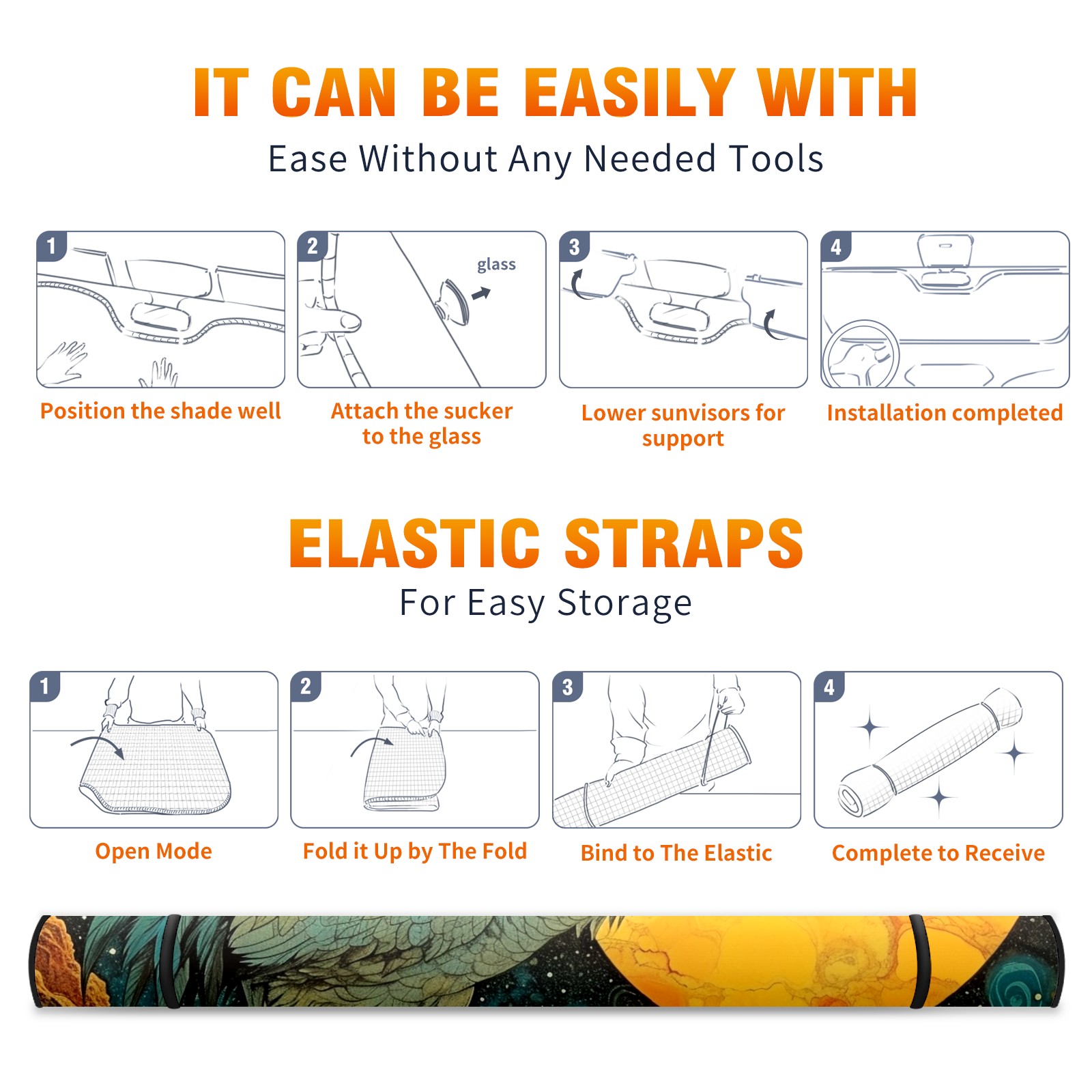 • <b>ZXIVGOQFR Foldable Premium Car Windshield Sunshade is your great solution to reduce your car’s interior temperature dramatically! This is definitely a must-have item for your summer travel! </b> <br> ●<b>Size: 63"L x 33.5"W </b> <br></b> ●<b>Blocking Uv Rays & Heat Insulation<br></b> Our vehicle sunshade provides effective UV, sun, and summer heat protection .Maintains dashboards by preventing fading and cracking <br> ●<b>Easy-To-Store Folding Design Makes Storage Convenient <br></b> ZXIVGOQFR car sunshades come with removable suction cups and elastic bands that you can install easily and quickly, and the removable suction cups will not leave any marks on your windows when removed. Within seconds, windshield visor can be installed and removed. When not in use,the front windshield can be easily and effectively placed on the door pocket or the dashboard, which is beautiful and does not take up space in the car.<br> <br> <b>PUT UP A 'PROTECTIVE UMBRELLA' FOR YOUR BELOVED CAR!</b>
