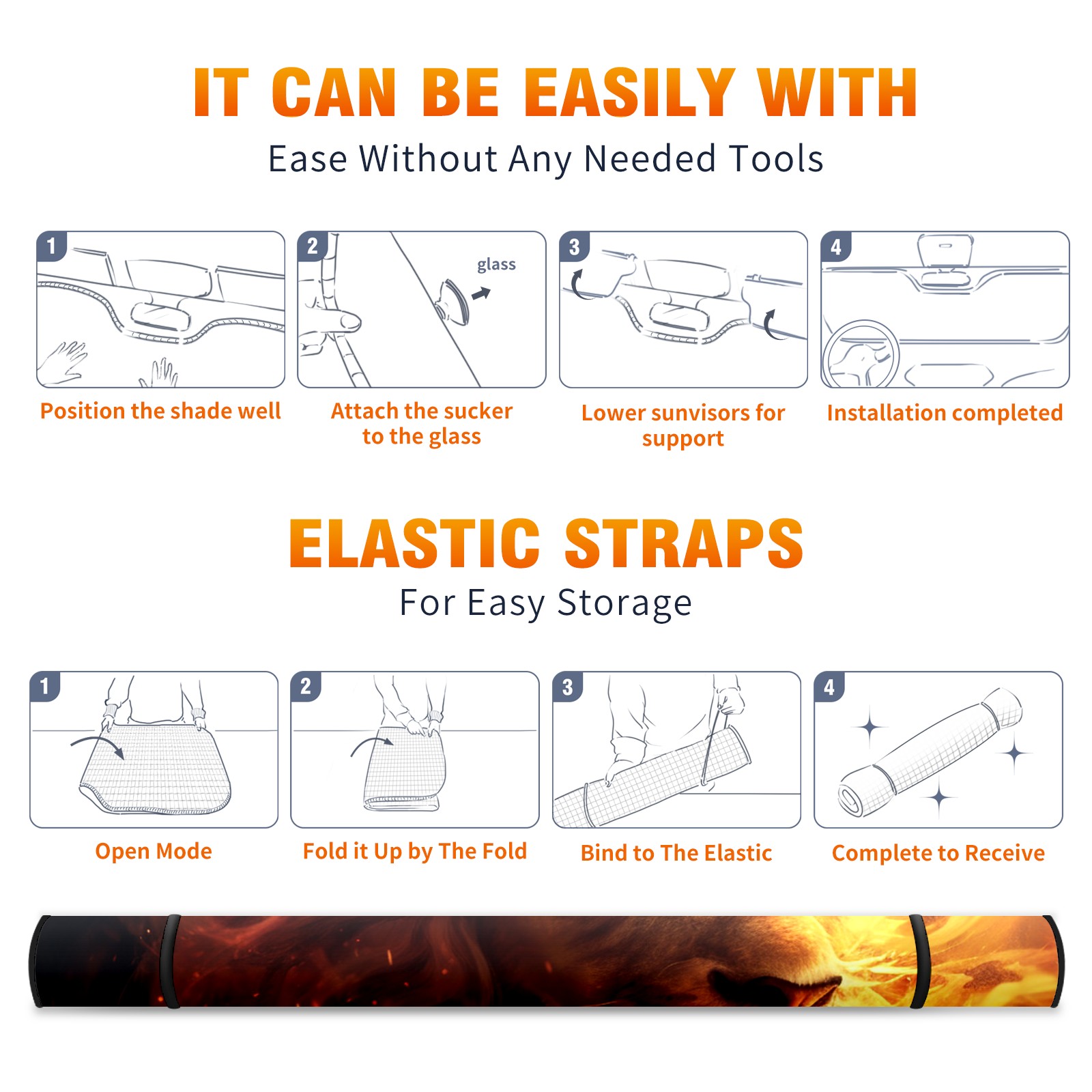 <b>ZXIVGOQFR Foldable Premium Car Windshield Sunshade is your great solution to reduce your car’s interior temperature dramatically! This is definitely a must-have item for your summer travel! </b> <br> ●<b>Size: 63"L x 33.5"W </b> <br></b> ●<b>Blocking Uv Rays & Heat Insulation<br></b> Our vehicle sunshade provides effective UV, sun, and summer heat protection .Maintains dashboards by preventing fading and cracking <br> ●<b>Easy-To-Store Folding Design Makes Storage Convenient <br></b> ZXIVGOQFR car sunshades come with removable suction cups and elastic bands that you can install easily and quickly, and the removable suction cups will not leave any marks on your windows when removed. Within seconds, windshield visor can be installed and removed. When not in use,the front windshield can be easily and effectively placed on the door pocket or the dashboard, which is beautiful and does not take up space in the car.<br> <br> <b>PUT UP A 'PROTECTIVE UMBRELLA' FOR YOUR BELOVED CAR!</b>