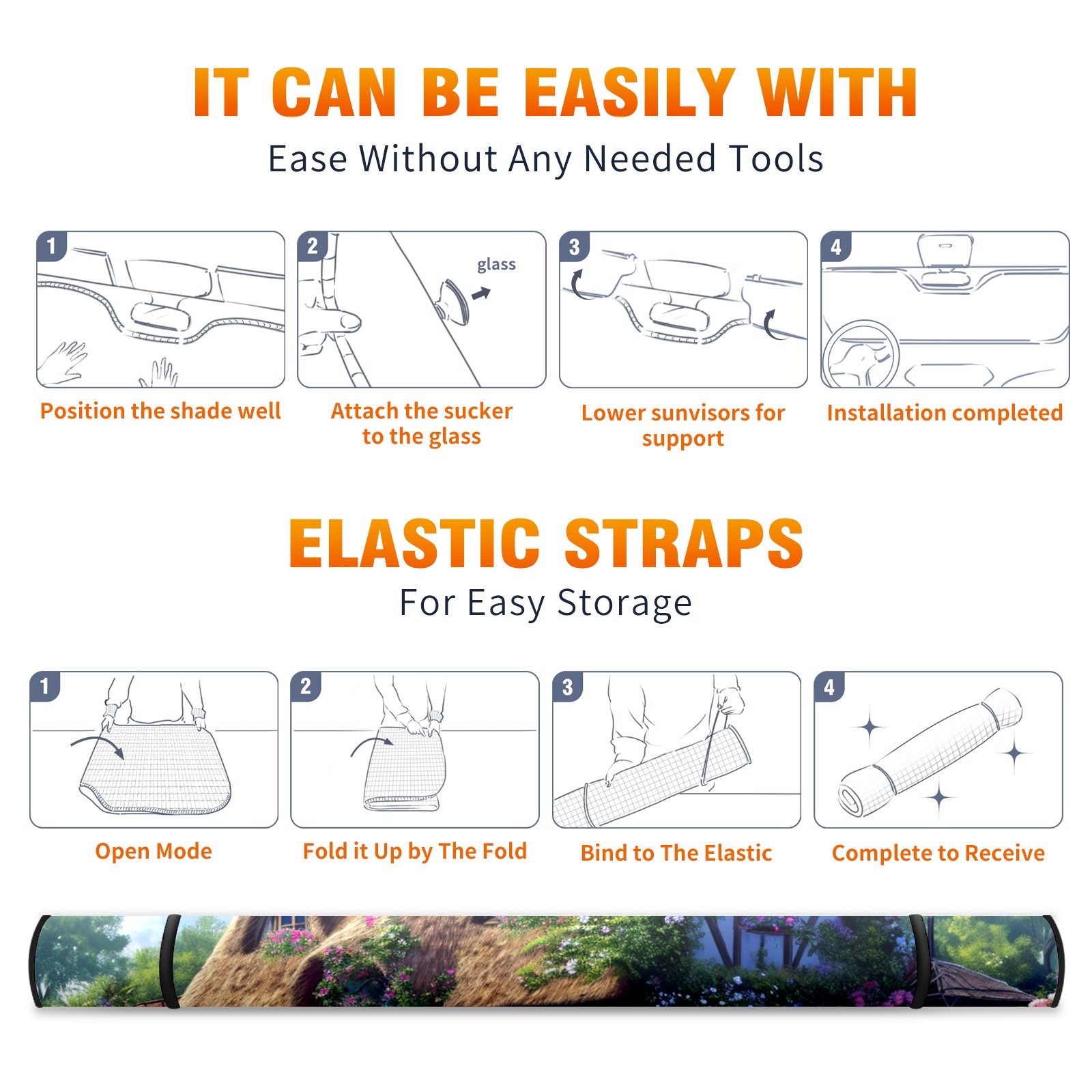 <b>ZXIVGOQFR Foldable Premium Car Windshield Sunshade is your great solution to reduce your car’s interior temperature dramatically! This is definitely a must-have item for your summer travel! </b> <br> ●<b>Size: 63"L x 33.5"W </b> <br></b> ●<b>Blocking Uv Rays & Heat Insulation<br></b> Our vehicle sunshade provides effective UV, sun, and summer heat protection .Maintains dashboards by preventing fading and cracking <br> ●<b>Easy-To-Store Folding Design Makes Storage Convenient <br></b> ZXIVGOQFR car sunshades come with removable suction cups and elastic bands that you can install easily and quickly, and the removable suction cups will not leave any marks on your windows when removed. Within seconds, windshield visor can be installed and removed. When not in use,the front windshield can be easily and effectively placed on the door pocket or the dashboard, which is beautiful and does not take up space in the car.<br> <br> <b>PUT UP A 'PROTECTIVE UMBRELLA' FOR YOUR BELOVED CAR!</b>