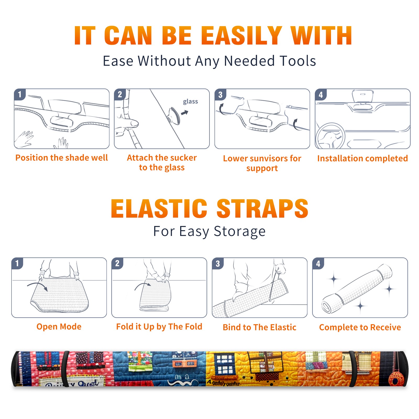<b>ZXIVGOQFR Foldable Premium Car Windshield Sunshade is your great solution to reduce your car’s interior temperature dramatically! This is definitely a must-have item for your summer travel! </b> <br> ●<b>Size: 63"L x 33.5"W </b> <br></b> ●<b>Blocking Uv Rays & Heat Insulation<br></b> Our vehicle sunshade provides effective UV, sun, and summer heat protection .Maintains dashboards by preventing fading and cracking <br> ●<b>Easy-To-Store Folding Design Makes Storage Convenient <br></b> ZXIVGOQFR car sunshades come with removable suction cups and elastic bands that you can install easily and quickly, and the removable suction cups will not leave any marks on your windows when removed. Within seconds, windshield visor can be installed and removed. When not in use,the front windshield can be easily and effectively placed on the door pocket or the dashboard, which is beautiful and does not take up space in the car.<br> <br> <b>PUT UP A 'PROTECTIVE UMBRELLA' FOR YOUR BELOVED CAR!</b>