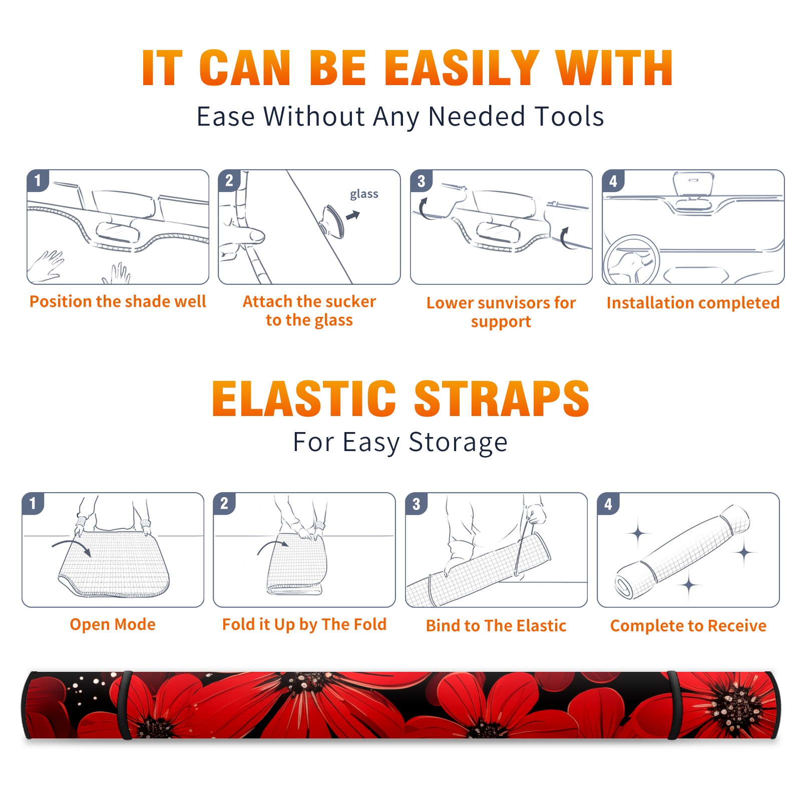 <b>ZXIVGOQFR Foldable Premium Car Windshield Sunshade is your great solution to reduce your car’s interior temperature dramatically! This is definitely a must-have item for your summer travel! </b> <br> ●<b>Size: 63"L x 33.5"W </b> <br></b> ●<b>Blocking Uv Rays & Heat Insulation<br></b> Our vehicle sunshade provides effective UV, sun, and summer heat protection .Maintains dashboards by preventing fading and cracking <br> ●<b>Easy-To-Store Folding Design Makes Storage Convenient <br></b> ZXIVGOQFR car sunshades come with removable suction cups and elastic bands that you can install easily and quickly, and the removable suction cups will not leave any marks on your windows when removed. Within seconds, windshield visor can be installed and removed. When not in use,the front windshield can be easily and effectively placed on the door pocket or the dashboard, which is beautiful and does not take up space in the car.<br> <br> <b>PUT UP A 'PROTECTIVE UMBRELLA' FOR YOUR BELOVED CAR!</b>
