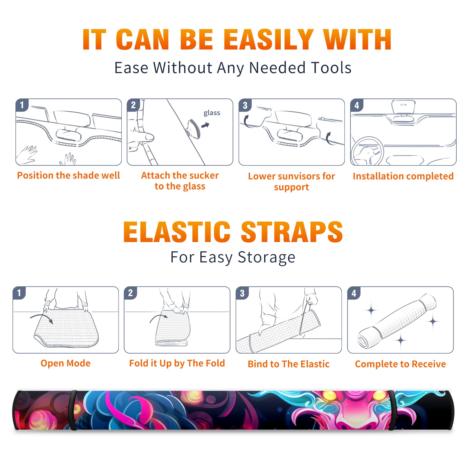 <b>ZXIVGOQFR Foldable Premium Car Windshield Sunshade is your great solution to reduce your car’s interior temperature dramatically! This is definitely a must-have item for your summer travel! </b> <br> ●<b>Size: 63"L x 33.5"W </b> <br></b> ●<b>Blocking Uv Rays & Heat Insulation<br></b> Our vehicle sunshade provides effective UV, sun, and summer heat protection .Maintains dashboards by preventing fading and cracking <br> ●<b>Easy-To-Store Folding Design Makes Storage Convenient <br></b> ZXIVGOQFR car sunshades come with removable suction cups and elastic bands that you can install easily and quickly, and the removable suction cups will not leave any marks on your windows when removed. Within seconds, windshield visor can be installed and removed. When not in use,the front windshield can be easily and effectively placed on the door pocket or the dashboard, which is beautiful and does not take up space in the car.<br> <br> <b>PUT UP A 'PROTECTIVE UMBRELLA' FOR YOUR BELOVED CAR!</b>