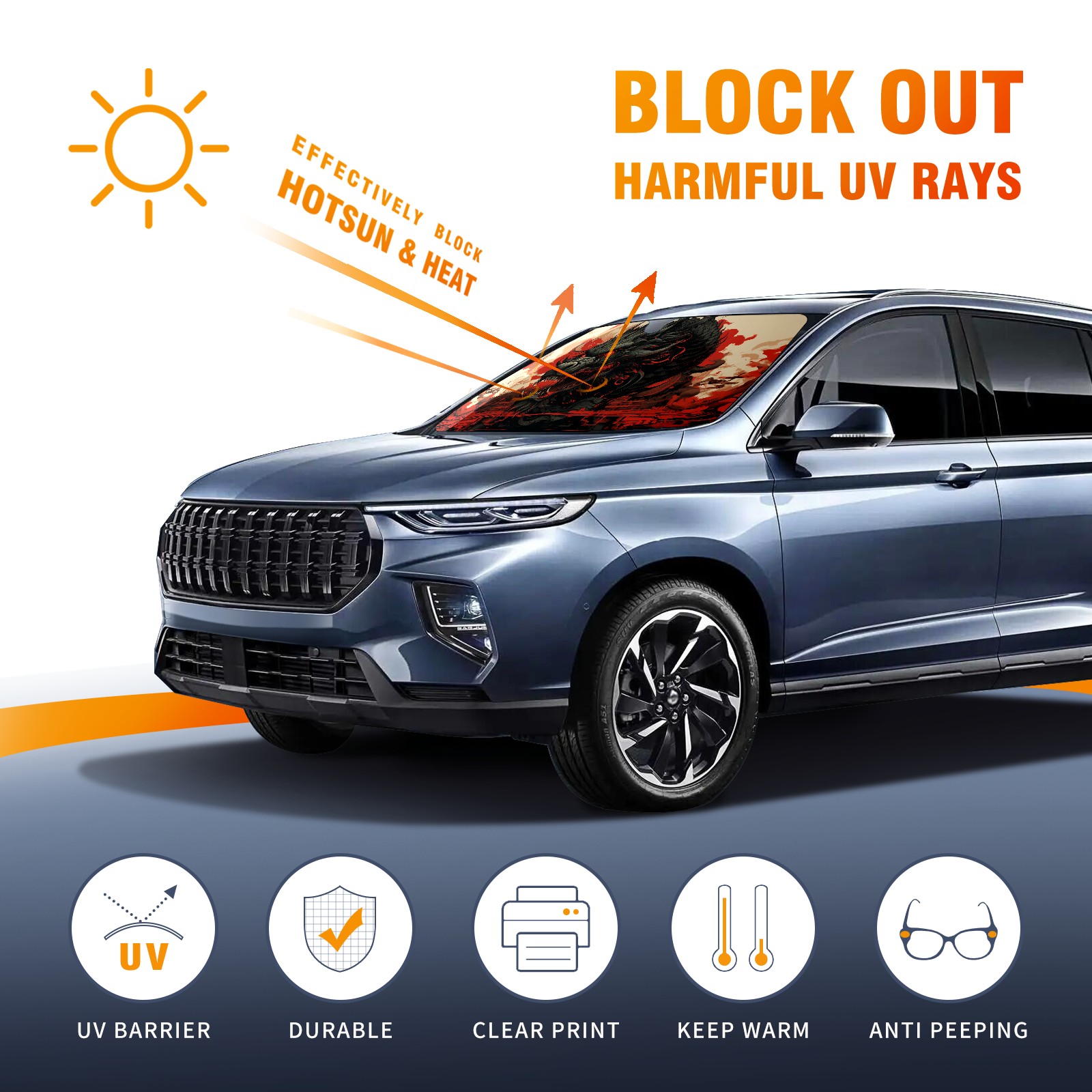 <b>ZXIVGOQFR Foldable Premium Car Windshield Sunshade is your great solution to reduce your car’s interior temperature dramatically! This is definitely a must-have item for your summer travel! </b> <br> ●<b>Size: 63"L x 33.5"W </b> <br></b> ●<b>Blocking Uv Rays & Heat Insulation<br></b> Our vehicle sunshade provides effective UV, sun, and summer heat protection .Maintains dashboards by preventing fading and cracking <br> ●<b>Easy-To-Store Folding Design Makes Storage Convenient <br></b> ZXIVGOQFR car sunshades come with removable suction cups and elastic bands that you can install easily and quickly, and the removable suction cups will not leave any marks on your windows when removed. Within seconds, windshield visor can be installed and removed. When not in use,the front windshield can be easily and effectively placed on the door pocket or the dashboard, which is beautiful and does not take up space in the car.<br> <br> <b>PUT UP A 'PROTECTIVE UMBRELLA' FOR YOUR BELOVED CAR!</b>