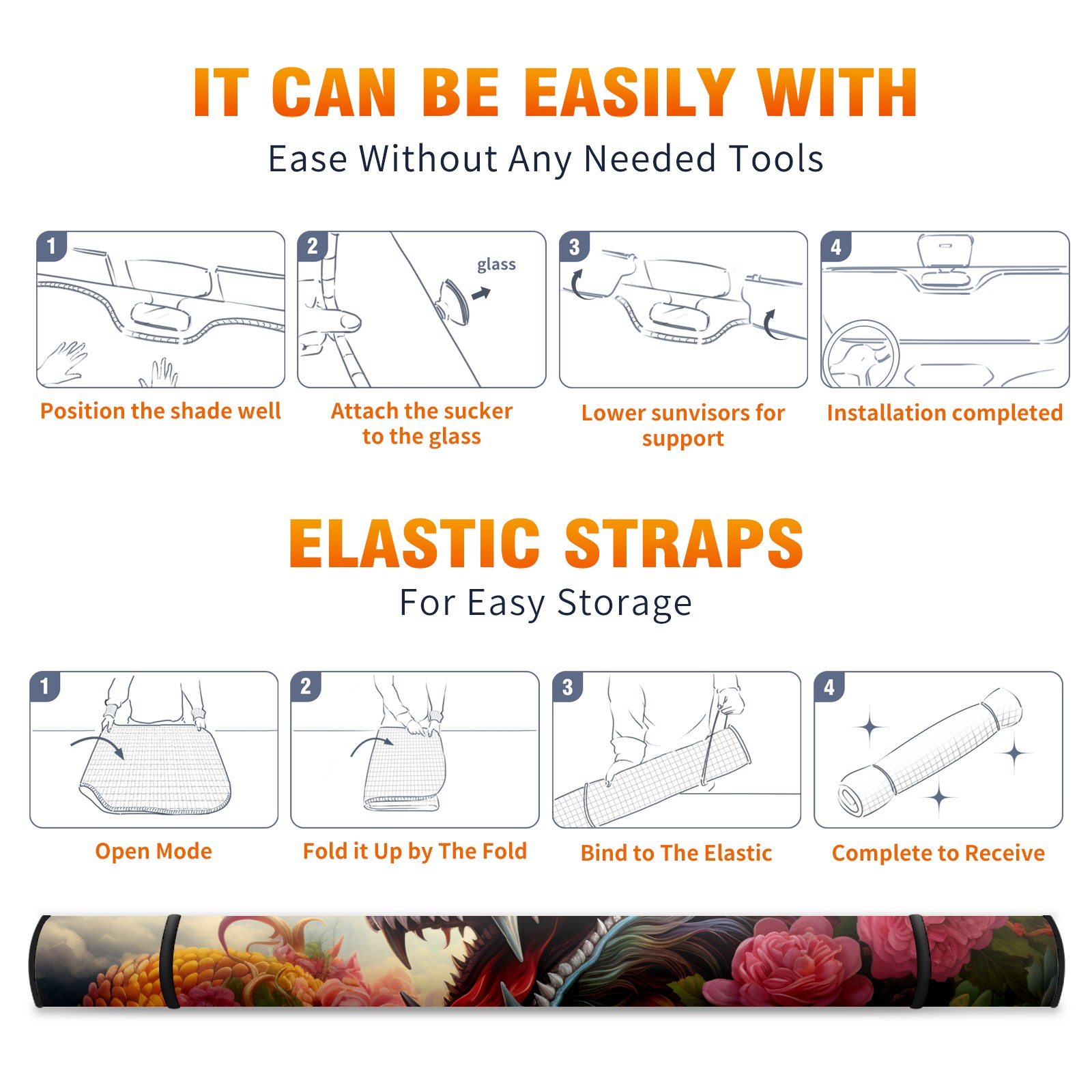 <b>ZXIVGOQFR Foldable Premium Car Windshield Sunshade is your great solution to reduce your car’s interior temperature dramatically! This is definitely a must-have item for your summer travel! </b> <br> ●<b>Size: 63"L x 33.5"W </b> <br></b> ●<b>Blocking Uv Rays & Heat Insulation<br></b> Our vehicle sunshade provides effective UV, sun, and summer heat protection .Maintains dashboards by preventing fading and cracking <br> ●<b>Easy-To-Store Folding Design Makes Storage Convenient <br></b> ZXIVGOQFR car sunshades come with removable suction cups and elastic bands that you can install easily and quickly, and the removable suction cups will not leave any marks on your windows when removed. Within seconds, windshield visor can be installed and removed. When not in use,the front windshield can be easily and effectively placed on the door pocket or the dashboard, which is beautiful and does not take up space in the car.<br> <br> <b>PUT UP A 'PROTECTIVE UMBRELLA' FOR YOUR BELOVED CAR!</b>