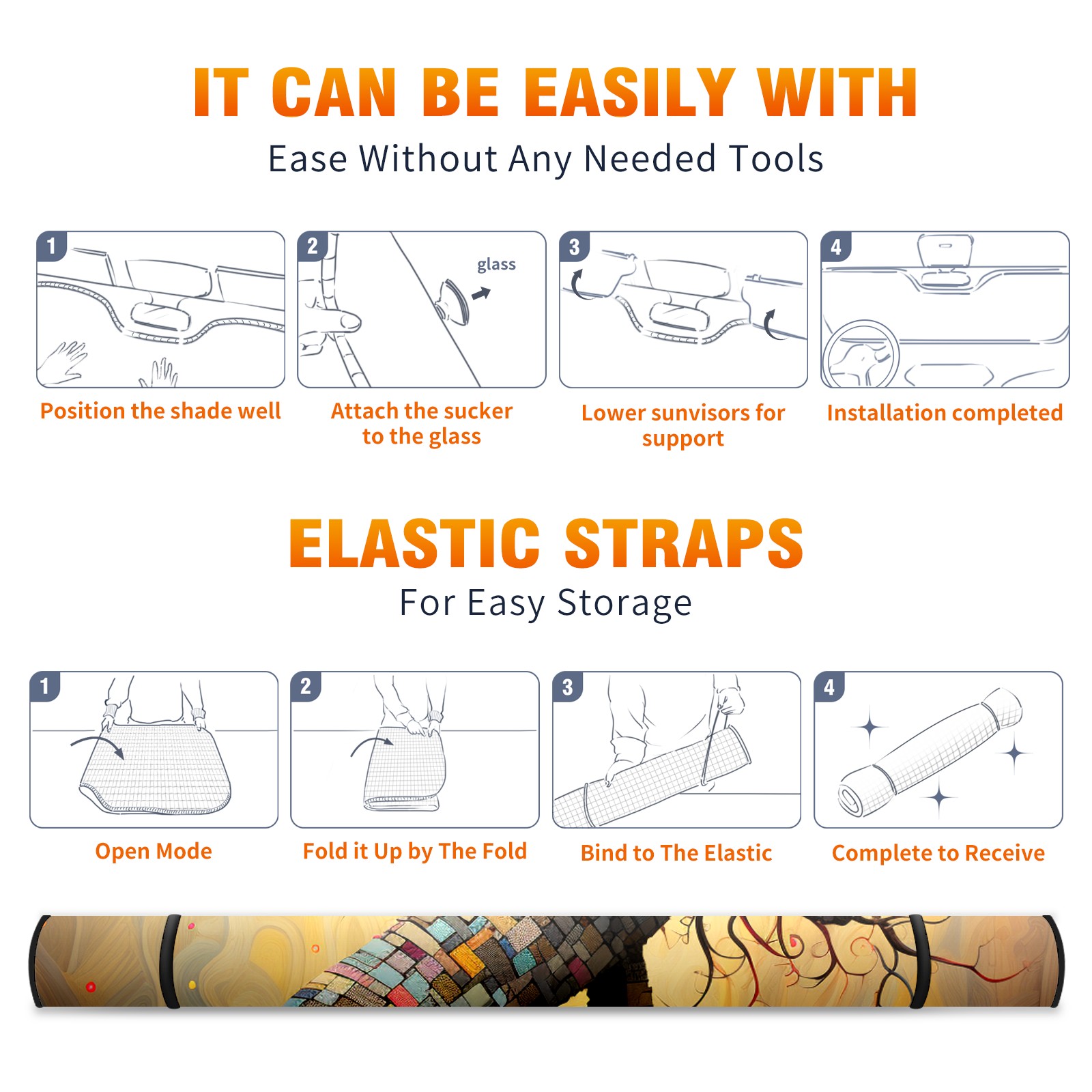 <b>ZXIVGOQFR Foldable Premium Car Windshield Sunshade is your great solution to reduce your car’s interior temperature dramatically! This is definitely a must-have item for your summer travel! </b> <br> ●<b>Size: 63"L x 33.5"W </b> <br></b> ●<b>Blocking Uv Rays & Heat Insulation<br></b> Our vehicle sunshade provides effective UV, sun, and summer heat protection .Maintains dashboards by preventing fading and cracking <br> ●<b>Easy-To-Store Folding Design Makes Storage Convenient <br></b> ZXIVGOQFR car sunshades come with removable suction cups and elastic bands that you can install easily and quickly, and the removable suction cups will not leave any marks on your windows when removed. Within seconds, windshield visor can be installed and removed. When not in use,the front windshield can be easily and effectively placed on the door pocket or the dashboard, which is beautiful and does not take up space in the car.<br> <br> <b>PUT UP A 'PROTECTIVE UMBRELLA' FOR YOUR BELOVED CAR!</b>