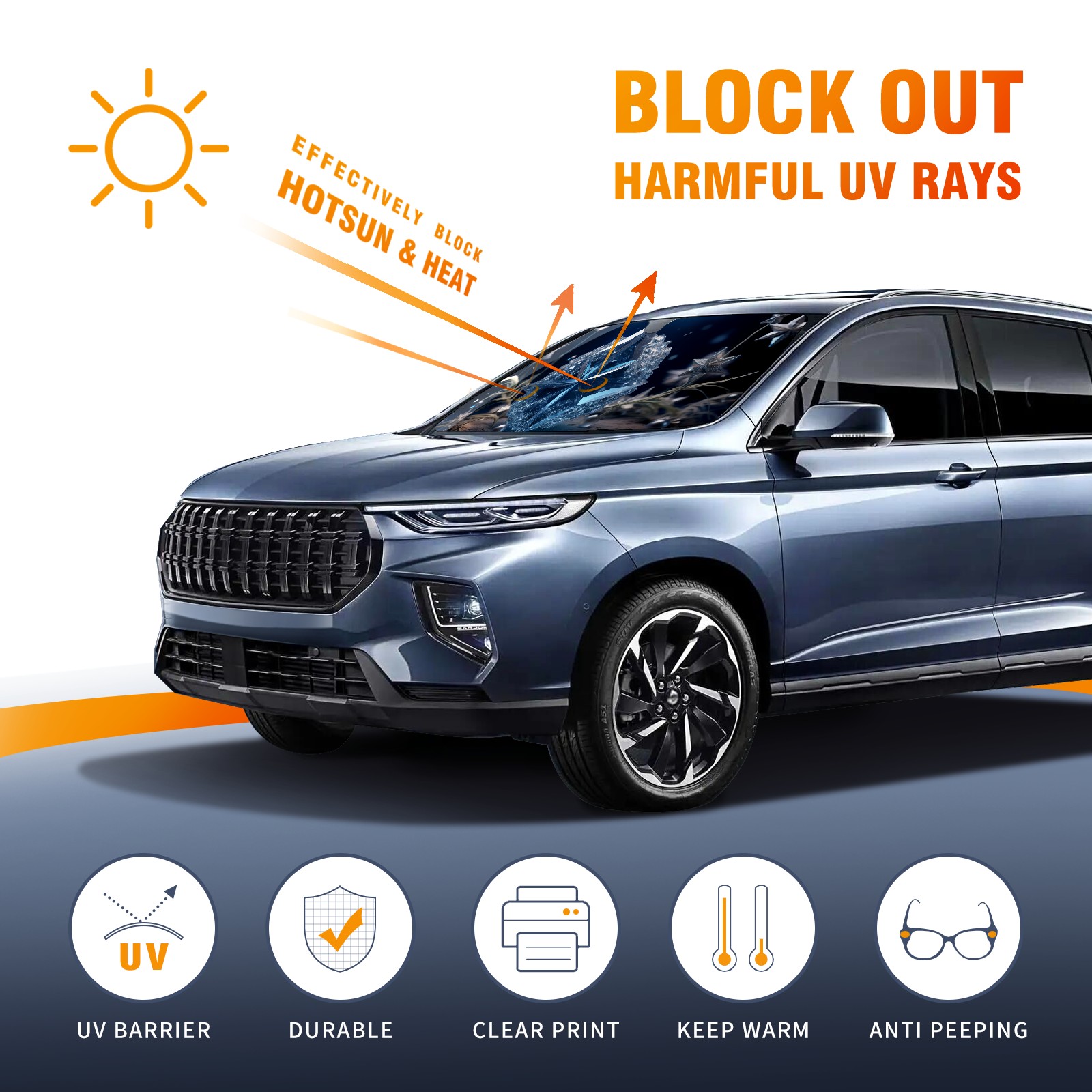 <b>ZXIVGOQFR Foldable Premium Car Windshield Sunshade is your great solution to reduce your car’s interior temperature dramatically! This is definitely a must-have item for your summer travel! </b> <br> ●<b>Size: 63"L x 33.5"W </b> <br></b> ●<b>Blocking Uv Rays & Heat Insulation<br></b> Our vehicle sunshade provides effective UV, sun, and summer heat protection .Maintains dashboards by preventing fading and cracking <br> ●<b>Easy-To-Store Folding Design Makes Storage Convenient <br></b> ZXIVGOQFR car sunshades come with removable suction cups and elastic bands that you can install easily and quickly, and the removable suction cups will not leave any marks on your windows when removed. Within seconds, windshield visor can be installed and removed. When not in use,the front windshield can be easily and effectively placed on the door pocket or the dashboard, which is beautiful and does not take up space in the car.<br> <br> <b>PUT UP A 'PROTECTIVE UMBRELLA' FOR YOUR BELOVED CAR!</b>
