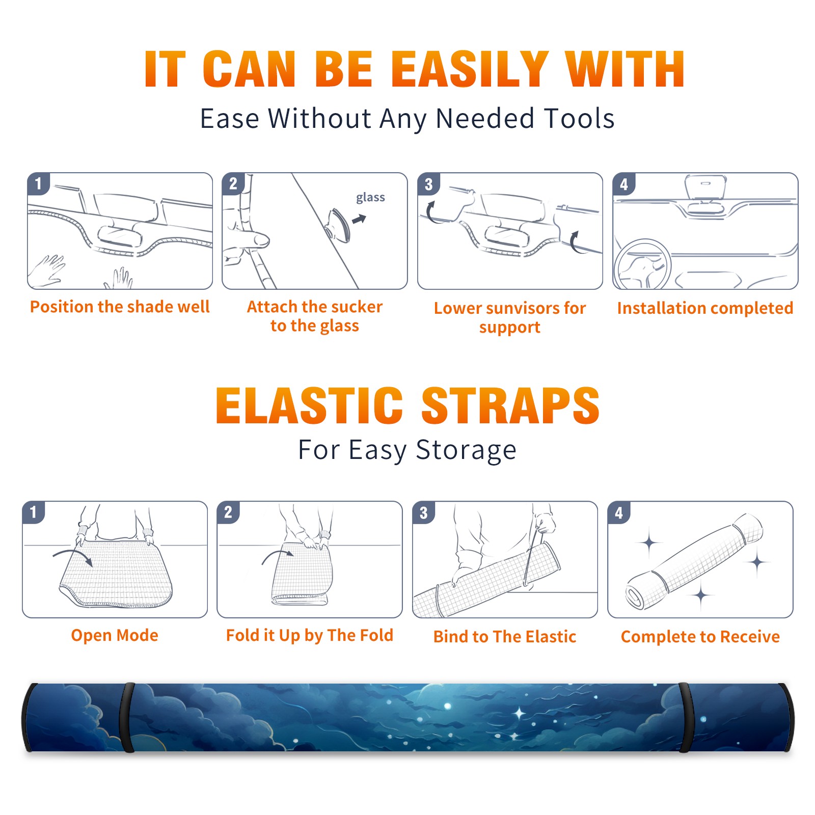 <b>ZXIVGOQFR Foldable Premium Car Windshield Sunshade is your great solution to reduce your car’s interior temperature dramatically! This is definitely a must-have item for your summer travel! </b> <br> ●<b>Size: 63"L x 33.5"W </b> <br></b> ●<b>Blocking Uv Rays & Heat Insulation<br></b> Our vehicle sunshade provides effective UV, sun, and summer heat protection .Maintains dashboards by preventing fading and cracking <br> ●<b>Easy-To-Store Folding Design Makes Storage Convenient <br></b> ZXIVGOQFR car sunshades come with removable suction cups and elastic bands that you can install easily and quickly, and the removable suction cups will not leave any marks on your windows when removed. Within seconds, windshield visor can be installed and removed. When not in use,the front windshield can be easily and effectively placed on the door pocket or the dashboard, which is beautiful and does not take up space in the car.<br> <br> <b>PUT UP A 'PROTECTIVE UMBRELLA' FOR YOUR BELOVED CAR!</b>