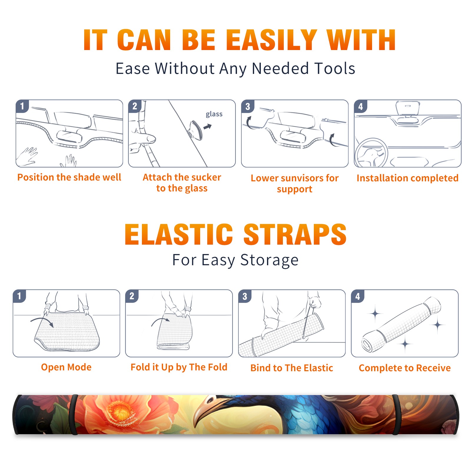• <b>ZXIVGOQFR Foldable Premium Car Windshield Sunshade is your great solution to reduce your car’s interior temperature dramatically! This is definitely a must-have item for your summer travel! </b> <br> ●<b>Size: 63"L x 33.5"W </b> <br></b> ●<b>Blocking Uv Rays & Heat Insulation<br></b> Our vehicle sunshade provides effective UV, sun, and summer heat protection .Maintains dashboards by preventing fading and cracking <br> ●<b>Easy-To-Store Folding Design Makes Storage Convenient <br></b> ZXIVGOQFR car sunshades come with removable suction cups and elastic bands that you can install easily and quickly, and the removable suction cups will not leave any marks on your windows when removed. Within seconds, windshield visor can be installed and removed. When not in use,the front windshield can be easily and effectively placed on the door pocket or the dashboard, which is beautiful and does not take up space in the car.<br> <br> <b>PUT UP A 'PROTECTIVE UMBRELLA' FOR YOUR BELOVED CAR!</b>