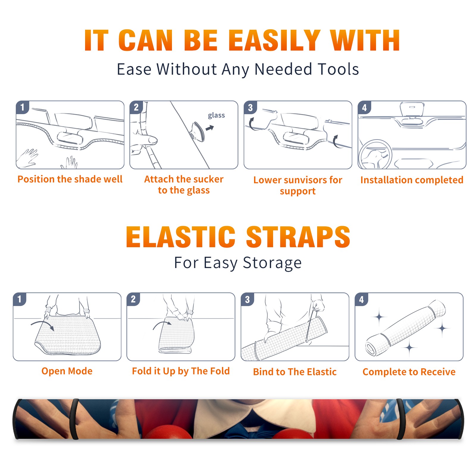 <b>ZXIVGOQFR Foldable Premium Car Windshield Sunshade is your great solution to reduce your car’s interior temperature dramatically! This is definitely a must-have item for your summer travel! </b> <br> ●<b>Size: 63"L x 33.5"W </b> <br></b> ●<b>Blocking Uv Rays & Heat Insulation<br></b> Our vehicle sunshade provides effective UV, sun, and summer heat protection .Maintains dashboards by preventing fading and cracking <br> ●<b>Easy-To-Store Folding Design Makes Storage Convenient <br></b> ZXIVGOQFR car sunshades come with removable suction cups and elastic bands that you can install easily and quickly, and the removable suction cups will not leave any marks on your windows when removed. Within seconds, windshield visor can be installed and removed. When not in use,the front windshield can be easily and effectively placed on the door pocket or the dashboard, which is beautiful and does not take up space in the car.<br> <br> <b>PUT UP A 'PROTECTIVE UMBRELLA' FOR YOUR BELOVED CAR!</b>