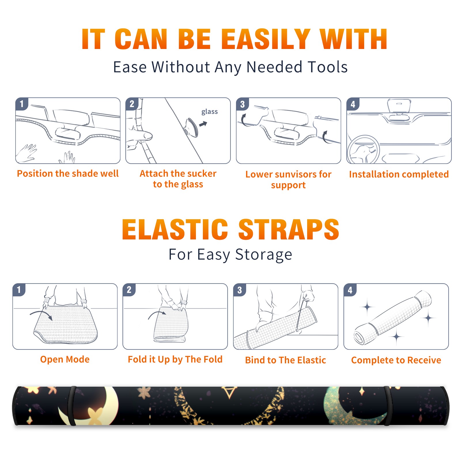 • <b>ZXIVGOQFR Foldable Premium Car Windshield Sunshade is your great solution to reduce your car’s interior temperature dramatically! This is definitely a must-have item for your summer travel! </b> <br> ●<b>Size: 63"L x 33.5"W </b> <br></b> ●<b>Blocking Uv Rays & Heat Insulation<br></b> Our vehicle sunshade provides effective UV, sun, and summer heat protection .Maintains dashboards by preventing fading and cracking <br> ●<b>Easy-To-Store Folding Design Makes Storage Convenient <br></b> ZXIVGOQFR car sunshades come with removable suction cups and elastic bands that you can install easily and quickly, and the removable suction cups will not leave any marks on your windows when removed. Within seconds, windshield visor can be installed and removed. When not in use,the front windshield can be easily and effectively placed on the door pocket or the dashboard, which is beautiful and does not take up space in the car.<br> <br> <b>PUT UP A 'PROTECTIVE UMBRELLA' FOR YOUR BELOVED CAR!</b>