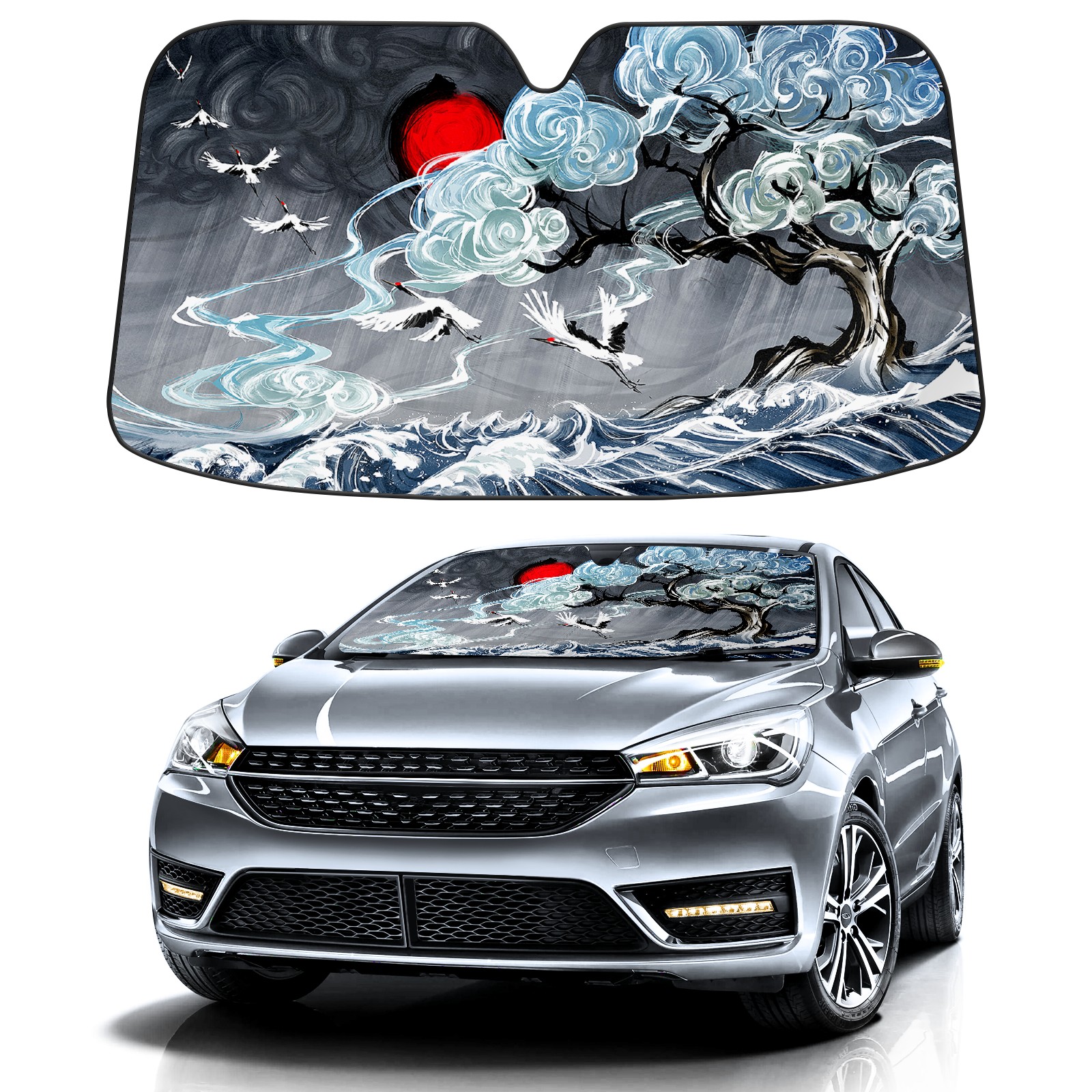Car Windshield Sun Shade for Front Window Japanese Crane Foldable Vehicle Windshield Car Sun Visor Covers Automotive Window Protector Car Privacy Sun Blocker