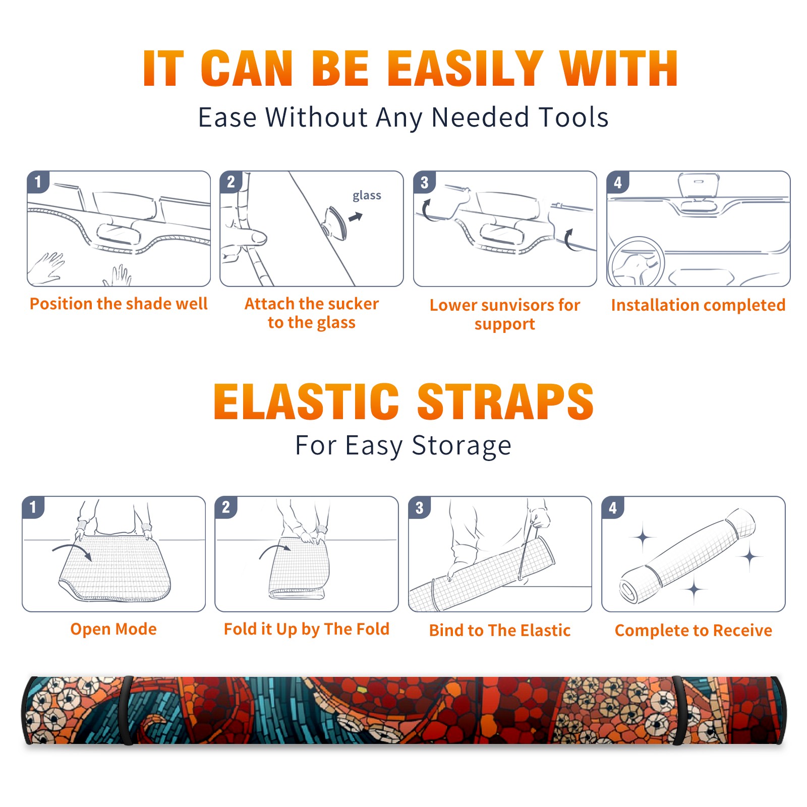 <b>ZXIVGOQFR Foldable Premium Car Windshield Sunshade is your great solution to reduce your car’s interior temperature dramatically! This is definitely a must-have item for your summer travel! </b> <br> ●<b>Size: 63"L x 33.5"W </b> <br></b> ●<b>Blocking Uv Rays & Heat Insulation<br></b> Our vehicle sunshade provides effective UV, sun, and summer heat protection .Maintains dashboards by preventing fading and cracking <br> ●<b>Easy-To-Store Folding Design Makes Storage Convenient <br></b> ZXIVGOQFR car sunshades come with removable suction cups and elastic bands that you can install easily and quickly, and the removable suction cups will not leave any marks on your windows when removed. Within seconds, windshield visor can be installed and removed. When not in use,the front windshield can be easily and effectively placed on the door pocket or the dashboard, which is beautiful and does not take up space in the car.<br> <br> <b>PUT UP A 'PROTECTIVE UMBRELLA' FOR YOUR BELOVED CAR!</b>