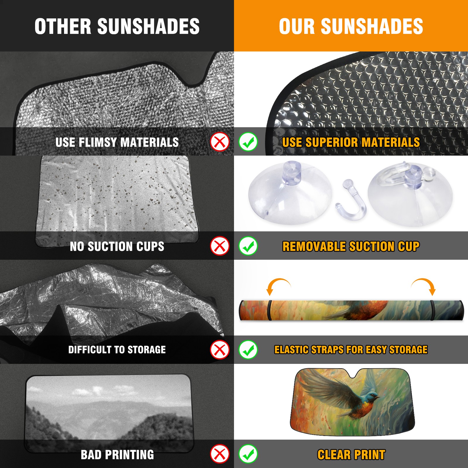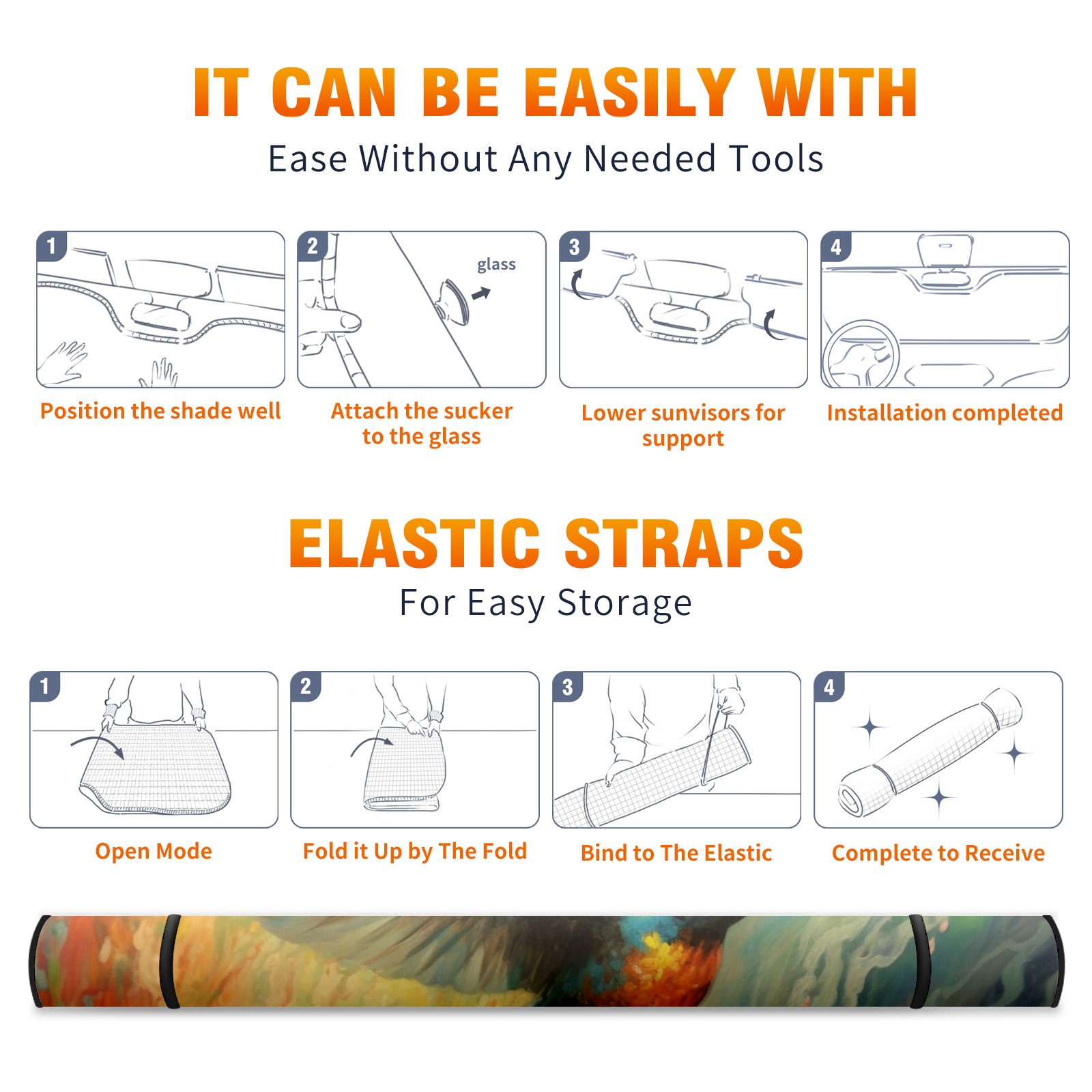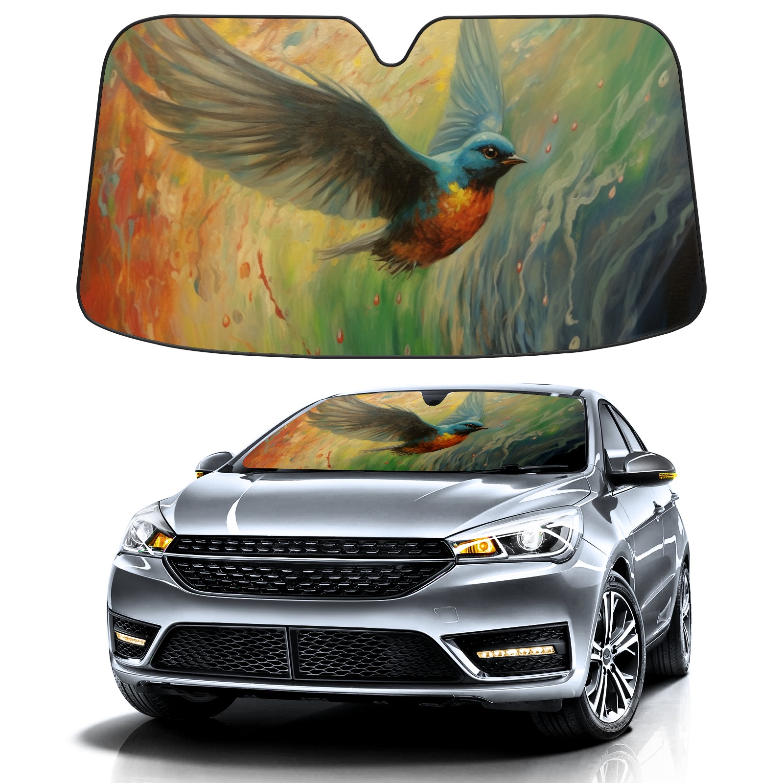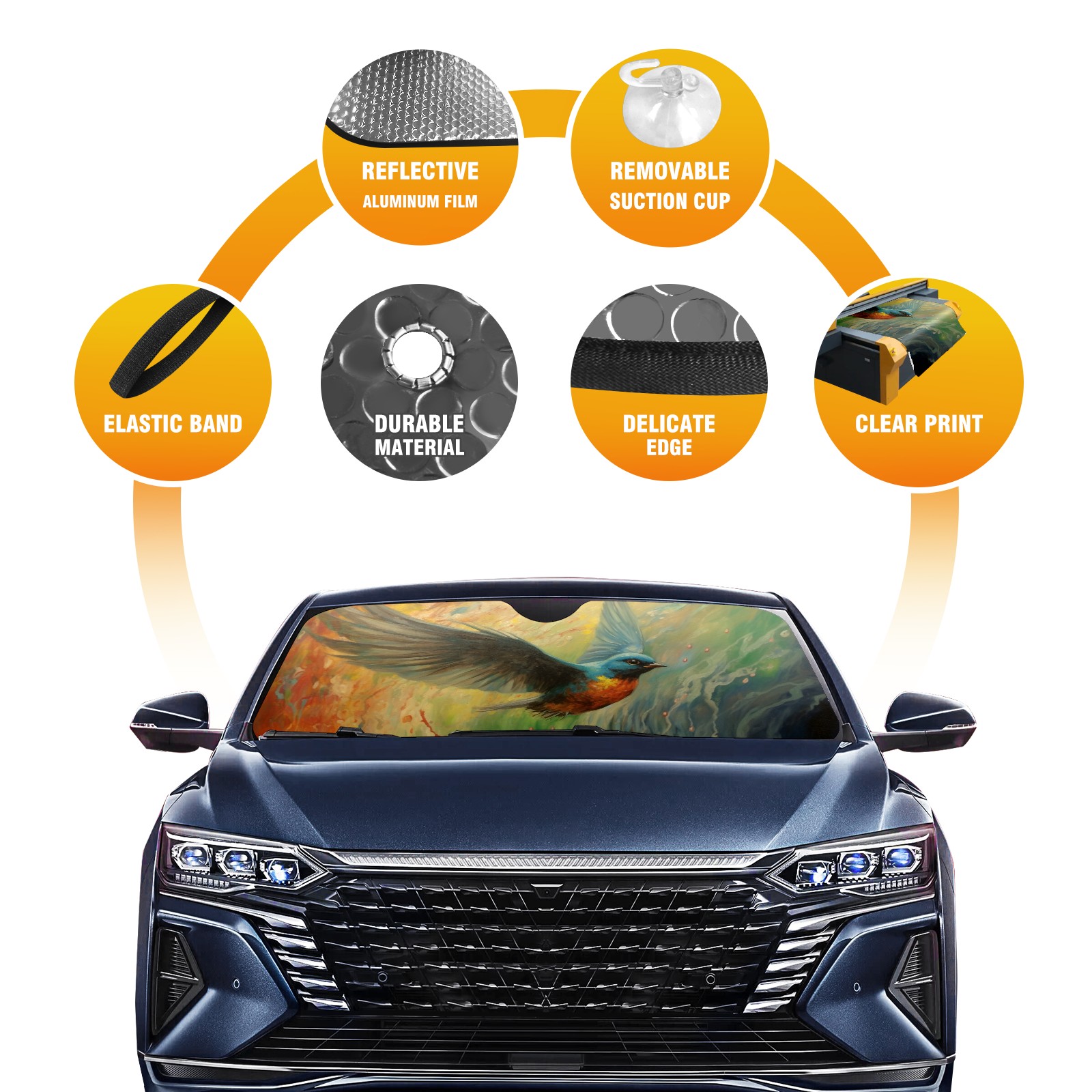 • <b>ZXIVGOQFR Foldable Premium Car Windshield Sunshade is your great solution to reduce your car’s interior temperature dramatically! This is definitely a must-have item for your summer travel! </b> <br> ●<b>Size: 63"L x 33.5"W </b> <br></b> ●<b>Blocking Uv Rays & Heat Insulation<br></b> Our vehicle sunshade provides effective UV, sun, and summer heat protection .Maintains dashboards by preventing fading and cracking <br> ●<b>Easy-To-Store Folding Design Makes Storage Convenient <br></b> ZXIVGOQFR car sunshades come with removable suction cups and elastic bands that you can install easily and quickly, and the removable suction cups will not leave any marks on your windows when removed. Within seconds, windshield visor can be installed and removed. When not in use,the front windshield can be easily and effectively placed on the door pocket or the dashboard, which is beautiful and does not take up space in the car.<br> <br> <b>PUT UP A 'PROTECTIVE UMBRELLA' FOR YOUR BELOVED CAR!</b>