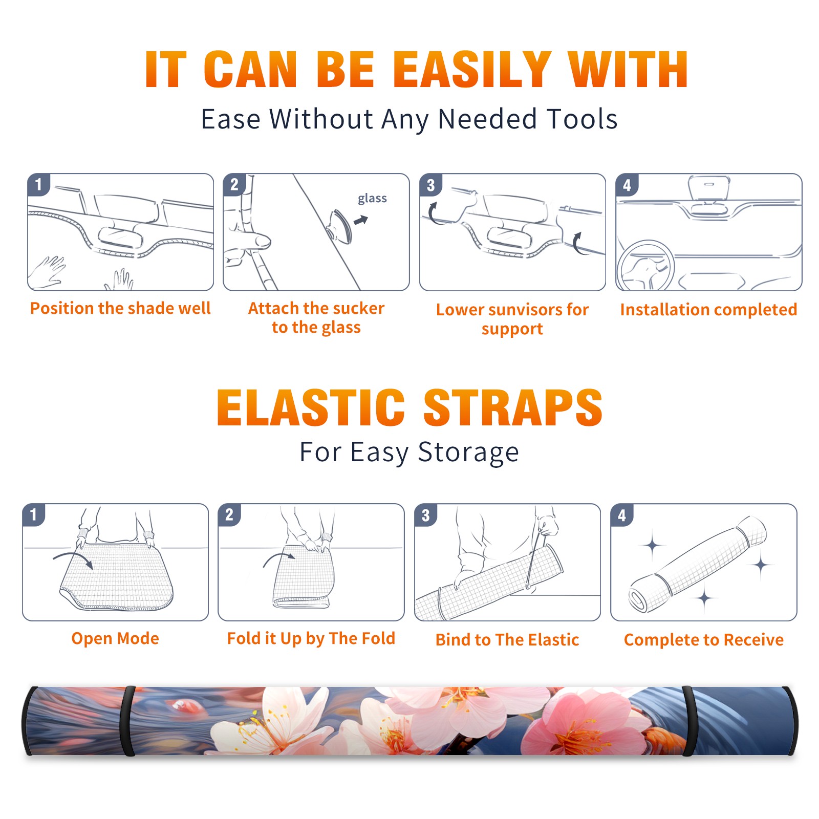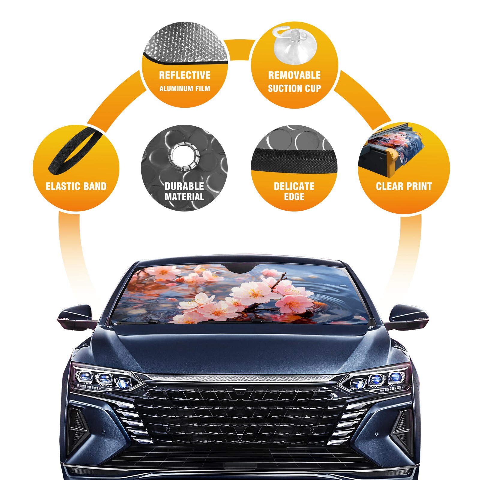 <b>ZXIVGOQFR Foldable Premium Car Windshield Sunshade is your great solution to reduce your car’s interior temperature dramatically! This is definitely a must-have item for your summer travel! </b> <br> ●<b>Size: 63"L x 33.5"W </b> <br></b> ●<b>Blocking Uv Rays & Heat Insulation<br></b> Our vehicle sunshade provides effective UV, sun, and summer heat protection .Maintains dashboards by preventing fading and cracking <br> ●<b>Easy-To-Store Folding Design Makes Storage Convenient <br></b> ZXIVGOQFR car sunshades come with removable suction cups and elastic bands that you can install easily and quickly, and the removable suction cups will not leave any marks on your windows when removed. Within seconds, windshield visor can be installed and removed. When not in use,the front windshield can be easily and effectively placed on the door pocket or the dashboard, which is beautiful and does not take up space in the car.<br> <br> <b>PUT UP A 'PROTECTIVE UMBRELLA' FOR YOUR BELOVED CAR!</b>
