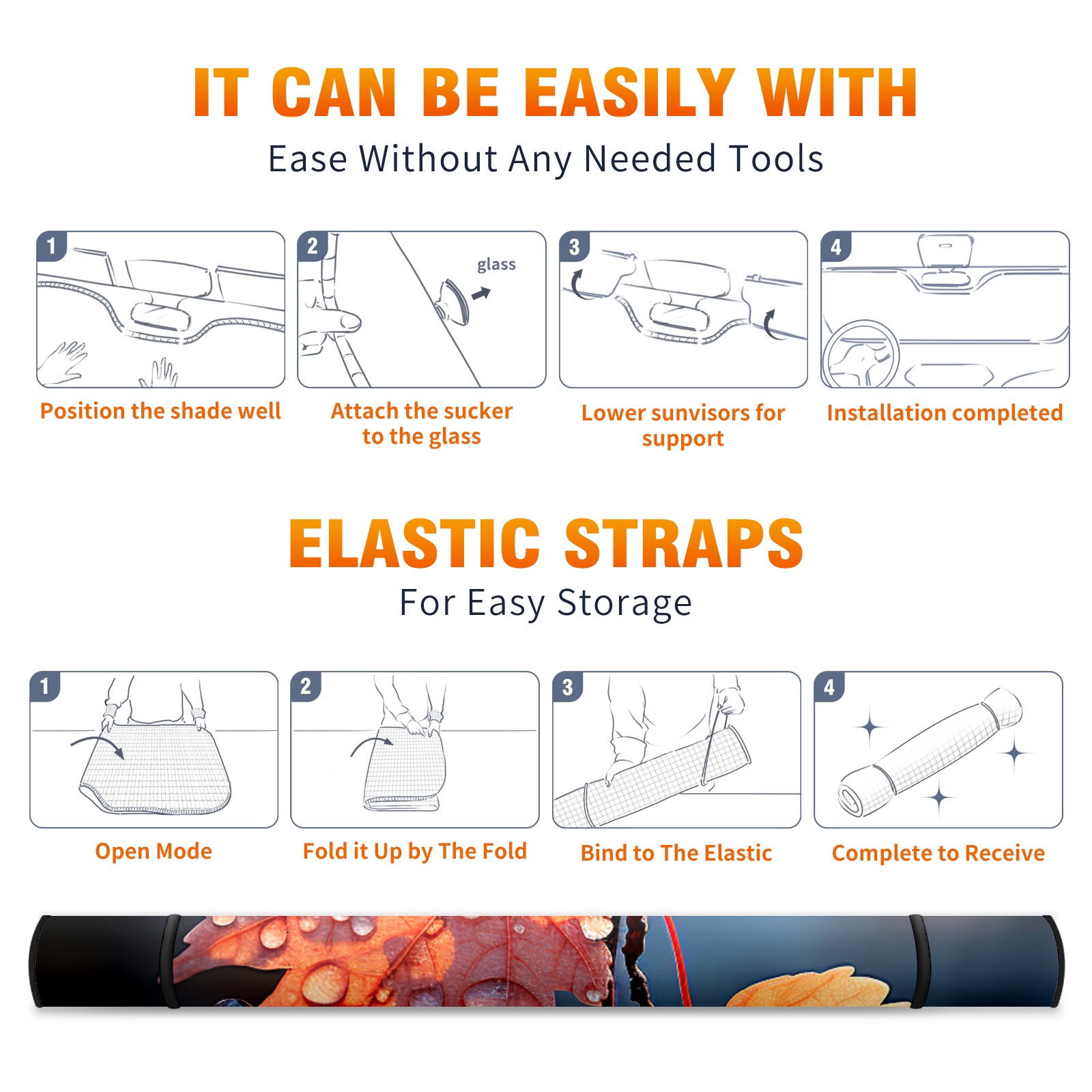 <b>ZXIVGOQFR Foldable Premium Car Windshield Sunshade is your great solution to reduce your car’s interior temperature dramatically! This is definitely a must-have item for your summer travel! </b> <br> ●<b>Size: 63"L x 33.5"W </b> <br></b> ●<b>Blocking Uv Rays & Heat Insulation<br></b> Our vehicle sunshade provides effective UV, sun, and summer heat protection .Maintains dashboards by preventing fading and cracking <br> ●<b>Easy-To-Store Folding Design Makes Storage Convenient <br></b> ZXIVGOQFR car sunshades come with removable suction cups and elastic bands that you can install easily and quickly, and the removable suction cups will not leave any marks on your windows when removed. Within seconds, windshield visor can be installed and removed. When not in use,the front windshield can be easily and effectively placed on the door pocket or the dashboard, which is beautiful and does not take up space in the car.<br> <br> <b>PUT UP A 'PROTECTIVE UMBRELLA' FOR YOUR BELOVED CAR!</b>