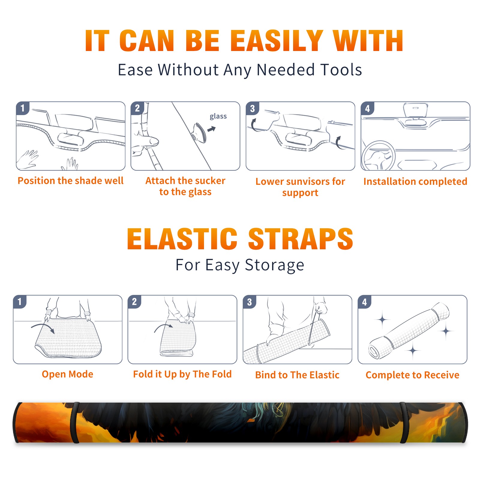 <b>ZXIVGOQFR Foldable Premium Car Windshield Sunshade is your great solution to reduce your car’s interior temperature dramatically! This is definitely a must-have item for your summer travel! </b> <br> ●<b>Size: 63"L x 33.5"W </b> <br></b> ●<b>Blocking Uv Rays & Heat Insulation<br></b> Our vehicle sunshade provides effective UV, sun, and summer heat protection .Maintains dashboards by preventing fading and cracking <br> ●<b>Easy-To-Store Folding Design Makes Storage Convenient <br></b> ZXIVGOQFR car sunshades come with removable suction cups and elastic bands that you can install easily and quickly, and the removable suction cups will not leave any marks on your windows when removed. Within seconds, windshield visor can be installed and removed. When not in use,the front windshield can be easily and effectively placed on the door pocket or the dashboard, which is beautiful and does not take up space in the car.<br> <br> <b>PUT UP A 'PROTECTIVE UMBRELLA' FOR YOUR BELOVED CAR!</b>