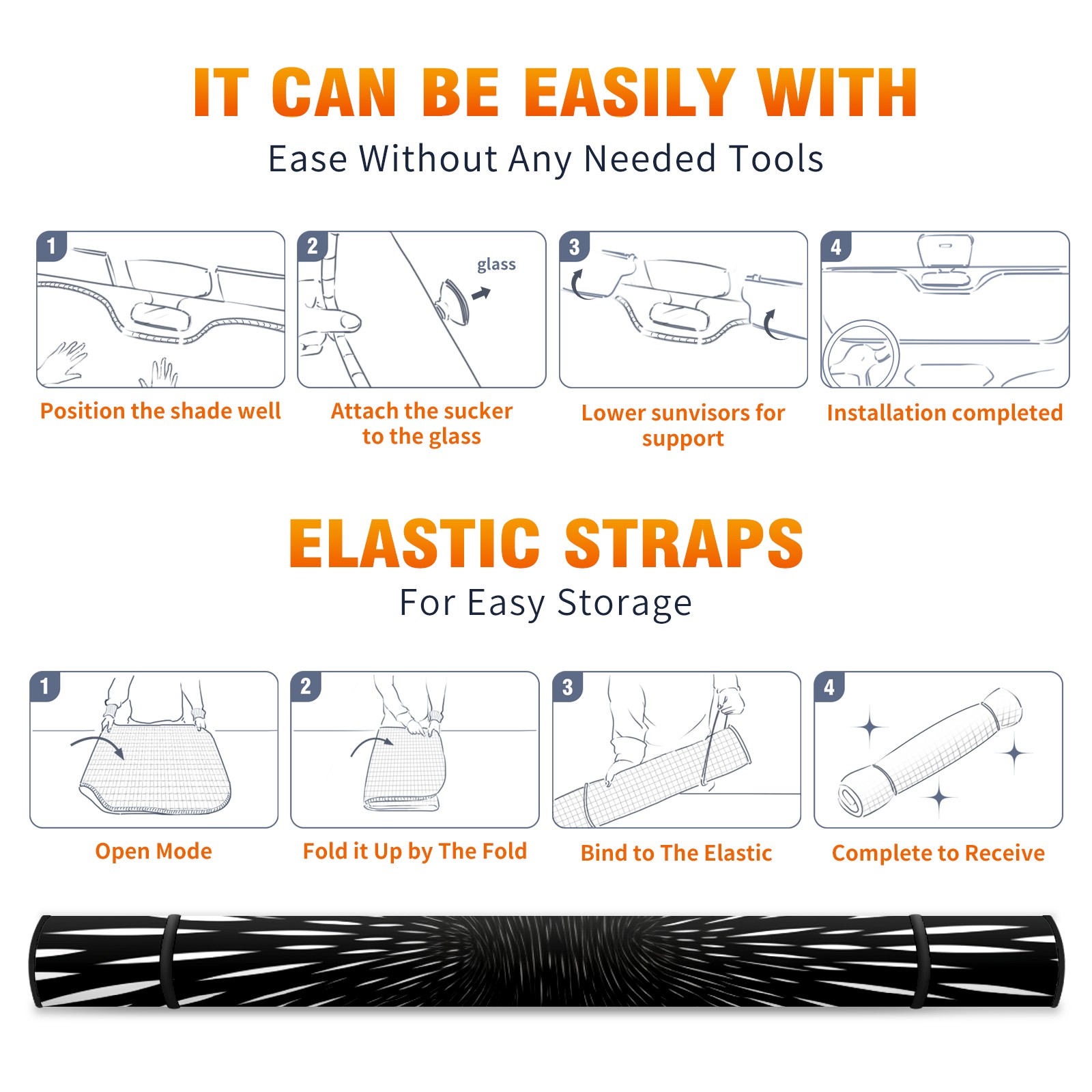 <b>ZXIVGOQFR Foldable Premium Car Windshield Sunshade is your great solution to reduce your car’s interior temperature dramatically! This is definitely a must-have item for your summer travel! </b> <br> ●<b>Size: 63"L x 33.5"W </b> <br></b> ●<b>Blocking Uv Rays & Heat Insulation<br></b> Our vehicle sunshade provides effective UV, sun, and summer heat protection .Maintains dashboards by preventing fading and cracking <br> ●<b>Easy-To-Store Folding Design Makes Storage Convenient <br></b> ZXIVGOQFR car sunshades come with removable suction cups and elastic bands that you can install easily and quickly, and the removable suction cups will not leave any marks on your windows when removed. Within seconds, windshield visor can be installed and removed. When not in use,the front windshield can be easily and effectively placed on the door pocket or the dashboard, which is beautiful and does not take up space in the car.<br> <br> <b>PUT UP A 'PROTECTIVE UMBRELLA' FOR YOUR BELOVED CAR!</b>