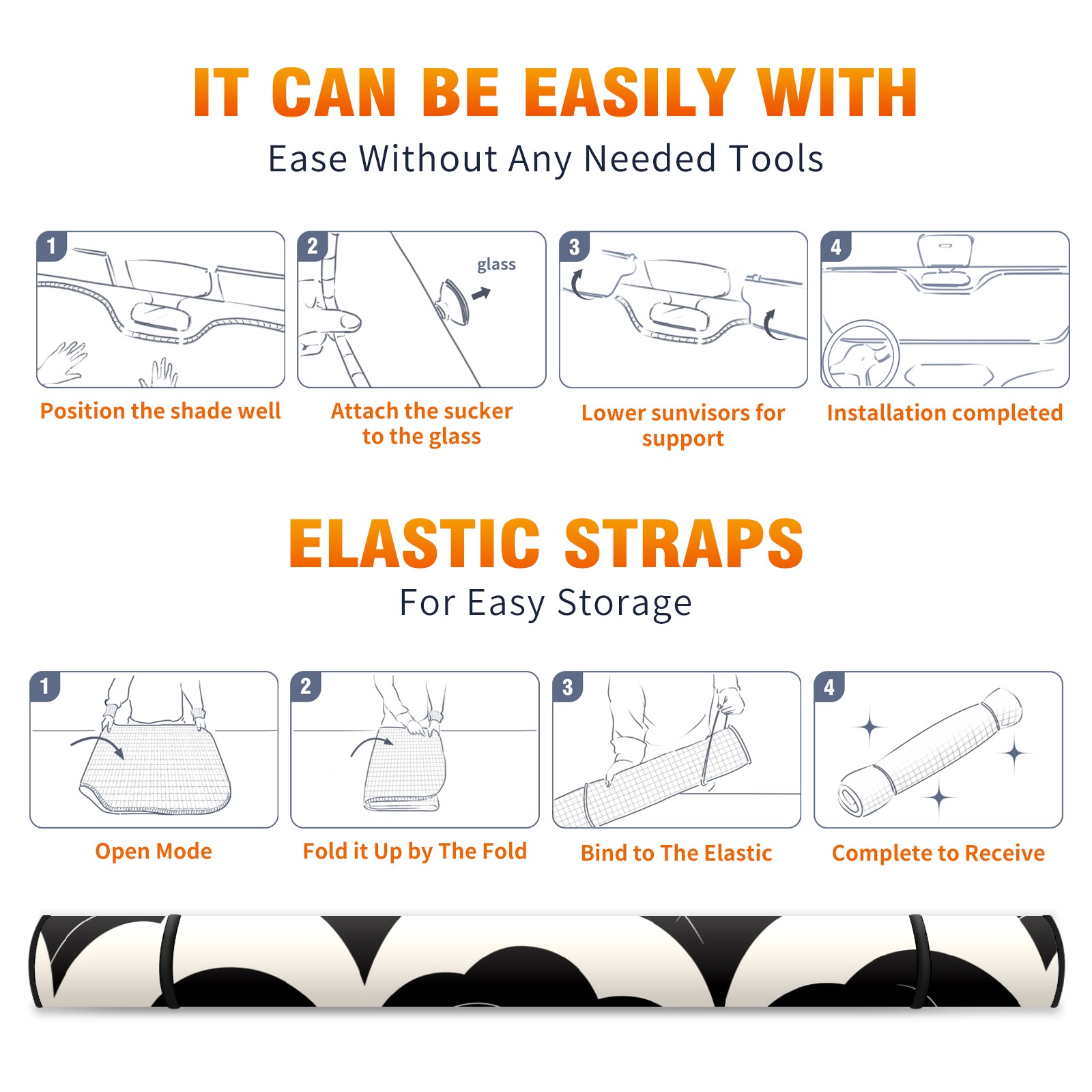 <b>ZXIVGOQFR Foldable Premium Car Windshield Sunshade is your great solution to reduce your car’s interior temperature dramatically! This is definitely a must-have item for your summer travel! </b> <br> ●<b>Size: 63"L x 33.5"W </b> <br></b> ●<b>Blocking Uv Rays & Heat Insulation<br></b> Our vehicle sunshade provides effective UV, sun, and summer heat protection .Maintains dashboards by preventing fading and cracking <br> ●<b>Easy-To-Store Folding Design Makes Storage Convenient <br></b> ZXIVGOQFR car sunshades come with removable suction cups and elastic bands that you can install easily and quickly, and the removable suction cups will not leave any marks on your windows when removed. Within seconds, windshield visor can be installed and removed. When not in use,the front windshield can be easily and effectively placed on the door pocket or the dashboard, which is beautiful and does not take up space in the car.<br> <br> <b>PUT UP A 'PROTECTIVE UMBRELLA' FOR YOUR BELOVED CAR!</b>