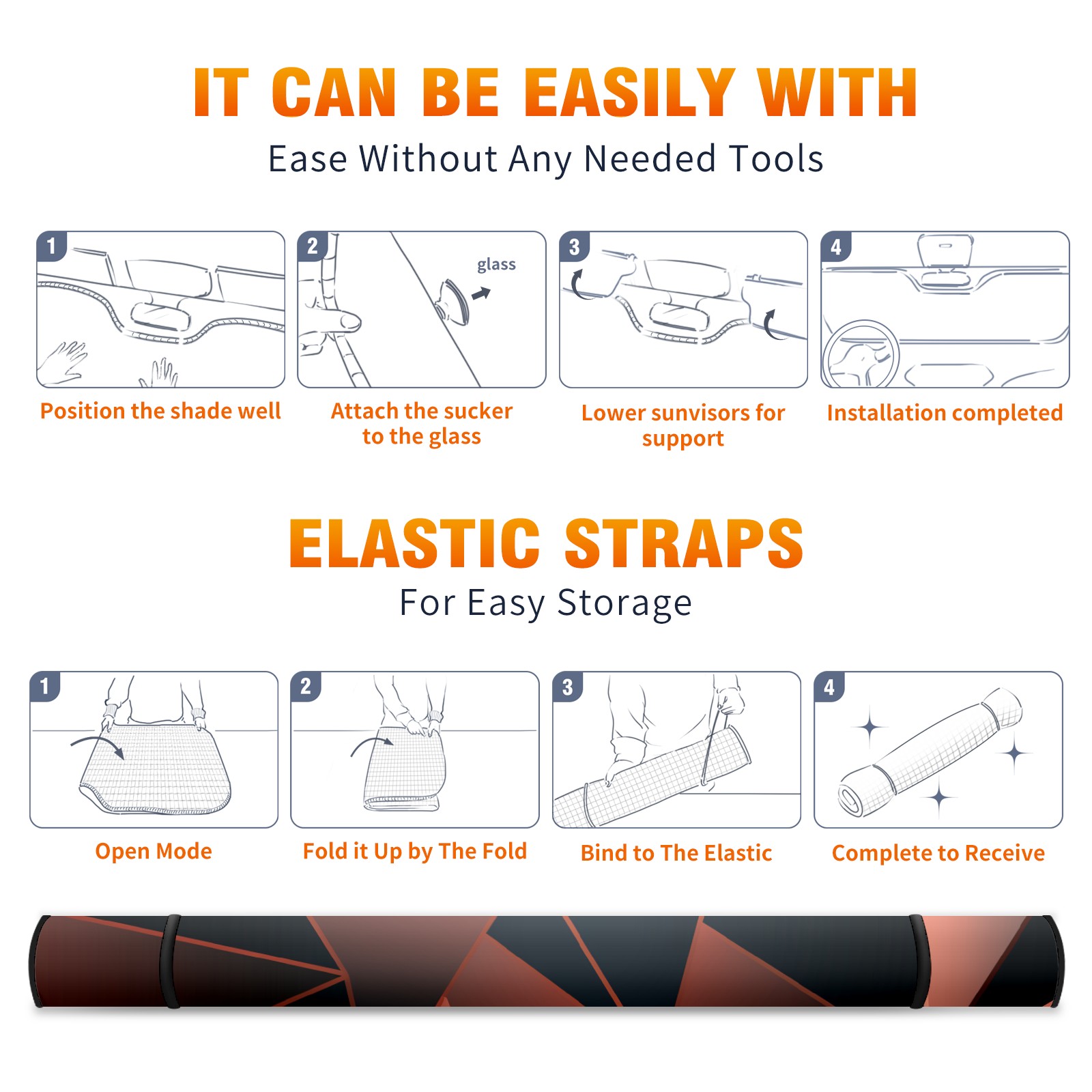 <b>ZXIVGOQFR Foldable Premium Car Windshield Sunshade is your great solution to reduce your car’s interior temperature dramatically! This is definitely a must-have item for your summer travel! </b> <br> ●<b>Size: 63"L x 33.5"W </b> <br></b> ●<b>Blocking Uv Rays & Heat Insulation<br></b> Our vehicle sunshade provides effective UV, sun, and summer heat protection .Maintains dashboards by preventing fading and cracking <br> ●<b>Easy-To-Store Folding Design Makes Storage Convenient <br></b> ZXIVGOQFR car sunshades come with removable suction cups and elastic bands that you can install easily and quickly, and the removable suction cups will not leave any marks on your windows when removed. Within seconds, windshield visor can be installed and removed. When not in use,the front windshield can be easily and effectively placed on the door pocket or the dashboard, which is beautiful and does not take up space in the car.<br> <br> <b>PUT UP A 'PROTECTIVE UMBRELLA' FOR YOUR BELOVED CAR!</b>