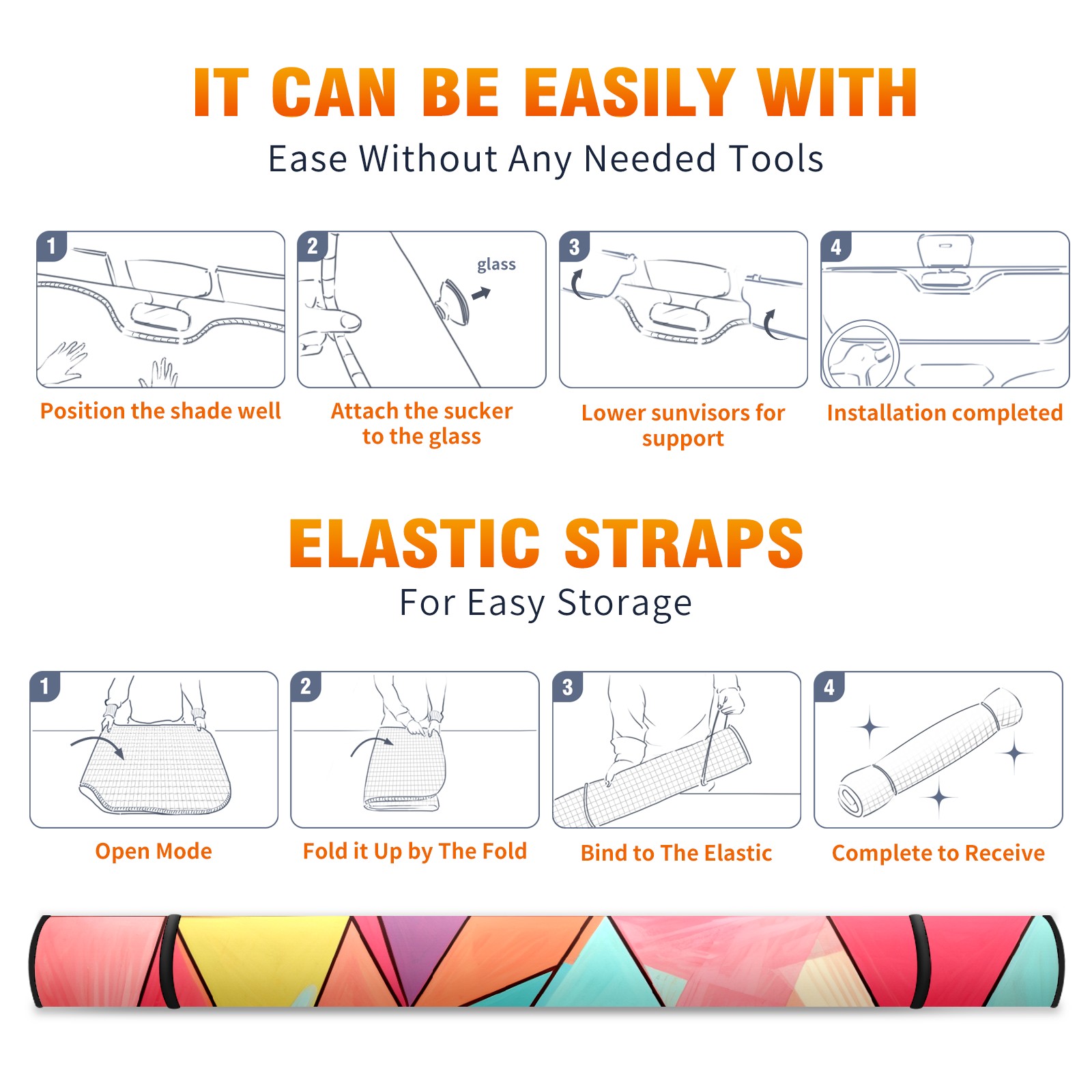 <b>ZXIVGOQFR Foldable Premium Car Windshield Sunshade is your great solution to reduce your car’s interior temperature dramatically! This is definitely a must-have item for your summer travel! </b> <br> ●<b>Size: 63"L x 33.5"W </b> <br></b> ●<b>Blocking Uv Rays & Heat Insulation<br></b> Our vehicle sunshade provides effective UV, sun, and summer heat protection .Maintains dashboards by preventing fading and cracking <br> ●<b>Easy-To-Store Folding Design Makes Storage Convenient <br></b> ZXIVGOQFR car sunshades come with removable suction cups and elastic bands that you can install easily and quickly, and the removable suction cups will not leave any marks on your windows when removed. Within seconds, windshield visor can be installed and removed. When not in use,the front windshield can be easily and effectively placed on the door pocket or the dashboard, which is beautiful and does not take up space in the car.<br> <br> <b>PUT UP A 'PROTECTIVE UMBRELLA' FOR YOUR BELOVED CAR!</b>