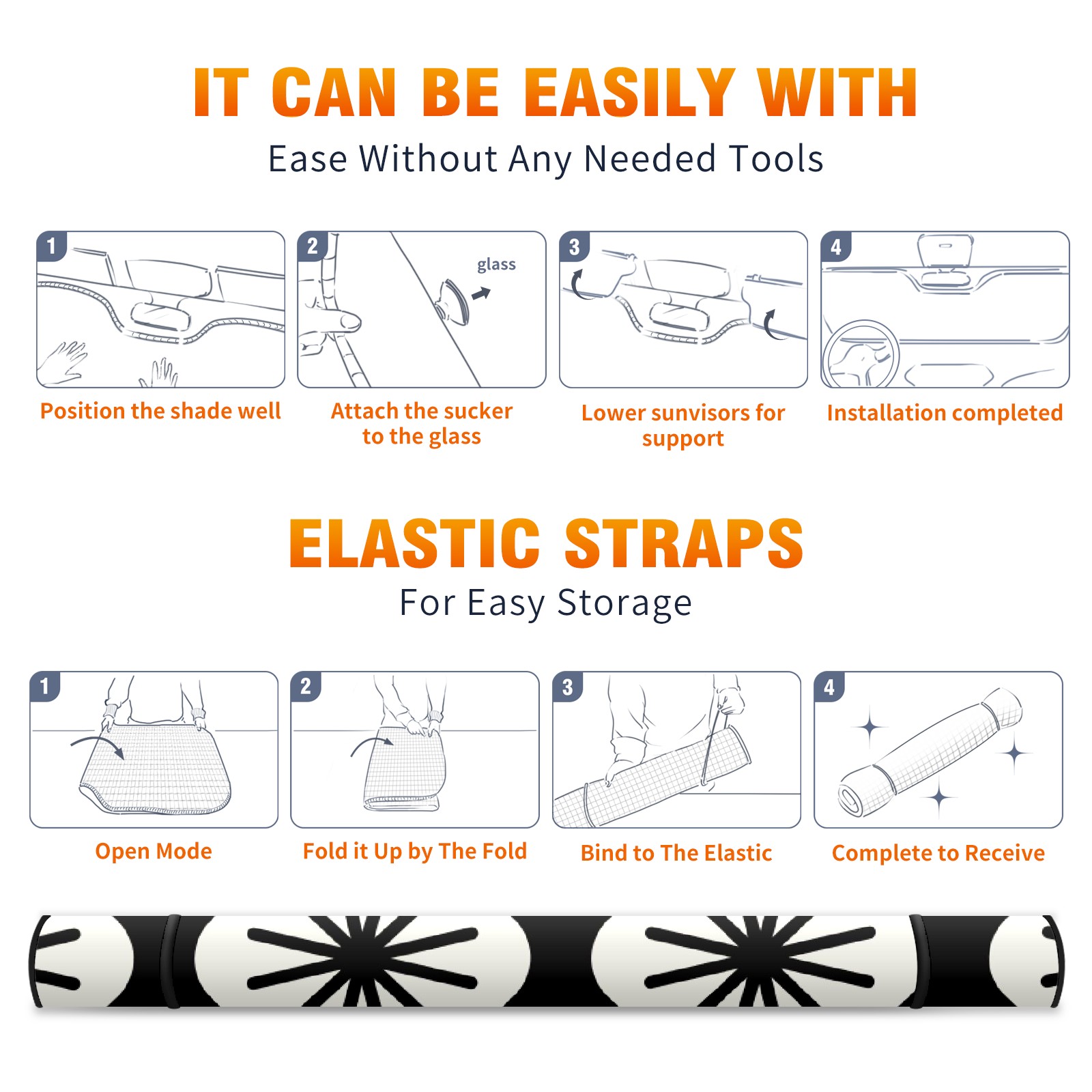 <b>ZXIVGOQFR Foldable Premium Car Windshield Sunshade is your great solution to reduce your car’s interior temperature dramatically! This is definitely a must-have item for your summer travel! </b> <br> ●<b>Size: 63"L x 33.5"W </b> <br></b> ●<b>Blocking Uv Rays & Heat Insulation<br></b> Our vehicle sunshade provides effective UV, sun, and summer heat protection .Maintains dashboards by preventing fading and cracking <br> ●<b>Easy-To-Store Folding Design Makes Storage Convenient <br></b> ZXIVGOQFR car sunshades come with removable suction cups and elastic bands that you can install easily and quickly, and the removable suction cups will not leave any marks on your windows when removed. Within seconds, windshield visor can be installed and removed. When not in use,the front windshield can be easily and effectively placed on the door pocket or the dashboard, which is beautiful and does not take up space in the car.<br> <br> <b>PUT UP A 'PROTECTIVE UMBRELLA' FOR YOUR BELOVED CAR!</b>