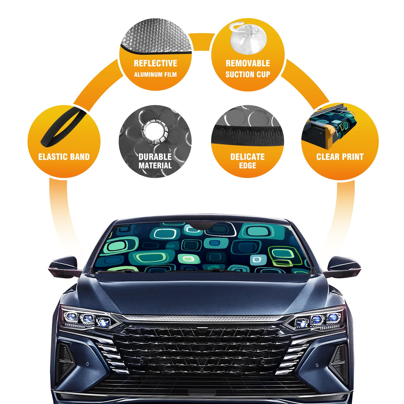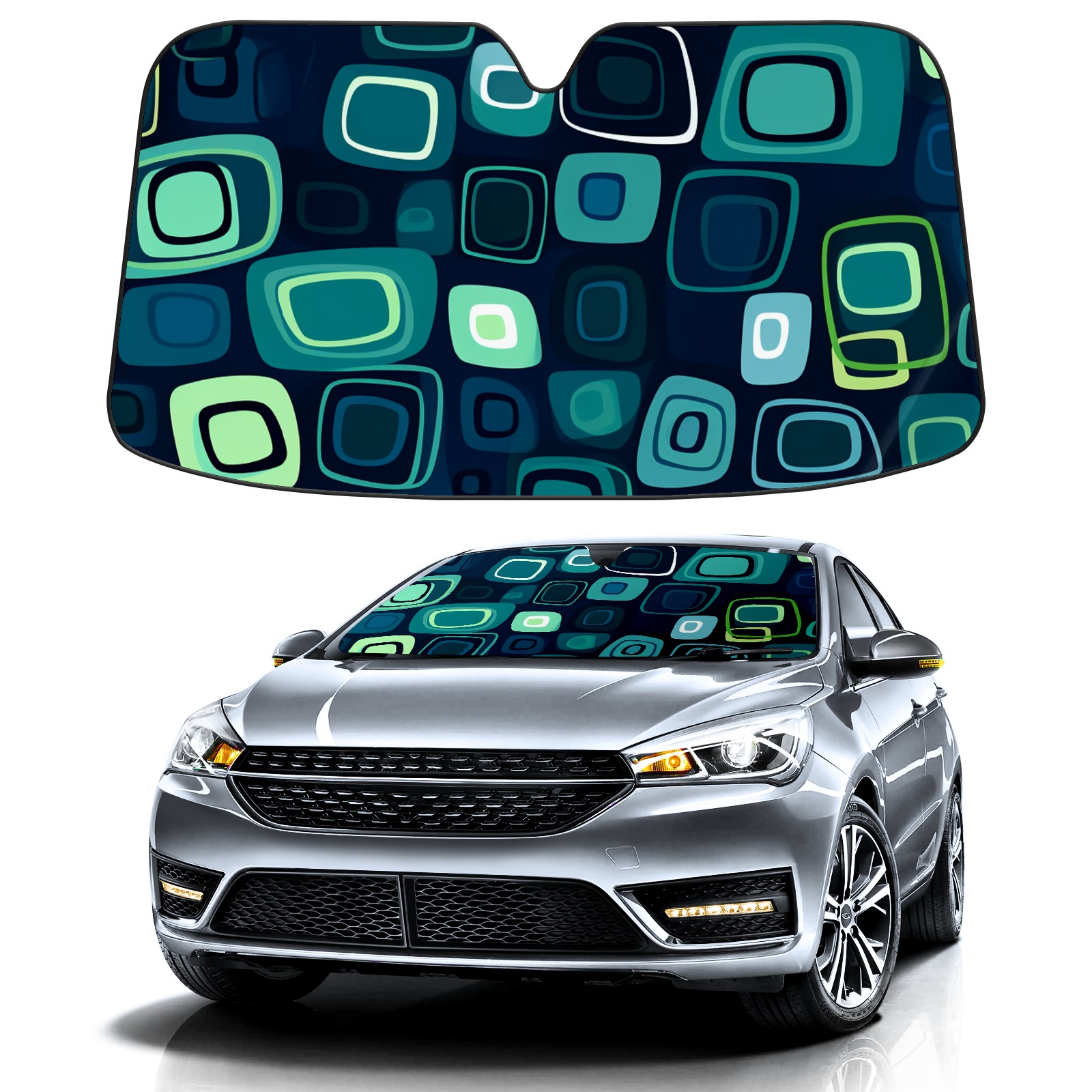 Car Windshield Sun Shade for Front Window Blue Squares And Circles (7) Foldable Vehicle Windshield Car Sun Visor Covers Automotive Window Protector Car Privacy Sun Blocker