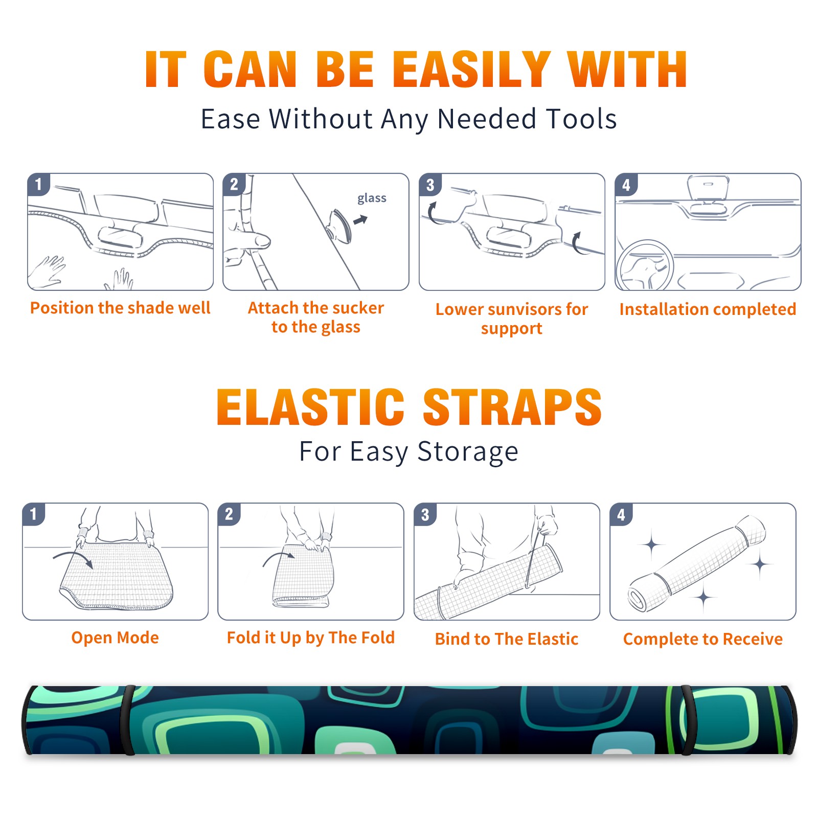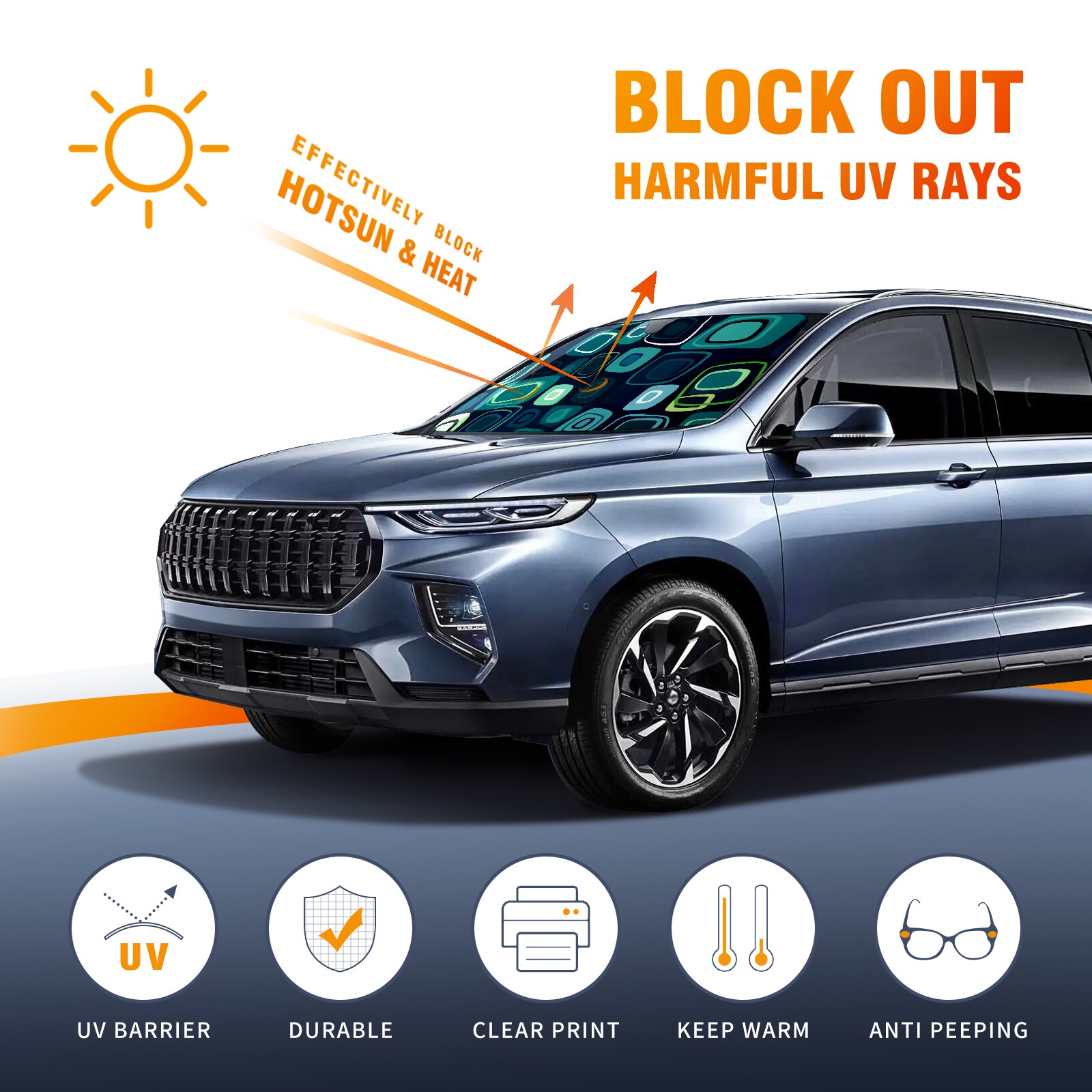 • <b>ZXIVGOQFR Foldable Premium Car Windshield Sunshade is your great solution to reduce your car’s interior temperature dramatically! This is definitely a must-have item for your summer travel! </b> <br> ●<b>Size: 63"L x 33.5"W </b> <br></b> ●<b>Blocking Uv Rays & Heat Insulation<br></b> Our vehicle sunshade provides effective UV, sun, and summer heat protection .Maintains dashboards by preventing fading and cracking <br> ●<b>Easy-To-Store Folding Design Makes Storage Convenient <br></b> ZXIVGOQFR car sunshades come with removable suction cups and elastic bands that you can install easily and quickly, and the removable suction cups will not leave any marks on your windows when removed. Within seconds, windshield visor can be installed and removed. When not in use,the front windshield can be easily and effectively placed on the door pocket or the dashboard, which is beautiful and does not take up space in the car.<br> <br> <b>PUT UP A 'PROTECTIVE UMBRELLA' FOR YOUR BELOVED CAR!</b>