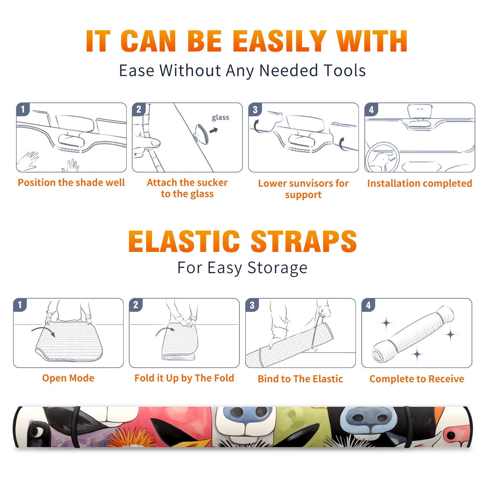 <b>ZXIVGOQFR Foldable Premium Car Windshield Sunshade is your great solution to reduce your car’s interior temperature dramatically! This is definitely a must-have item for your summer travel! </b> <br> ●<b>Size: 63"L x 33.5"W </b> <br></b> ●<b>Blocking Uv Rays & Heat Insulation<br></b> Our vehicle sunshade provides effective UV, sun, and summer heat protection .Maintains dashboards by preventing fading and cracking <br> ●<b>Easy-To-Store Folding Design Makes Storage Convenient <br></b> ZXIVGOQFR car sunshades come with removable suction cups and elastic bands that you can install easily and quickly, and the removable suction cups will not leave any marks on your windows when removed. Within seconds, windshield visor can be installed and removed. When not in use,the front windshield can be easily and effectively placed on the door pocket or the dashboard, which is beautiful and does not take up space in the car.<br> <br> <b>PUT UP A 'PROTECTIVE UMBRELLA' FOR YOUR BELOVED CAR!</b>
