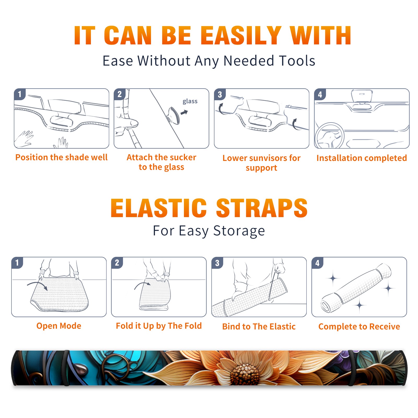 • <b>ZXIVGOQFR Foldable Premium Car Windshield Sunshade is your great solution to reduce your car’s interior temperature dramatically! This is definitely a must-have item for your summer travel! </b> <br> ●<b>Size: 63"L x 33.5"W </b> <br></b> ●<b>Blocking Uv Rays & Heat Insulation<br></b> Our vehicle sunshade provides effective UV, sun, and summer heat protection .Maintains dashboards by preventing fading and cracking <br> ●<b>Easy-To-Store Folding Design Makes Storage Convenient <br></b> ZXIVGOQFR car sunshades come with removable suction cups and elastic bands that you can install easily and quickly, and the removable suction cups will not leave any marks on your windows when removed. Within seconds, windshield visor can be installed and removed. When not in use,the front windshield can be easily and effectively placed on the door pocket or the dashboard, which is beautiful and does not take up space in the car.<br> <br> <b>PUT UP A 'PROTECTIVE UMBRELLA' FOR YOUR BELOVED CAR!</b>