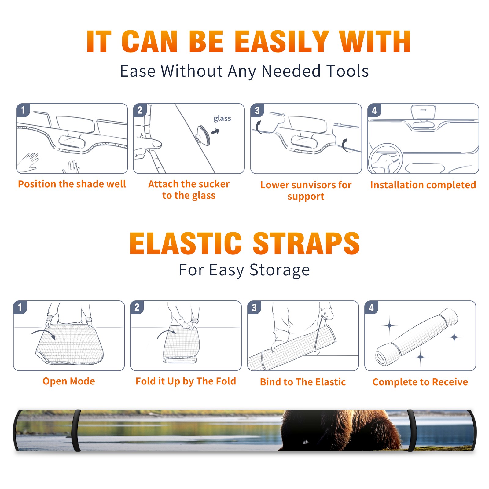 • <b>ZXIVGOQFR Foldable Premium Car Windshield Sunshade is your great solution to reduce your car’s interior temperature dramatically! This is definitely a must-have item for your summer travel! </b> <br> ●<b>Size: 63"L x 33.5"W </b> <br></b> ●<b>Blocking Uv Rays & Heat Insulation<br></b> Our vehicle sunshade provides effective UV, sun, and summer heat protection .Maintains dashboards by preventing fading and cracking <br> ●<b>Easy-To-Store Folding Design Makes Storage Convenient <br></b> ZXIVGOQFR car sunshades come with removable suction cups and elastic bands that you can install easily and quickly, and the removable suction cups will not leave any marks on your windows when removed. Within seconds, windshield visor can be installed and removed. When not in use,the front windshield can be easily and effectively placed on the door pocket or the dashboard, which is beautiful and does not take up space in the car.<br> <br> <b>PUT UP A 'PROTECTIVE UMBRELLA' FOR YOUR BELOVED CAR!</b>