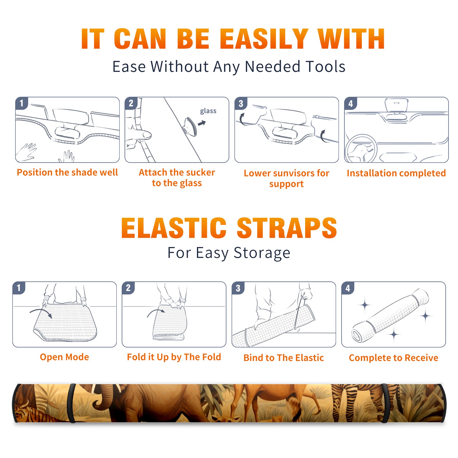 <b>ZXIVGOQFR Foldable Premium Car Windshield Sunshade is your great solution to reduce your car’s interior temperature dramatically! This is definitely a must-have item for your summer travel! </b> <br> ●<b>Size: 63"L x 33.5"W </b> <br></b> ●<b>Blocking Uv Rays & Heat Insulation<br></b> Our vehicle sunshade provides effective UV, sun, and summer heat protection .Maintains dashboards by preventing fading and cracking <br> ●<b>Easy-To-Store Folding Design Makes Storage Convenient <br></b> ZXIVGOQFR car sunshades come with removable suction cups and elastic bands that you can install easily and quickly, and the removable suction cups will not leave any marks on your windows when removed. Within seconds, windshield visor can be installed and removed. When not in use,the front windshield can be easily and effectively placed on the door pocket or the dashboard, which is beautiful and does not take up space in the car.<br> <br> <b>PUT UP A 'PROTECTIVE UMBRELLA' FOR YOUR BELOVED CAR!</b>
