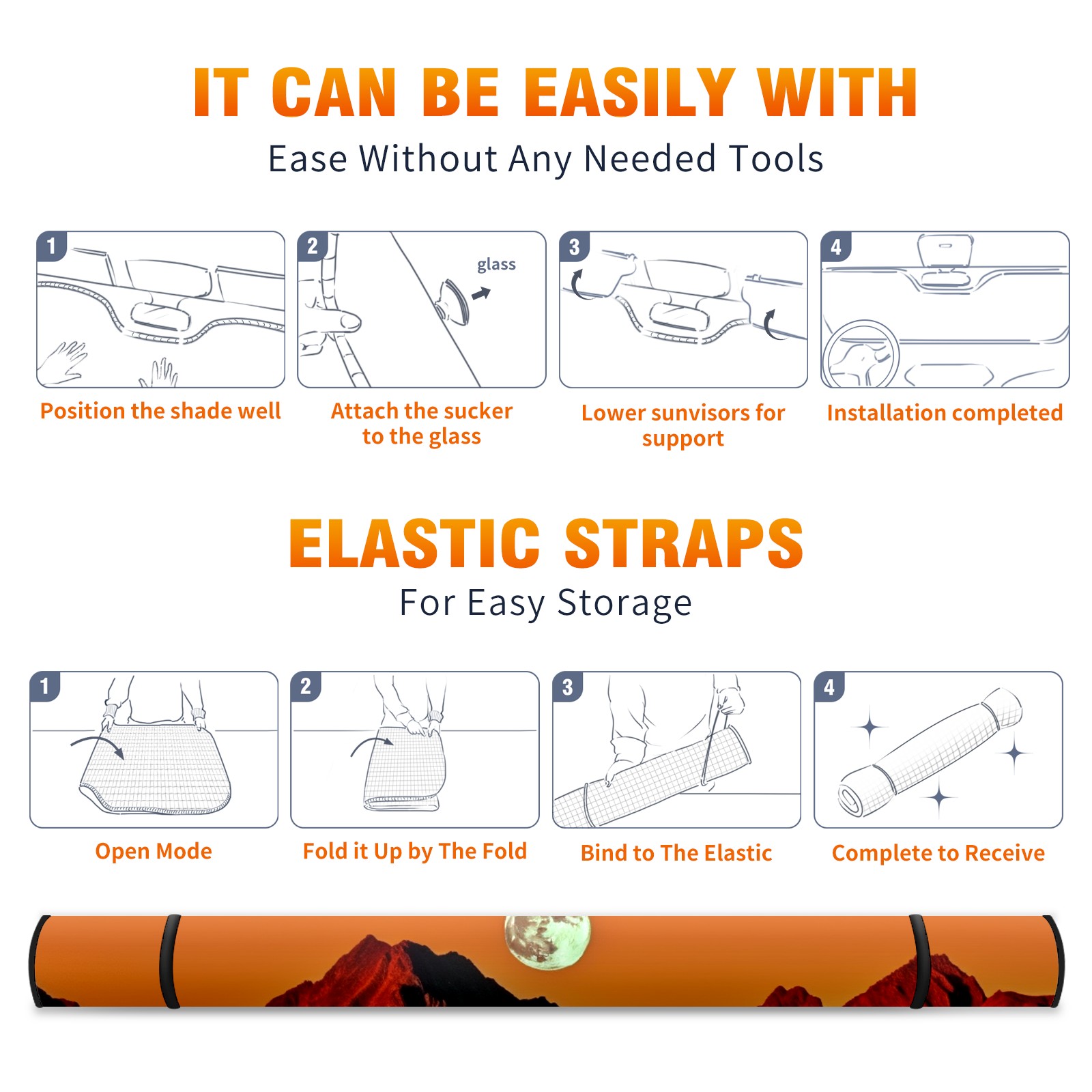 • <b>ZXIVGOQFR Foldable Premium Car Windshield Sunshade is your great solution to reduce your car’s interior temperature dramatically! This is definitely a must-have item for your summer travel! </b> <br> ●<b>Size: 63"L x 33.5"W </b> <br></b> ●<b>Blocking Uv Rays & Heat Insulation<br></b> Our vehicle sunshade provides effective UV, sun, and summer heat protection .Maintains dashboards by preventing fading and cracking <br> ●<b>Easy-To-Store Folding Design Makes Storage Convenient <br></b> ZXIVGOQFR car sunshades come with removable suction cups and elastic bands that you can install easily and quickly, and the removable suction cups will not leave any marks on your windows when removed. Within seconds, windshield visor can be installed and removed. When not in use,the front windshield can be easily and effectively placed on the door pocket or the dashboard, which is beautiful and does not take up space in the car.<br> <br> <b>PUT UP A 'PROTECTIVE UMBRELLA' FOR YOUR BELOVED CAR!</b>