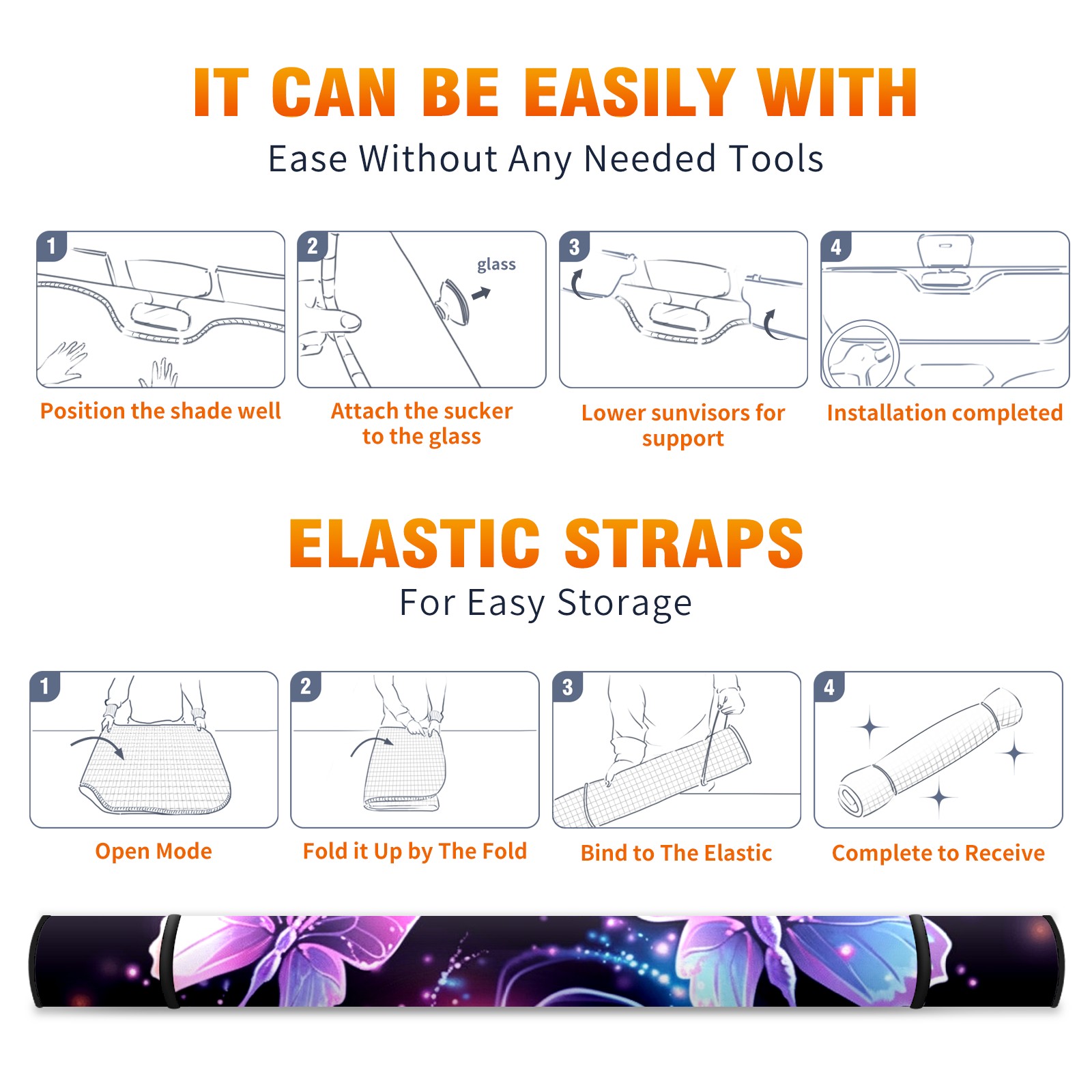 • <b>ZXIVGOQFR Foldable Premium Car Windshield Sunshade is your great solution to reduce your car’s interior temperature dramatically! This is definitely a must-have item for your summer travel! </b> <br> ●<b>Size: 63"L x 33.5"W </b> <br></b> ●<b>Blocking Uv Rays & Heat Insulation<br></b> Our vehicle sunshade provides effective UV, sun, and summer heat protection .Maintains dashboards by preventing fading and cracking <br> ●<b>Easy-To-Store Folding Design Makes Storage Convenient <br></b> ZXIVGOQFR car sunshades come with removable suction cups and elastic bands that you can install easily and quickly, and the removable suction cups will not leave any marks on your windows when removed. Within seconds, windshield visor can be installed and removed. When not in use,the front windshield can be easily and effectively placed on the door pocket or the dashboard, which is beautiful and does not take up space in the car.<br> <br> <b>PUT UP A 'PROTECTIVE UMBRELLA' FOR YOUR BELOVED CAR!</b>