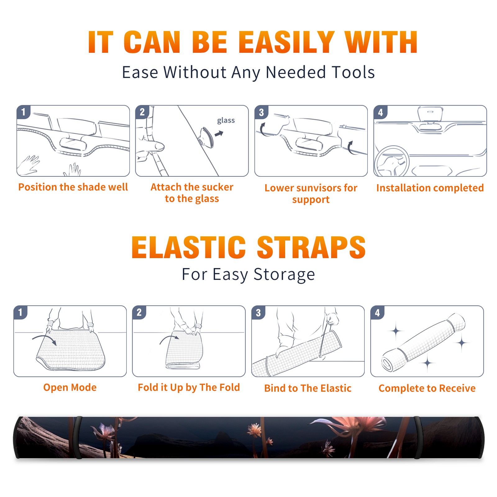 <b>ZXIVGOQFR Foldable Premium Car Windshield Sunshade is your great solution to reduce your car’s interior temperature dramatically! This is definitely a must-have item for your summer travel! </b> <br> ●<b>Size: 63"L x 33.5"W </b> <br></b> ●<b>Blocking Uv Rays & Heat Insulation<br></b> Our vehicle sunshade provides effective UV, sun, and summer heat protection .Maintains dashboards by preventing fading and cracking <br> ●<b>Easy-To-Store Folding Design Makes Storage Convenient <br></b> ZXIVGOQFR car sunshades come with removable suction cups and elastic bands that you can install easily and quickly, and the removable suction cups will not leave any marks on your windows when removed. Within seconds, windshield visor can be installed and removed. When not in use,the front windshield can be easily and effectively placed on the door pocket or the dashboard, which is beautiful and does not take up space in the car.<br> <br> <b>PUT UP A 'PROTECTIVE UMBRELLA' FOR YOUR BELOVED CAR!</b>