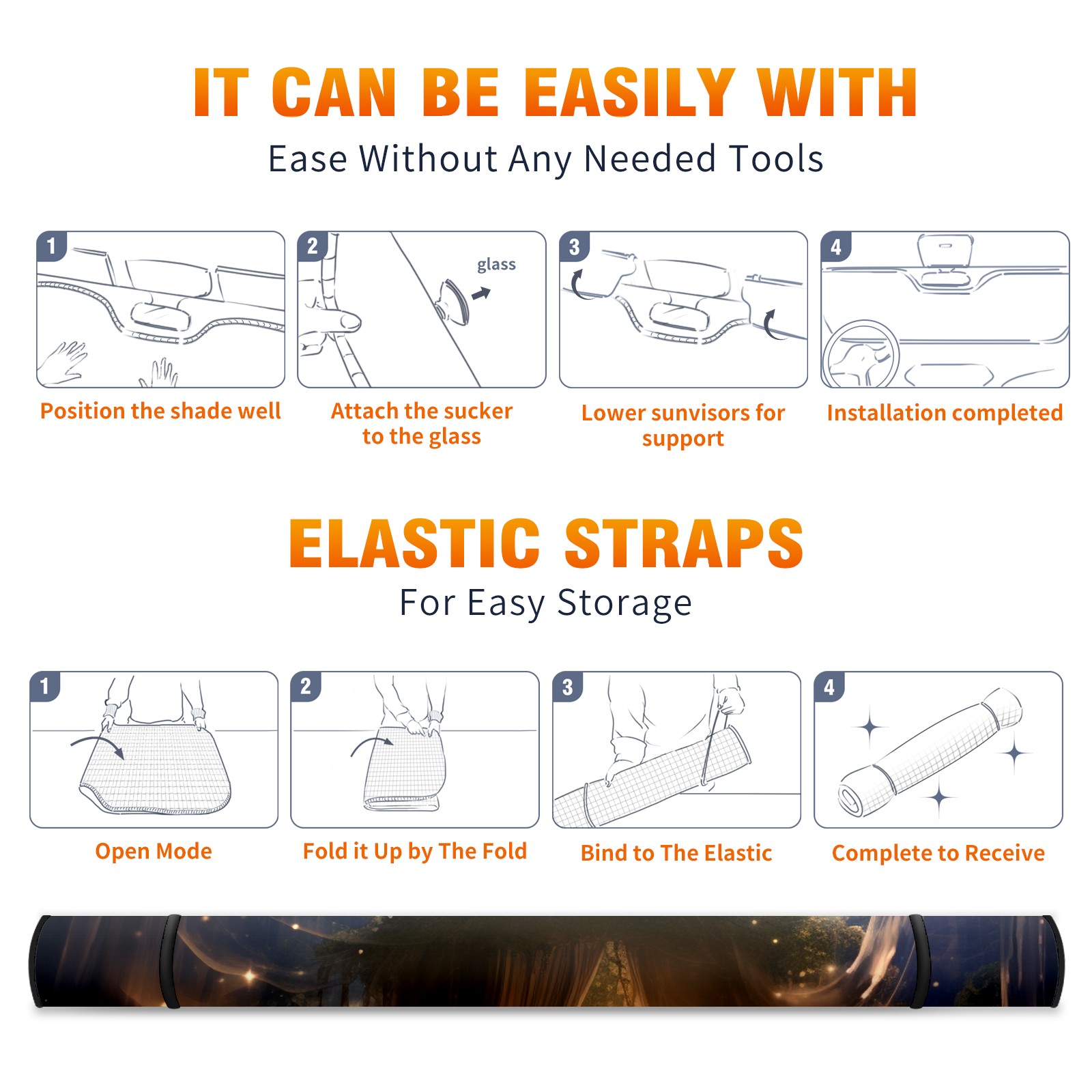 <b>ZXIVGOQFR Foldable Premium Car Windshield Sunshade is your great solution to reduce your car’s interior temperature dramatically! This is definitely a must-have item for your summer travel! </b> <br> ●<b>Size: 63"L x 33.5"W </b> <br></b> ●<b>Blocking Uv Rays & Heat Insulation<br></b> Our vehicle sunshade provides effective UV, sun, and summer heat protection .Maintains dashboards by preventing fading and cracking <br> ●<b>Easy-To-Store Folding Design Makes Storage Convenient <br></b> ZXIVGOQFR car sunshades come with removable suction cups and elastic bands that you can install easily and quickly, and the removable suction cups will not leave any marks on your windows when removed. Within seconds, windshield visor can be installed and removed. When not in use,the front windshield can be easily and effectively placed on the door pocket or the dashboard, which is beautiful and does not take up space in the car.<br> <br> <b>PUT UP A 'PROTECTIVE UMBRELLA' FOR YOUR BELOVED CAR!</b>