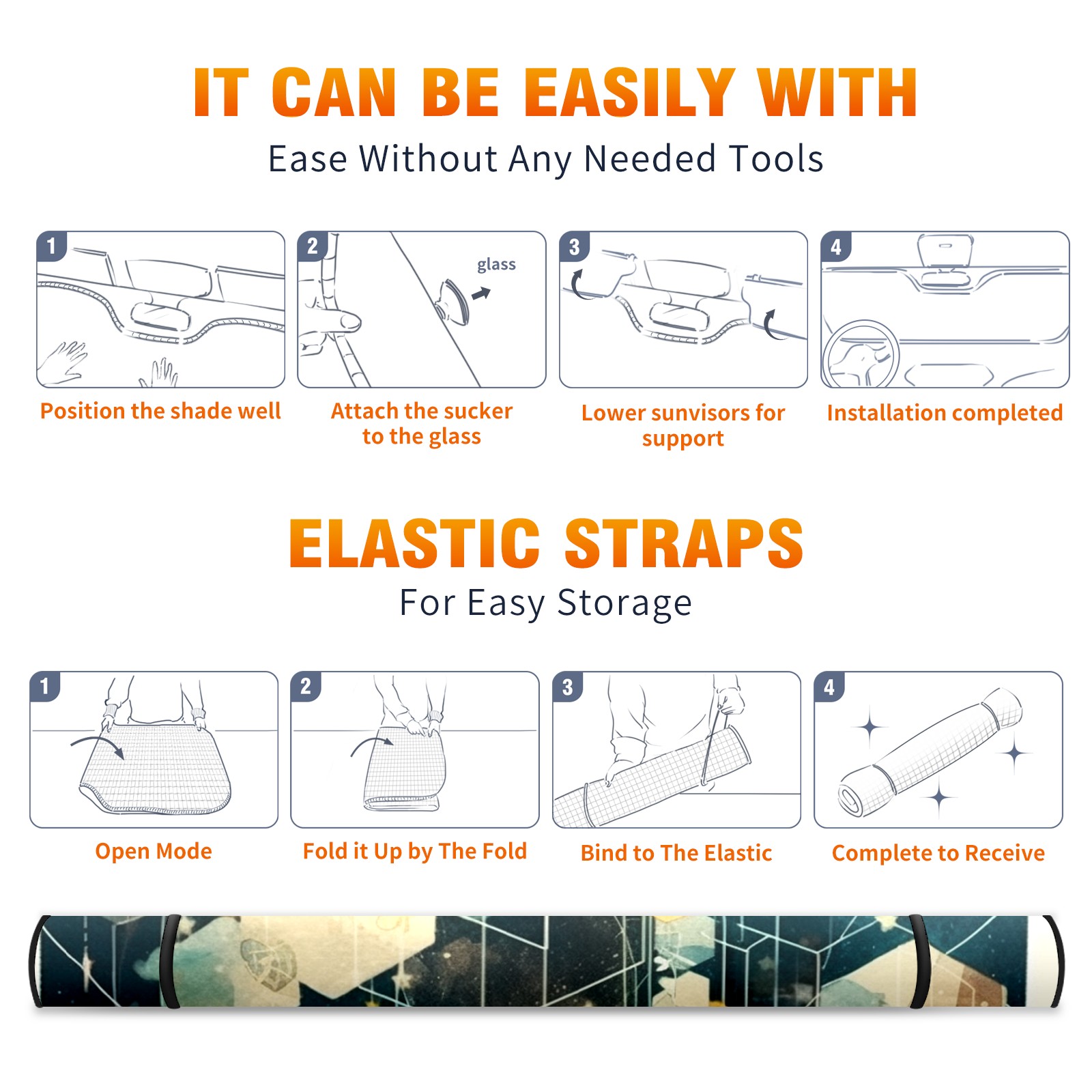 <b>ZXIVGOQFR Foldable Premium Car Windshield Sunshade is your great solution to reduce your car’s interior temperature dramatically! This is definitely a must-have item for your summer travel! </b> <br> ●<b>Size: 63"L x 33.5"W </b> <br></b> ●<b>Blocking Uv Rays & Heat Insulation<br></b> Our vehicle sunshade provides effective UV, sun, and summer heat protection .Maintains dashboards by preventing fading and cracking <br> ●<b>Easy-To-Store Folding Design Makes Storage Convenient <br></b> ZXIVGOQFR car sunshades come with removable suction cups and elastic bands that you can install easily and quickly, and the removable suction cups will not leave any marks on your windows when removed. Within seconds, windshield visor can be installed and removed. When not in use,the front windshield can be easily and effectively placed on the door pocket or the dashboard, which is beautiful and does not take up space in the car.<br> <br> <b>PUT UP A 'PROTECTIVE UMBRELLA' FOR YOUR BELOVED CAR!</b>